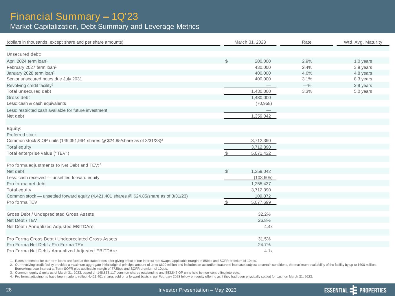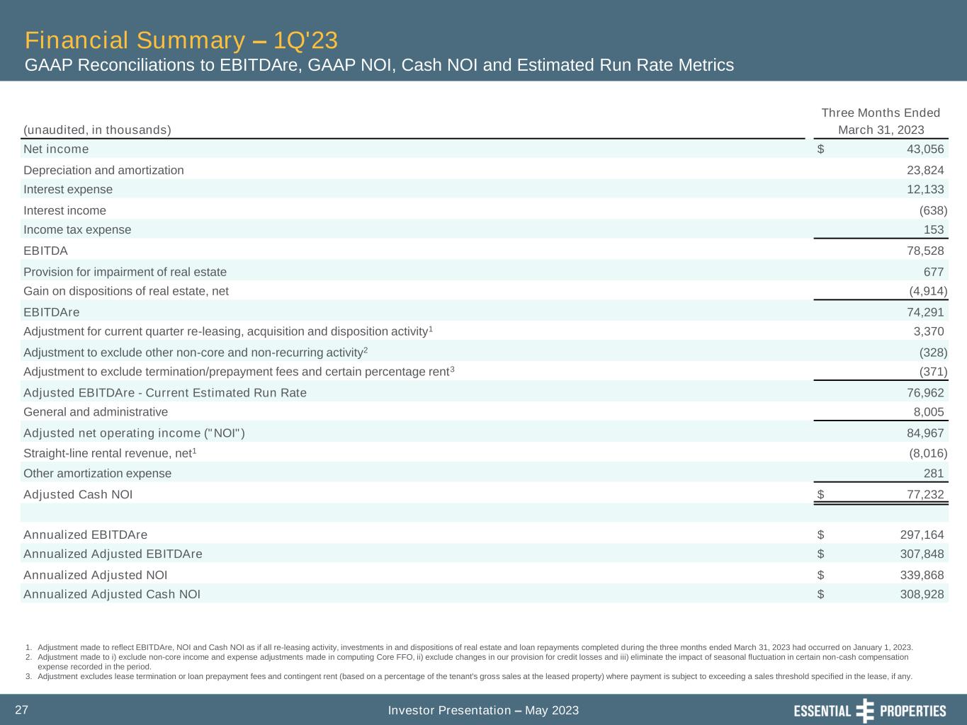 Investor Presentation – May 202327 Financial Summary – 1Q'23 GAAP Reconciliations to EBITDAre, GAAP NOI, Cash NOI and Estimated Run Rate Metrics 1. Adjustment made to reflect EBITDAre, NOI and Cash NOI as if all re-leasing activity, investments in and dispositions of real estate and loan repayments completed during the three months ended March 31, 2023 had occurred on January 1, 2023. 2. Adjustment made to i) exclude non-core income and expense adjustments made in computing Core FFO, ii) exclude changes in our provision for credit losses and iii) eliminate the impact of seasonal fluctuation in certain non-cash compensation expense recorded in the period. 3. Adjustment excludes lease termination or loan prepayment fees and contingent rent (based on a percentage of the tenant's gross sales at the leased property) where payment is subject to exceeding a sales threshold specified in the lease, if any. Three Months Ended (unaudited, in thousands) March 31, 2023 Net income $ 43,056 Depreciation and amortization 23,824 Interest expense 12,133 Interest income (638) Income tax expense 153 EBITDA 78,528 Provision for impairment of real estate 677 Gain on dispositions of real estate, net (4,914) EBITDAre 74,291 Adjustment for current quarter re-leasing, acquisition and disposition activity1 3,370 Adjustment to exclude other non-core and non-recurring activity2 (328) Adjustment to exclude termination/prepayment fees and certain percentage rent3 (371) Adjusted EBITDAre - Current Estimated Run Rate 76,962 General and administrative 8,005 Adjusted net operating income ("NOI") 84,967 Straight-line rental revenue, net1 (8,016) Other amortization expense 281 Adjusted Cash NOI $ 77,232 Annualized EBITDAre $ 297,164 Annualized Adjusted EBITDAre $ 307,848 Annualized Adjusted NOI $ 339,868 Annualized Adjusted Cash NOI $ 308,928