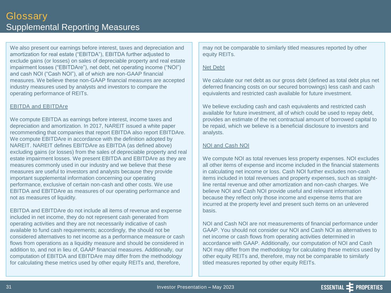 Investor Presentation – May 202330 Glossary Supplemental Reporting Measures FFO, Core FFO and AFFO Our reported results are presented in accordance with U.S. generally accepted accounting principles ("GAAP"). We also disclose funds from operations (“FFO”), core funds from operations (“Core FFO”) and adjusted funds from operations (“AFFO”), each of which is a non-GAAP financial measures. We believe these non-GAAP financial measures are industry measures used by analysts and investors to compare the operating performance of REITs. We compute FFO in accordance with the definition adopted by the Board of Governors of the National Association of Real Estate Investment Trusts ("NAREIT"). NAREIT defines FFO as GAAP net income or loss adjusted to exclude extraordinary items (as defined by GAAP), net gain or loss from sales of depreciable real estate assets, impairment write-downs associated with depreciable real estate assets and real estate-related depreciation and amortization (excluding amortization of deferred financing costs and depreciation of non-real estate assets), including the pro rata share of such adjustments of unconsolidated subsidiaries. FFO is used by management, and may be useful to investors and analysts, to facilitate meaningful comparisons of operating performance between periods and among our peers primarily because it excludes the effect of real estate depreciation and amortization and net gains and losses on sales (which are dependent on historical costs and implicitly assume that the value of real estate diminishes predictably over time, rather than fluctuating based on existing market conditions). We compute Core FFO by adjusting FFO, as defined by NAREIT, to exclude certain GAAP income and expense amounts that we believe are infrequent and unusual in nature and/or not related to our core real estate operations. Exclusion of these items from similar FFO-type metrics is common within the equity REIT industry, and management believes that presentation of Core FFO provides investors with a metric to assist in their evaluation of our operating performance across multiple periods and in comparison to the operating performance of our peers, because it removes the effect of unusual items that are not expected to impact our operating performance on an ongoing basis. Core FFO is used by management in evaluating the performance of our core business operations. Items included in calculating FFO that may be excluded in calculating Core FFO include items like certain transaction related gains, losses, income or expense or other non-core amounts as they occur. To derive AFFO, we modify the NAREIT computation of FFO to include other adjustments to GAAP net income related to certain items that we believe are not indicative of our operating performance, including straight- line rental revenue, non-cash interest expense, non-cash compensation expense, other amortization and non-cash charges, capitalized interest expense and transaction costs. Such items may cause short-term fluctuations in net income but have no impact on operating cash flows or long-term operating performance. We believe that AFFO is an additional useful supplemental measure for investors to consider to assess our operating performance without the distortions created by non-cash and certain other revenues and expenses. FFO, Core FFO and AFFO do not include all items of revenue and expense included in net income, they do not represent cash generated from operating activities, and they are not necessarily indicative of cash available to fund cash requirements; accordingly, they should not be considered alternatives to net income as a performance measure or cash flows from operations as a liquidity measure and should be considered in addition to, and not in lieu of, GAAP financial measures. Additionally, our computation of FFO, Core FFO and AFFO may differ from the methodology for calculating these metrics used by other equity REITs and, therefore, may not be comparable to similarly titled measures reported by other equity REITs.