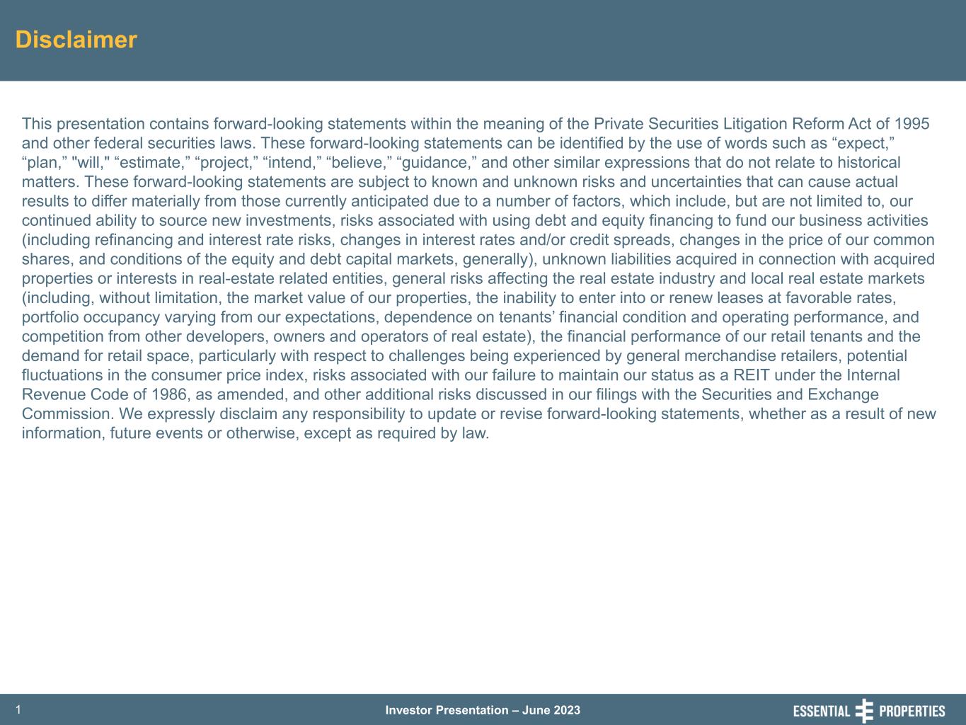 Investor Presentation – June 20231 Disclaimer This presentation contains forward-looking statements within the meaning of the Private Securities Litigation Reform Act of 1995 and other federal securities laws. These forward-looking statements can be identified by the use of words such as “expect,” “plan,” "will," “estimate,” “project,” “intend,” “believe,” “guidance,” and other similar expressions that do not relate to historical matters. These forward-looking statements are subject to known and unknown risks and uncertainties that can cause actual results to differ materially from those currently anticipated due to a number of factors, which include, but are not limited to, our continued ability to source new investments, risks associated with using debt and equity financing to fund our business activities (including refinancing and interest rate risks, changes in interest rates and/or credit spreads, changes in the price of our common shares, and conditions of the equity and debt capital markets, generally), unknown liabilities acquired in connection with acquired properties or interests in real-estate related entities, general risks affecting the real estate industry and local real estate markets (including, without limitation, the market value of our properties, the inability to enter into or renew leases at favorable rates, portfolio occupancy varying from our expectations, dependence on tenants’ financial condition and operating performance, and competition from other developers, owners and operators of real estate), the financial performance of our retail tenants and the demand for retail space, particularly with respect to challenges being experienced by general merchandise retailers, potential fluctuations in the consumer price index, risks associated with our failure to maintain our status as a REIT under the Internal Revenue Code of 1986, as amended, and other additional risks discussed in our filings with the Securities and Exchange Commission. We expressly disclaim any responsibility to update or revise forward-looking statements, whether as a result of new information, future events or otherwise, except as required by law.