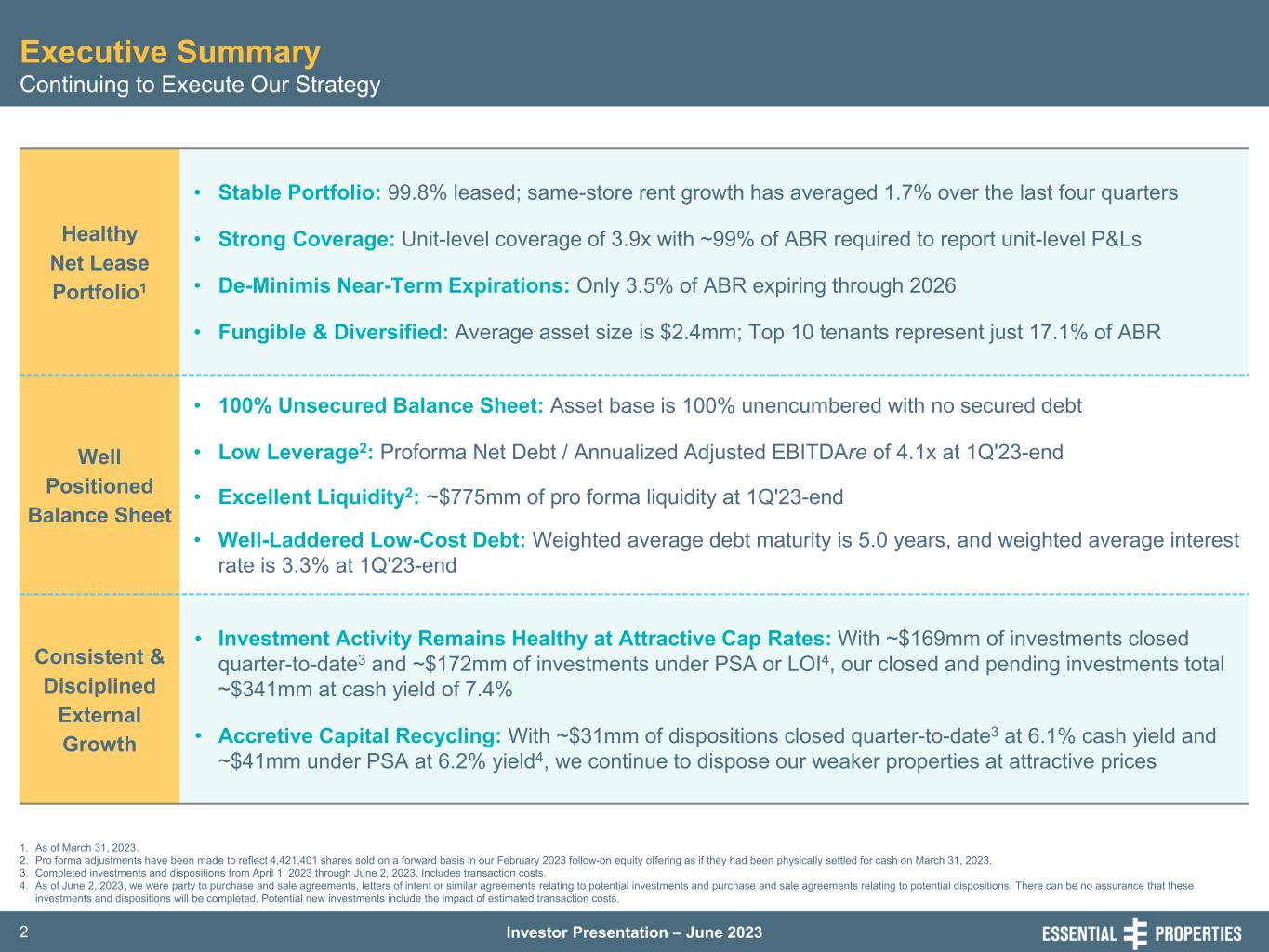 Investor Presentation – June 20232 Healthy Net Lease Portfolio1 • Stable Portfolio: 99.8% leased; same-store rent growth has averaged 1.7% over the last four quarters • Strong Coverage: Unit-level coverage of 3.9x with ~99% of ABR required to report unit-level P&Ls • De-Minimis Near-Term Expirations: Only 3.5% of ABR expiring through 2026 • Fungible & Diversified: Average asset size is $2.4mm; Top 10 tenants represent just 17.1% of ABR Well Positioned Balance Sheet • 100% Unsecured Balance Sheet: Asset base is 100% unencumbered with no secured debt • Low Leverage2: Proforma Net Debt / Annualized Adjusted EBITDAre of 4.1x at 1Q'23-end • Excellent Liquidity2: ~$775mm of pro forma liquidity at 1Q'23-end • Well-Laddered Low-Cost Debt: Weighted average debt maturity is 5.0 years, and weighted average interest rate is 3.3% at 1Q'23-end Consistent & Disciplined External Growth • Investment Activity Remains Healthy at Attractive Cap Rates: With ~$169mm of investments closed quarter-to-date3 and ~$172mm of investments under PSA or LOI4, our closed and pending investments total ~$341mm at cash yield of 7.4% • Accretive Capital Recycling: With ~$31mm of dispositions closed quarter-to-date3 at 6.1% cash yield and ~$41mm under PSA at 6.2% yield4, we continue to dispose our weaker properties at attractive prices 1. As of March 31, 2023. 2. Pro forma adjustments have been made to reflect 4,421,401 shares sold on a forward basis in our February 2023 follow-on equity offering as if they had been physically settled for cash on March 31, 2023. 3. Completed investments and dispositions from April 1, 2023 through June 2, 2023. Includes transaction costs. 4. As of June 2, 2023, we were party to purchase and sale agreements, letters of intent or similar agreements relating to potential investments and purchase and sale agreements relating to potential dispositions. There can be no assurance that these investments and dispositions will be completed. Potential new investments include the impact of estimated transaction costs. Executive Summary Continuing to Execute Our Strategy