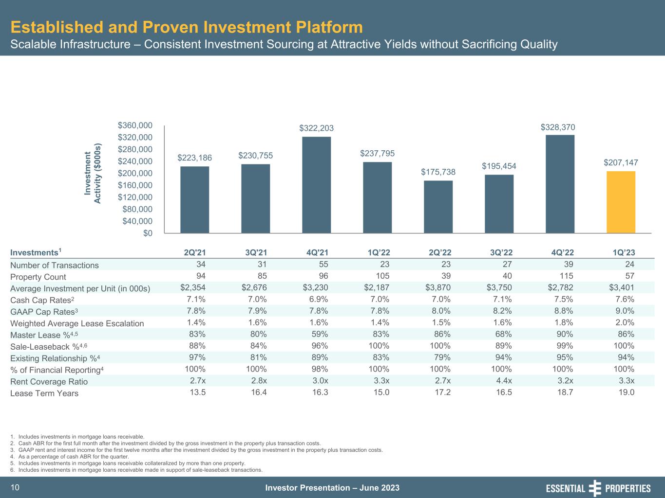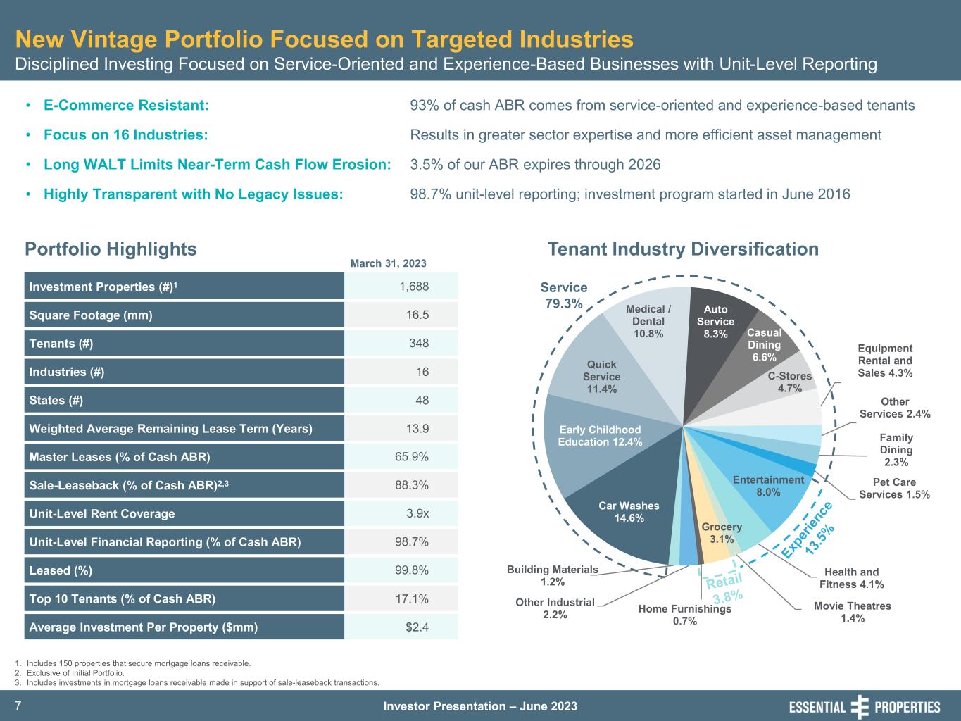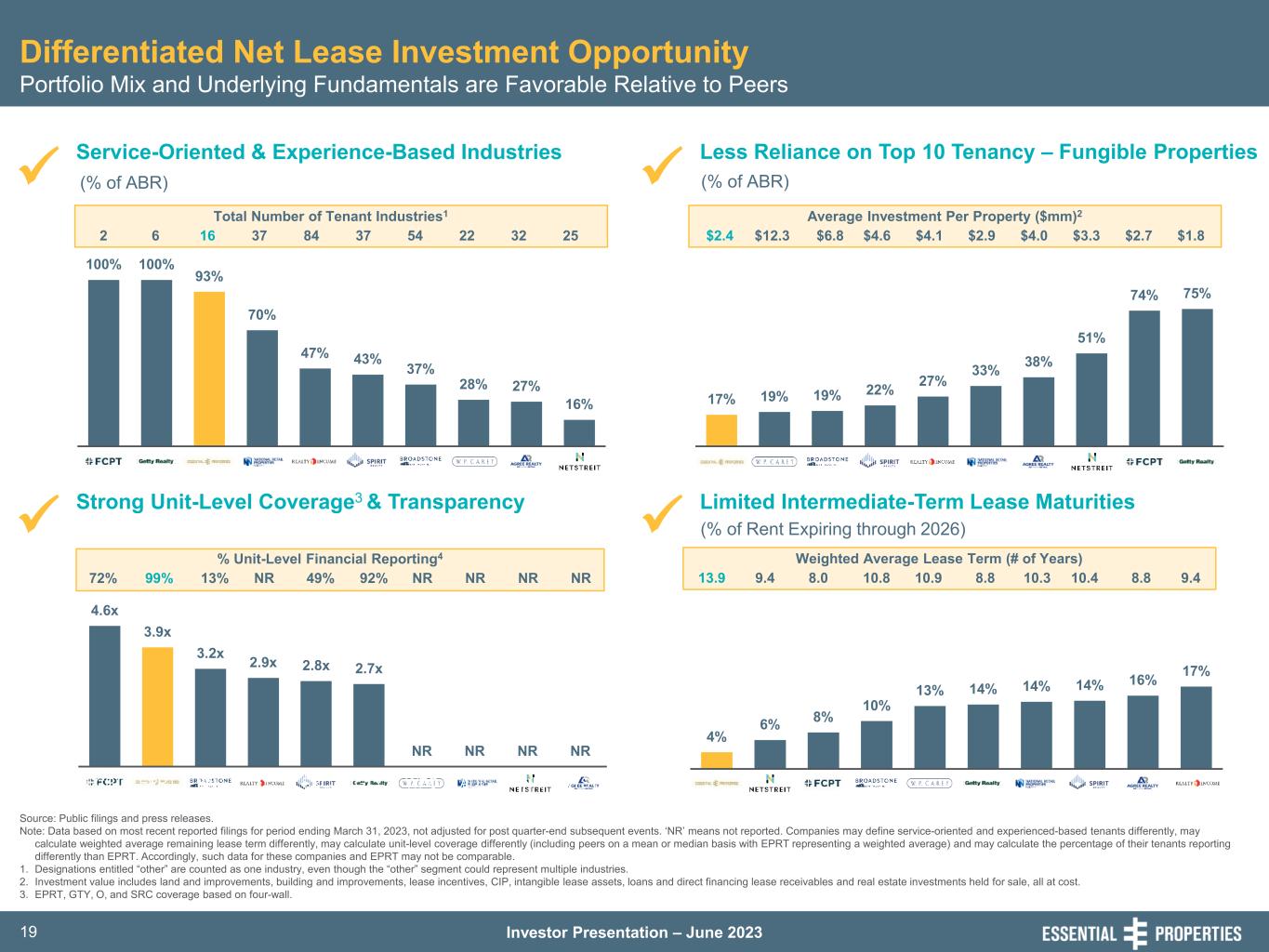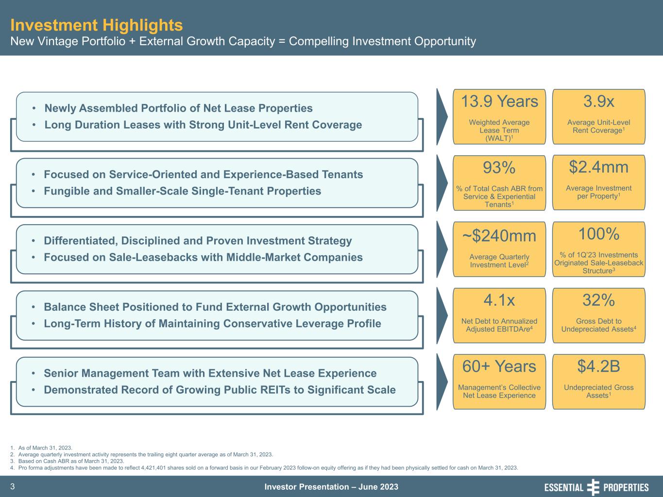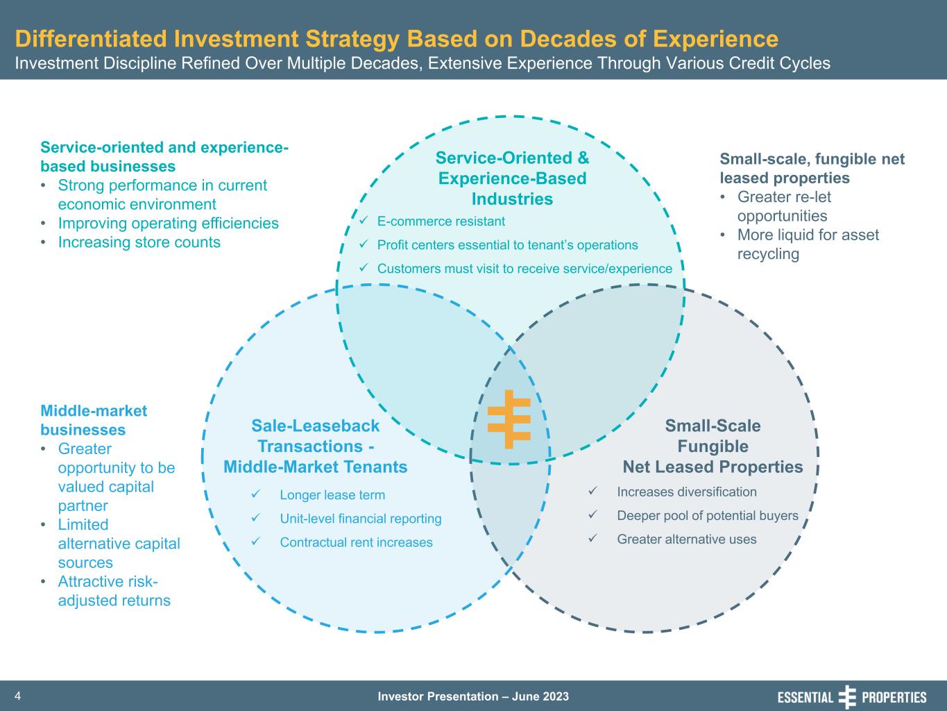 Investor Presentation – June 20233 Investment Highlights • Newly Assembled Portfolio of Net Lease Properties • Long Duration Leases with Strong Unit-Level Rent Coverage • Focused on Service-Oriented and Experience-Based Tenants • Fungible and Smaller-Scale Single-Tenant Properties • Differentiated, Disciplined and Proven Investment Strategy • Focused on Sale-Leasebacks with Middle-Market Companies • Balance Sheet Positioned to Fund External Growth Opportunities • Long-Term History of Maintaining Conservative Leverage Profile • Senior Management Team with Extensive Net Lease Experience • Demonstrated Record of Growing Public REITs to Significant Scale 1. As of March 31, 2023. 2. Average quarterly investment activity represents the trailing eight quarter average as of March 31, 2023. 3. Based on Cash ABR as of March 31, 2023. 4. Pro forma adjustments have been made to reflect 4,421,401 shares sold on a forward basis in our February 2023 follow-on equity offering as if they had been physically settled for cash on March 31, 2023. New Vintage Portfolio + External Growth Capacity = Compelling Investment Opportunity 13.9 Years Weighted Average Lease Term (WALT)1 3.9x Average Unit-Level Rent Coverage1 93% % of Total Cash ABR from Service & Experiential Tenants1 $2.4mm Average Investment per Property1 ~$240mm Average Quarterly Investment Level2 100% % of 1Q’23 Investments Originated Sale-Leaseback Structure3 4.1x Net Debt to Annualized Adjusted EBITDAre4 32% Gross Debt to Undepreciated Assets4 60+ Years Management’s Collective Net Lease Experience $4.2B Undepreciated Gross Assets1