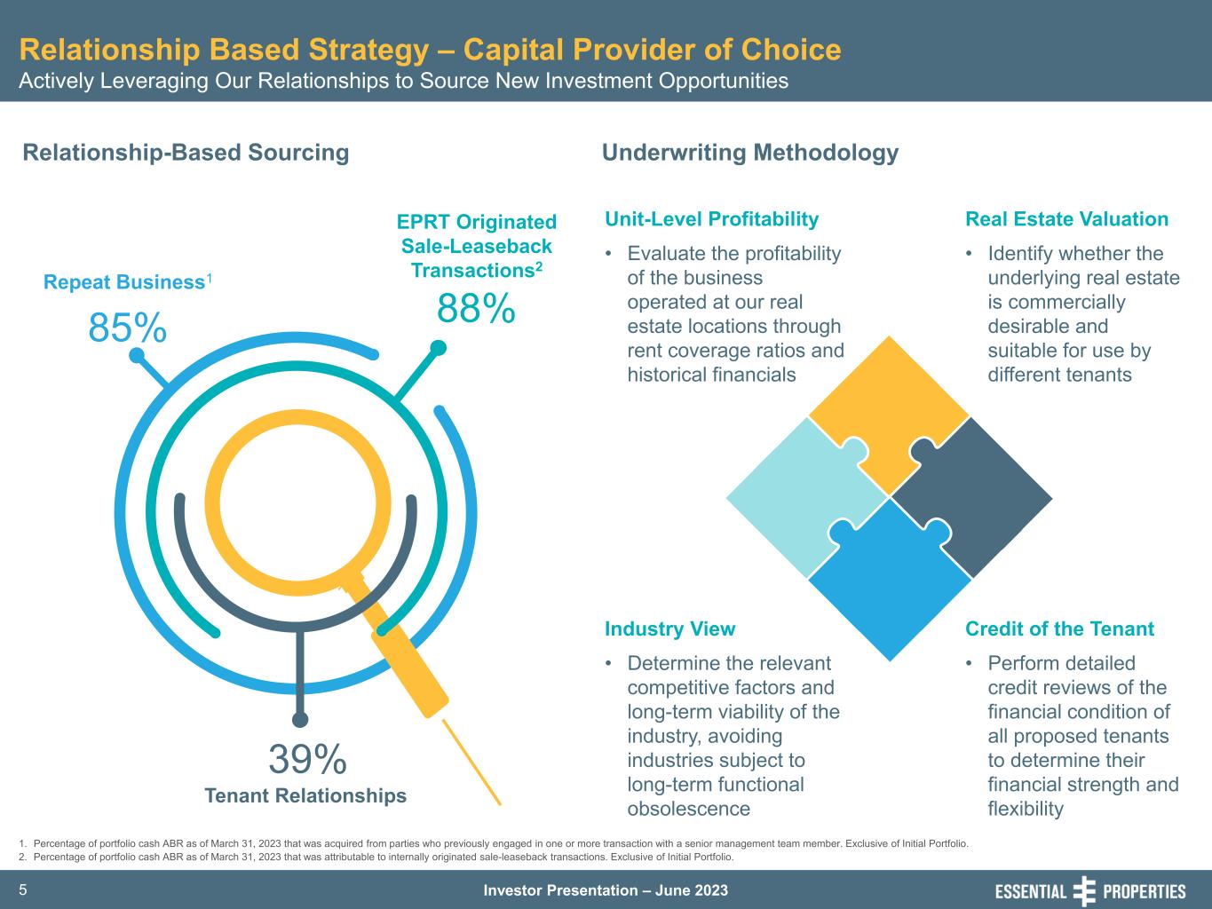 Investor Presentation – June 20234 Differentiated Investment Strategy Based on Decades of Experience Investment Discipline Refined Over Multiple Decades, Extensive Experience Through Various Credit Cycles Service-Oriented & Experience-Based Industries Sale-Leaseback Transactions - Middle-Market Tenants Small-Scale Fungible Net Leased Properties  E-commerce resistant  Profit centers essential to tenant’s operations  Customers must visit to receive service/experience  Longer lease term  Unit-level financial reporting  Contractual rent increases  Increases diversification  Deeper pool of potential buyers  Greater alternative uses Small-scale, fungible net leased properties • Greater re-let opportunities • More liquid for asset recycling Service-oriented and experience- based businesses • Strong performance in current economic environment • Improving operating efficiencies • Increasing store counts Middle-market businesses • Greater opportunity to be valued capital partner • Limited alternative capital sources • Attractive risk- adjusted returns