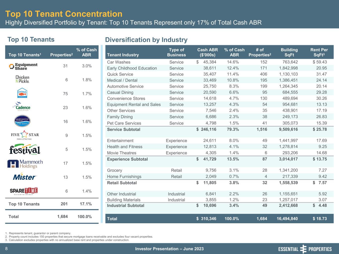 Investor Presentation – June 20237 Car Washes 14.6% Early Childhood Education 12.4% Quick Service 11.4% Medical / Dental 10.8% Auto Service 8.3% Casual Dining 6.6% C-Stores 4.7% Equipment Rental and Sales 4.3% Other Services 2.4% Family Dining 2.3% Pet Care Services 1.5% Entertainment 8.0% Health and Fitness 4.1% Movie Theatres 1.4% Grocery 3.1% Home Furnishings 0.7% Other Industrial 2.2% Building Materials 1.2% Service 79.3% New Vintage Portfolio Focused on Targeted Industries Disciplined Investing Focused on Service-Oriented and Experience-Based Businesses with Unit-Level Reporting 1. Includes 150 properties that secure mortgage loans receivable. 2. Exclusive of Initial Portfolio. 3. Includes investments in mortgage loans receivable made in support of sale-leaseback transactions. Portfolio Highlights March 31, 2023 Tenant Industry Diversification • E-Commerce Resistant: • Focus on 16 Industries: • Long WALT Limits Near-Term Cash Flow Erosion: • Highly Transparent with No Legacy Issues: Investment Properties (#)1 1,688 Square Footage (mm) 16.5 Tenants (#) 348 Industries (#) 16 States (#) 48 Weighted Average Remaining Lease Term (Years) 13.9 Master Leases (% of Cash ABR) 65.9% Sale-Leaseback (% of Cash ABR)2,3 88.3% Unit-Level Rent Coverage 3.9x Unit-Level Financial Reporting (% of Cash ABR) 98.7% Leased (%) 99.8% Top 10 Tenants (% of Cash ABR) 17.1% Average Investment Per Property ($mm) $2.4 93% of cash ABR comes from service-oriented and experience-based tenants Results in greater sector expertise and more efficient asset management 3.5% of our ABR expires through 2026 98.7% unit-level reporting; investment program started in June 2016