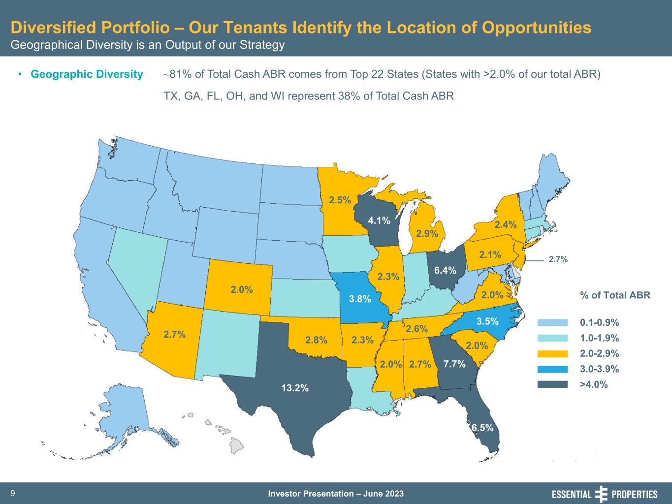 Investor Presentation – June 20239 Diversified Portfolio – Our Tenants Identify the Location of Opportunities Geographical Diversity is an Output of our Strategy • Geographic Diversity ~81% of Total Cash ABR comes from Top 22 States (States with >2.0% of our total ABR) TX, GA, FL, OH, and WI represent 38% of Total Cash ABR % of Total ABR 0.1-0.9% 1.0-1.9% 2.0-2.9% 3.0-3.9% >4.0%13.2% 7.7% 4.1% 6.5% 6.4% 3.8% 3.5% 2.9% 2.1% 2.4% 2.5% 2.0% 2.7% 2.8% 2.3% 2.0% 2.7% 2.6% 2.0% 2.0% 2.7% 2.3%