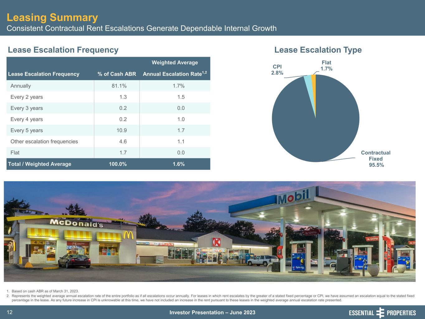 Investor Presentation – June 202311 Active Asset Management Proactive Asset Management Mitigates Risk, Optimizes Accretive Capital Recycling and Risk-Adjusted Returns 1. Includes the impact of transaction costs. 2. Gains/(losses) based on our initial purchase price. 3. Cash ABR at time of sale divided by gross sale price (excluding transaction costs) for the property. 4. Property count excludes dispositions of undeveloped land parcels or dispositions where only a portion of the owned parcel is sold. 5. Excludes properties sold pursuant to an existing tenant purchase option or properties purchased by the tenant. Dispositions 2Q'21 3Q'21 4Q'21 1Q’22 2Q’22 3Q’22 4Q’22 1Q’23 Realized Gain/(Loss)1,2 (7.3%) 29.8%5 7.5% 0.4% 38.6% 11.1% 7.2% (2.1%) Cash Cap Rate on Leased Assets3 7.1% 6.5%5 6.0% 7.1%5 6.2% 6.2%5 6.9% 6.1%5 Leased Properties Sold4 6 11 2 6 8 12 25 17 Vacant Properties Sold4 1 — — — — — 1 — Rent Coverage Ratio 1.8x 1.2x 0.0x 2.5x5 1.1x 1.2x 2.1x 2.3x $19,578 $10,089 $4,466 $18,443 $26,091 $35,513 $75,522 $37,161 $0 $10,000 $20,000 $30,000 $40,000 $50,000 $60,000 $70,000 $80,000 D is po si tio n Ac tiv ity ($ 00 0s )1