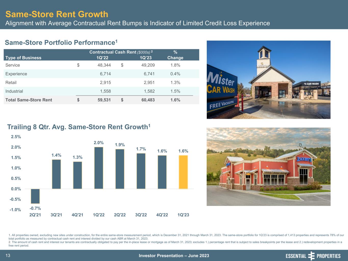 Investor Presentation – June 202312 Leasing Summary Consistent Contractual Rent Escalations Generate Dependable Internal Growth Contractual Fixed 95.5% CPI 2.8% Flat 1.7% 1. Based on cash ABR as of March 31, 2023. 2. Represents the weighted average annual escalation rate of the entire portfolio as if all escalations occur annually. For leases in which rent escalates by the greater of a stated fixed percentage or CPI, we have assumed an escalation equal to the stated fixed percentage in the lease. As any future increase in CPI is unknowable at this time, we have not included an increase in the rent pursuant to these leases in the weighted average annual escalation rate presented. Lease Escalation Frequency Lease Escalation Type Weighted Average Lease Escalation Frequency % of Cash ABR Annual Escalation Rate1,2 Annually 81.1% 1.7% Every 2 years 1.3 1.5 Every 3 years 0.2 0.0 Every 4 years 0.2 1.0 Every 5 years 10.9 1.7 Other escalation frequencies 4.6 1.1 Flat 1.7 0.0 Total / Weighted Average 100.0% 1.6%