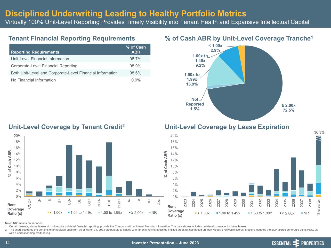 Investor Presentation – June 202314 Disciplined Underwriting Leading to Healthy Portfolio Metrics Virtually 100% Unit-Level Reporting Provides Timely Visibility into Tenant Health and Expansive Intellectual Capital 0% 2% 4% 6% 8% 10% 12% 14% 16% 18% 20% 20 23 20 24 20 25 20 26 20 27 20 28 20 29 20 30 20 31 20 32 20 33 20 34 20 35 20 36 20 37 20 38 Th er ea fte r % o f C as h AB R < 1.00x 1.00 to 1.49x 1.50 to 1.99x ≥ 2.00x NR 36.3% 0% 2% 4% 6% 8% 10% 12% 14% 16% 18% 20% C C C + B- B B+ BB - BB BB + BB B- BB B BB B+ A- A A+ AA - % o f C as h AB R < 1.00x 1.00 to 1.49x 1.50 to 1.99x ≥ 2.00x NR Rent Coverage Ratio (x) Tenant Financial Reporting Requirements % of Cash ABR by Unit-Level Coverage Tranche1 Unit-Level Coverage by Lease ExpirationUnit-Level Coverage by Tenant Credit2 Reporting Requirements % of Cash ABR Unit-Level Financial Information 98.7% Corporate-Level Financial Reporting 98.9% Both Unit-Level and Corporate-Level Financial Information 98.6% No Financial Information 0.9% Rent Coverage Ratio (x) ≥ 2.00x 72.5% Not Reported 1.5% 1.50x to 1.99x 13.9% 1.00x to 1.49x 9.2% < 1.00x 2.9% Note: ‘NR’ means not reported. 1. Certain tenants, whose leases do not require unit-level financial reporting, provide the Company with unit-level financial information. The data shown includes unit-level coverage for these leases. 2. The chart illustrates the portions of annualized base rent as of March 31, 2023 attributable to leases with tenants having specified implied credit ratings based on their Moody’s RiskCalc scores. Moody’s equates the EDF scores generated using RiskCalc with a corresponding credit rating.