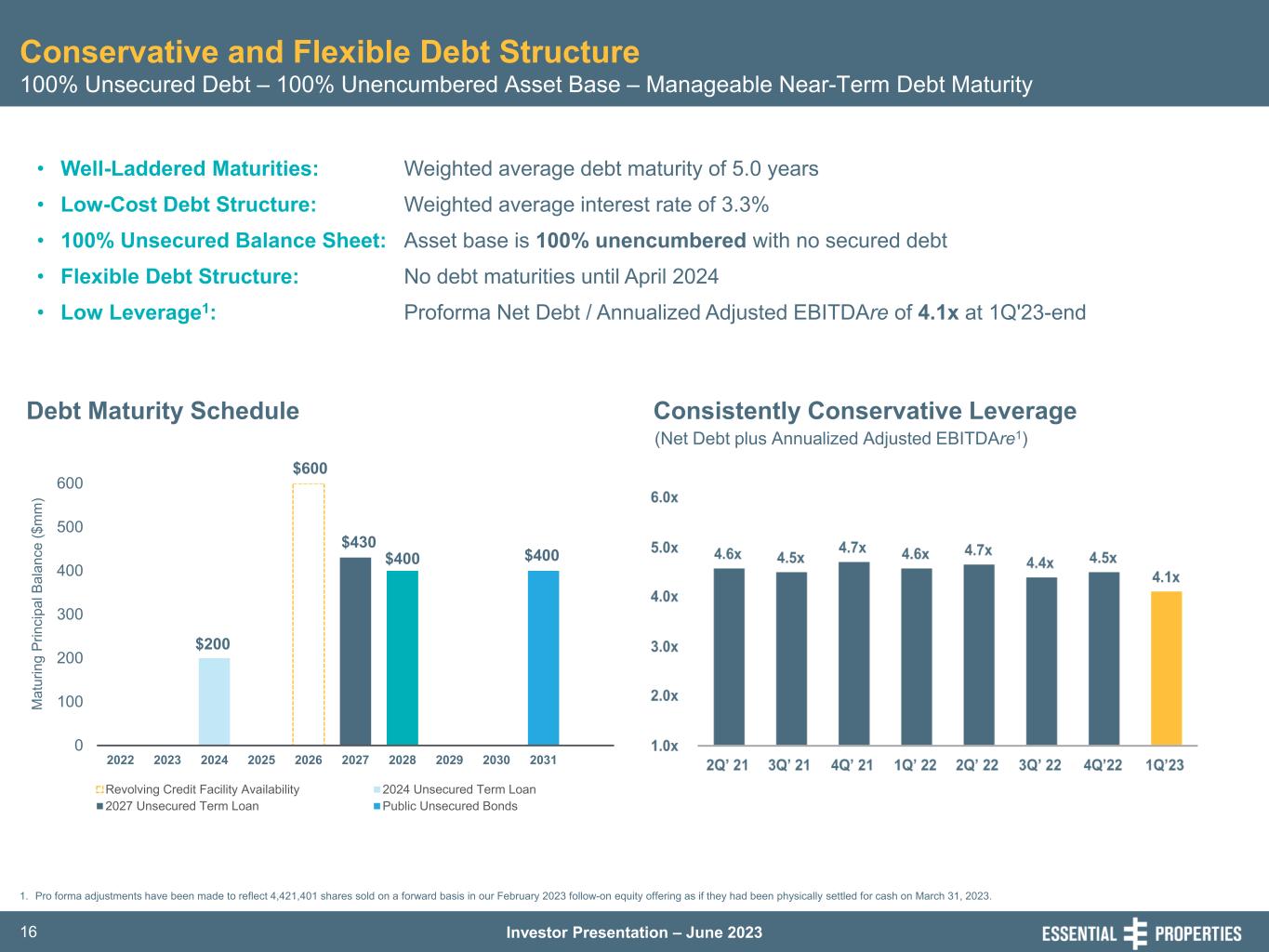 Investor Presentation – June 202328 Financial Summary – 1Q'23 Market Capitalization, Debt Summary and Leverage Metrics 1. Rates presented for our term loans are fixed at the stated rates after giving effect to our interest rate swaps, applicable margin of 85bps and SOFR premium of 10bps. 2. Our revolving credit facility provides a maximum aggregate initial original principal amount of up to $600 million and includes an accordion feature to increase, subject to certain conditions, the maximum availability of the facility by up to $600 million. Borrowings bear interest at Term SOFR plus applicable margin of 77.5bps and SOFR premium of 10bps. 3. Common equity & units as of March 31, 2023, based on 148,838,117 common shares outstanding and 553,847 OP units held by non-controlling interests. 4. Pro forma adjustments have been made to reflect 4,421,401 shares sold on a forward basis in our February 2023 follow-on equity offering as if they had been physically settled for cash on March 31, 2023. (dollars in thousands, except share and per share amounts) March 31, 2023 Rate Wtd. Avg. Maturity Unsecured debt: April 2024 term loan1 $ 200,000 2.9% 1.0 years February 2027 term loan1 430,000 2.4% 3.9 years January 2028 term loan1 400,000 4.6% 4.8 years Senior unsecured notes due July 2031 400,000 3.1% 8.3 years Revolving credit facility2 — —% 2.9 years Total unsecured debt 1,430,000 3.3% 5.0 years Gross debt 1,430,000 Less: cash & cash equivalents (70,958) Less: restricted cash available for future investment — Net debt 1,359,042 Equity: Preferred stock — Common stock & OP units (149,391,964 shares @ $24.85/share as of 3/31/23)3 3,712,390 Total equity 3,712,390 Total enterprise value ("TEV") $ 5,071,432 Pro forma adjustments to Net Debt and TEV:4 Net debt $ 1,359,042 Less: cash received — unsettled forward equity (103,605) Pro forma net debt 1,255,437 Total equity 3,712,390 Common stock — unsettled forward equity (4,421,401 shares @ $24.85/share as of 3/31/23) 109,872 Pro forma TEV $ 5,077,699 Gross Debt / Undepreciated Gross Assets 32.2% Net Debt / TEV 26.8% Net Debt / Annualized Adjusted EBITDAre 4.4x Pro Forma Gross Debt / Undepreciated Gross Assets 31.5% Pro Forma Net Debt / Pro Forma TEV 24.7% Pro Forma Net Debt / Annualized Adjusted EBITDAre 4.1x