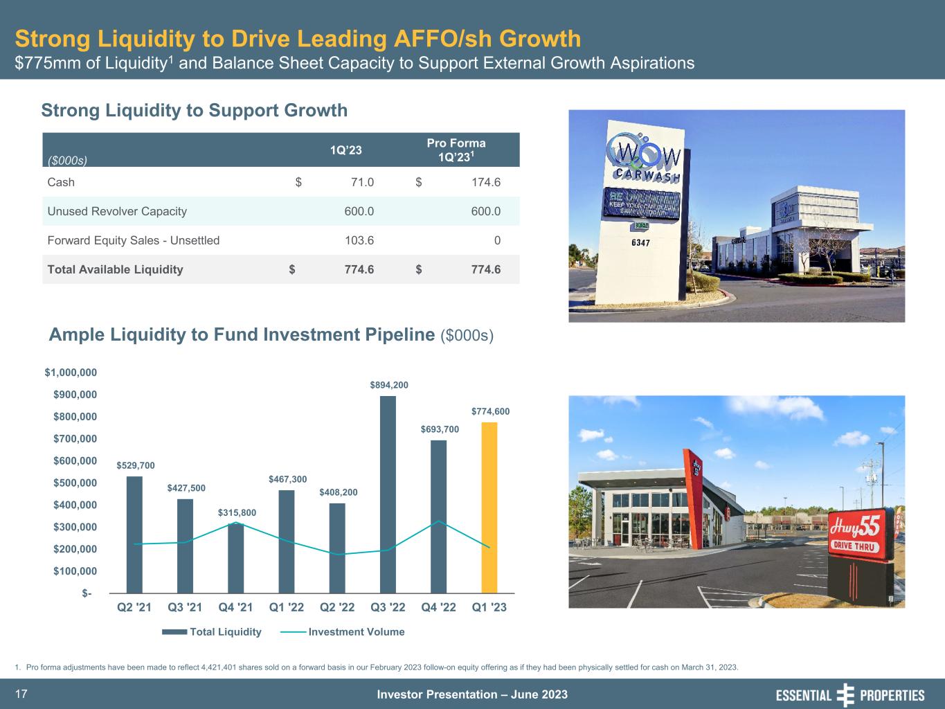 Investor Presentation – June 202317 Strong Liquidity to Drive Leading AFFO/sh Growth $775mm of Liquidity1 and Balance Sheet Capacity to Support External Growth Aspirations ($000s) 1Q’23 Pro Forma 1Q’231 Cash $ 71.0 $ 174.6 Unused Revolver Capacity 600.0 600.0 Forward Equity Sales - Unsettled 103.6 0 Total Available Liquidity $ 774.6 $ 774.6 1. Pro forma adjustments have been made to reflect 4,421,401 shares sold on a forward basis in our February 2023 follow-on equity offering as if they had been physically settled for cash on March 31, 2023. $529,700 $427,500 $315,800 $467,300 $408,200 $894,200 $693,700 $774,600 $- $100,000 $200,000 $300,000 $400,000 $500,000 $600,000 $700,000 $800,000 $900,000 $1,000,000 Q2 '21 Q3 '21 Q4 '21 Q1 '22 Q2 '22 Q3 '22 Q4 '22 Q1 '23 Total Liquidity Investment Volume Ample Liquidity to Fund Investment Pipeline ($000s) Strong Liquidity to Support Growth