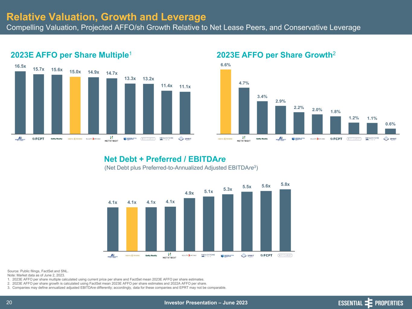 Investor Presentation – June 202319 Differentiated Net Lease Investment Opportunity Portfolio Mix and Underlying Fundamentals are Favorable Relative to Peers Strong Unit-Level Coverage3 & Transparency Service-Oriented & Experience-Based Industries Limited Intermediate-Term Lease Maturities   Source: Public filings and press releases. Note: Data based on most recent reported filings for period ending March 31, 2023, not adjusted for post quarter-end subsequent events. ‘NR’ means not reported. Companies may define service-oriented and experienced-based tenants differently, may calculate weighted average remaining lease term differently, may calculate unit-level coverage differently (including peers on a mean or median basis with EPRT representing a weighted average) and may calculate the percentage of their tenants reporting differently than EPRT. Accordingly, such data for these companies and EPRT may not be comparable. 1. Designations entitled “other” are counted as one industry, even though the “other” segment could represent multiple industries. 2. Investment value includes land and improvements, building and improvements, lease incentives, CIP, intangible lease assets, loans and direct financing lease receivables and real estate investments held for sale, all at cost. 3. EPRT, GTY, O, and SRC coverage based on four-wall. (% of ABR) (% of Rent Expiring through 2026) Less Reliance on Top 10 Tenancy – Fungible Properties  (% of ABR) 2 Total Number of Tenant Industries1 6 16 37 84 37 54 22 32 25 72% % Unit-Level Financial Reporting4 13% NR 49% 92% NR NR99% NR NR $2.4 Average Investment Per Property ($mm)2 $12.3 $6.8 $4.6 $4.1 $2.9 $4.0 $3.3 $2.7 $1.8 13.9 Weighted Average Lease Term (# of Years) 9.4 8.0 10.8 10.9 8.8 10.3 10.4 8.8 9.4 75% 74% 51% 38% 33% 27% 22% 19% 19% 17% 100% 100% 93% 70% 47% 43% 37% 28% 27% 16% FCPT GTY EPRT NNN O SRC BNL WPC ADC NTST 4% 6% 8% 10% 13% 14% 14% 14% 16% 17% 4.6x 3.9x 3.2x 2.9x 2.8x 2.7x NR NR NR NR FCPT EPRT BNL O SRC GTY WPC ADC NNN NTST