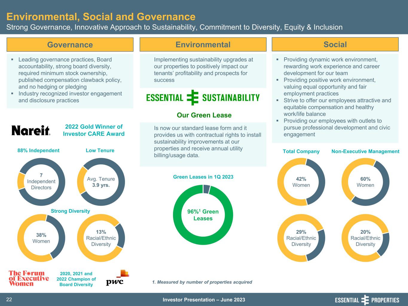 Investor Presentation – June 202322 Governance  Leading governance practices, Board accountability, strong board diversity, required minimum stock ownership, published compensation clawback policy, and no hedging or pledging  Industry recognized investor engagement and disclosure practices Environmental, Social and Governance Strong Governance, Innovative Approach to Sustainability, Commitment to Diversity, Equity & Inclusion Environmental Social Implementing sustainability upgrades at our properties to positively impact our tenants’ profitability and prospects for success  Providing dynamic work environment, rewarding work experience and career development for our team  Providing positive work environment, valuing equal opportunity and fair employment practices  Strive to offer our employees attractive and equitable compensation and healthy work/life balance  Providing our employees with outlets to pursue professional development and civic engagement 29% Racial/Ethnic Diversity 42% Women 60% Women 20% Racial/Ethnic Diversity Total Company Non-Executive Management 96%1 Green Leases 1. Measured by number of properties acquired 2020, 2021 and 2022 Champion of Board Diversity Avg. Tenure 3.9 yrs. 7 Independent Directors 38% Women 13% Racial/Ethnic Diversity Green Leases in 1Q 2023 88% Independent Low Tenure Strong Diversity 2022 Gold Winner of Investor CARE Award Is now our standard lease form and it provides us with contractual rights to install sustainability improvements at our properties and receive annual utility billing/usage data. Our Green Lease