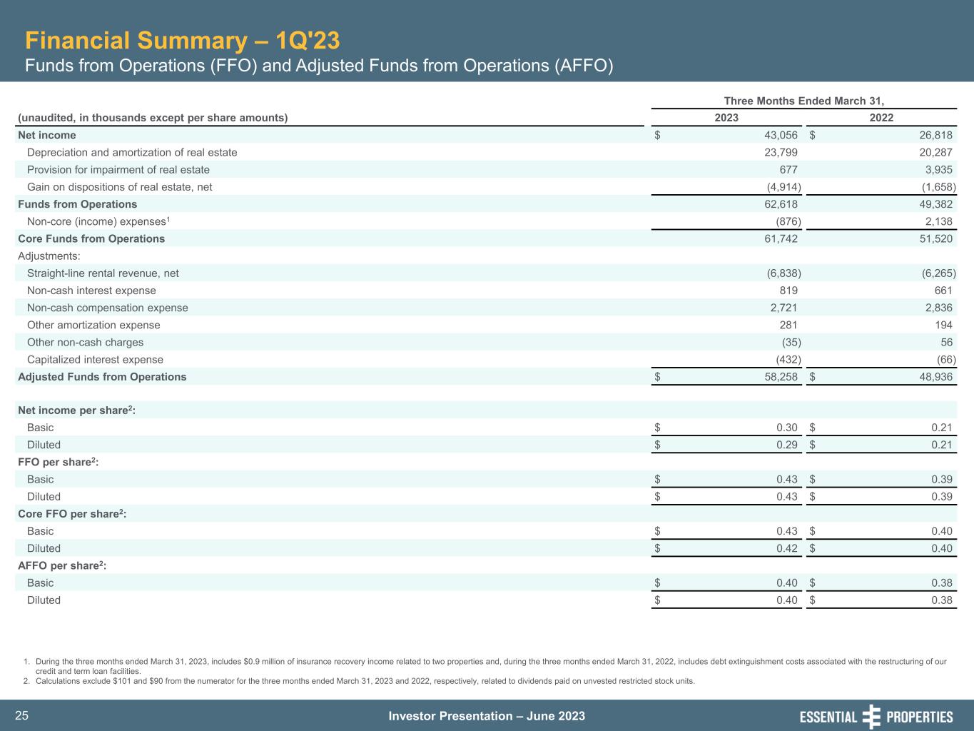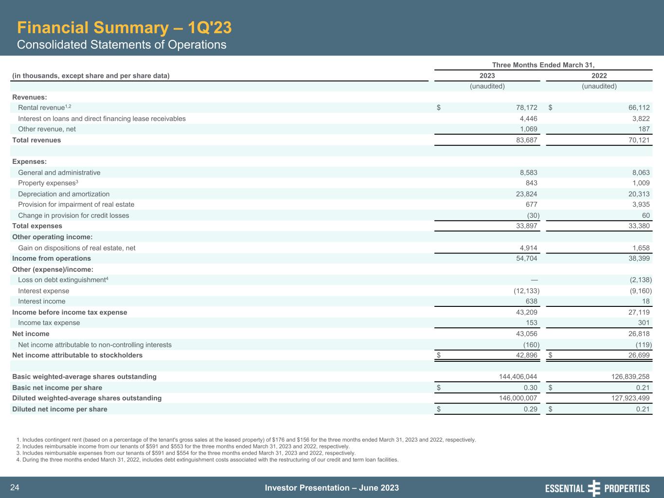 Investor Presentation – June 202324 Financial Summary – 1Q'23 Consolidated Statements of Operations 1. Includes contingent rent (based on a percentage of the tenant's gross sales at the leased property) of $176 and $156 for the three months ended March 31, 2023 and 2022, respectively. 2. Includes reimbursable income from our tenants of $591 and $553 for the three months ended March 31, 2023 and 2022, respectively. 3. Includes reimbursable expenses from our tenants of $591 and $554 for the three months ended March 31, 2023 and 2022, respectively. 4. During the three months ended March 31, 2022, includes debt extinguishment costs associated with the restructuring of our credit and term loan facilities. Three Months Ended March 31, (in thousands, except share and per share data) 2023 2022 (unaudited) (unaudited) Revenues: Rental revenue1,2 $ 78,172 $ 66,112 Interest on loans and direct financing lease receivables 4,446 3,822 Other revenue, net 1,069 187 Total revenues 83,687 70,121 Expenses: General and administrative 8,583 8,063 Property expenses3 843 1,009 Depreciation and amortization 23,824 20,313 Provision for impairment of real estate 677 3,935 Change in provision for credit losses (30) 60 Total expenses 33,897 33,380 Other operating income: Gain on dispositions of real estate, net 4,914 1,658 Income from operations 54,704 38,399 Other (expense)/income: Loss on debt extinguishment4 — (2,138) Interest expense (12,133) (9,160) Interest income 638 18 Income before income tax expense 43,209 27,119 Income tax expense 153 301 Net income 43,056 26,818 Net income attributable to non-controlling interests (160) (119) Net income attributable to stockholders $ 42,896 $ 26,699 Basic weighted-average shares outstanding 144,406,044 126,839,258 Basic net income per share $ 0.30 $ 0.21 Diluted weighted-average shares outstanding 146,000,007 127,923,499 Diluted net income per share $ 0.29 $ 0.21