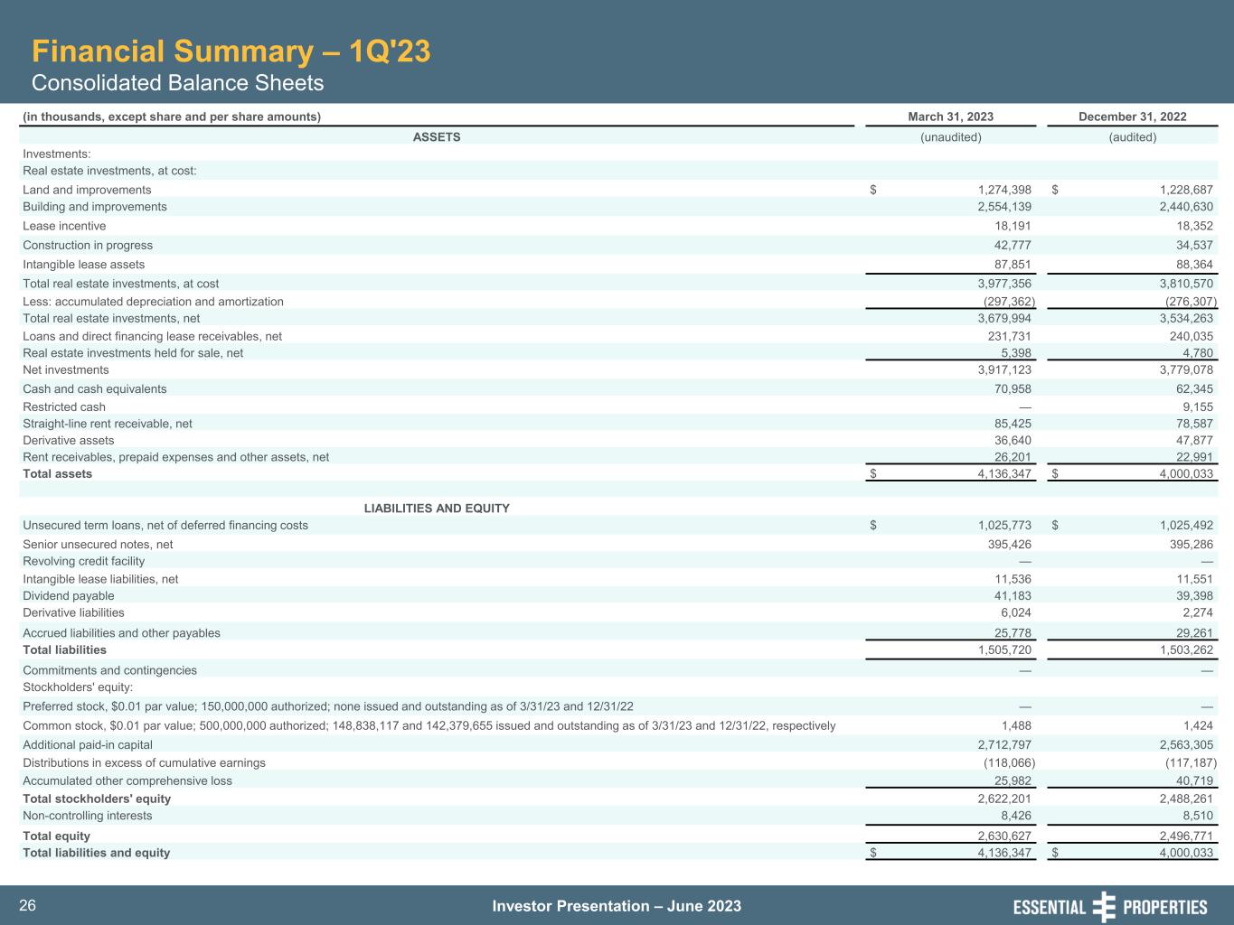 Investor Presentation – June 202326 Financial Summary – 1Q'23 Consolidated Balance Sheets (in thousands, except share and per share amounts) March 31, 2023 December 31, 2022 ASSETS (unaudited) (audited) Investments: Real estate investments, at cost: Land and improvements $ 1,274,398 $ 1,228,687 Building and improvements 2,554,139 2,440,630 Lease incentive 18,191 18,352 Construction in progress 42,777 34,537 Intangible lease assets 87,851 88,364 Total real estate investments, at cost 3,977,356 3,810,570 Less: accumulated depreciation and amortization (297,362) (276,307) Total real estate investments, net 3,679,994 3,534,263 Loans and direct financing lease receivables, net 231,731 240,035 Real estate investments held for sale, net 5,398 4,780 Net investments 3,917,123 3,779,078 Cash and cash equivalents 70,958 62,345 Restricted cash — 9,155 Straight-line rent receivable, net 85,425 78,587 Derivative assets 36,640 47,877 Rent receivables, prepaid expenses and other assets, net 26,201 22,991 Total assets $ 4,136,347 $ 4,000,033 LIABILITIES AND EQUITY Unsecured term loans, net of deferred financing costs $ 1,025,773 $ 1,025,492 Senior unsecured notes, net 395,426 395,286 Revolving credit facility — — Intangible lease liabilities, net 11,536 11,551 Dividend payable 41,183 39,398 Derivative liabilities 6,024 2,274 Accrued liabilities and other payables 25,778 29,261 Total liabilities 1,505,720 1,503,262 Commitments and contingencies — — Stockholders' equity: Preferred stock, $0.01 par value; 150,000,000 authorized; none issued and outstanding as of 3/31/23 and 12/31/22 — — Common stock, $0.01 par value; 500,000,000 authorized; 148,838,117 and 142,379,655 issued and outstanding as of 3/31/23 and 12/31/22, respectively 1,488 1,424 Additional paid-in capital 2,712,797 2,563,305 Distributions in excess of cumulative earnings (118,066) (117,187) Accumulated other comprehensive loss 25,982 40,719 Total stockholders' equity 2,622,201 2,488,261 Non-controlling interests 8,426 8,510 Total equity 2,630,627 2,496,771 Total liabilities and equity $ 4,136,347 $ 4,000,033