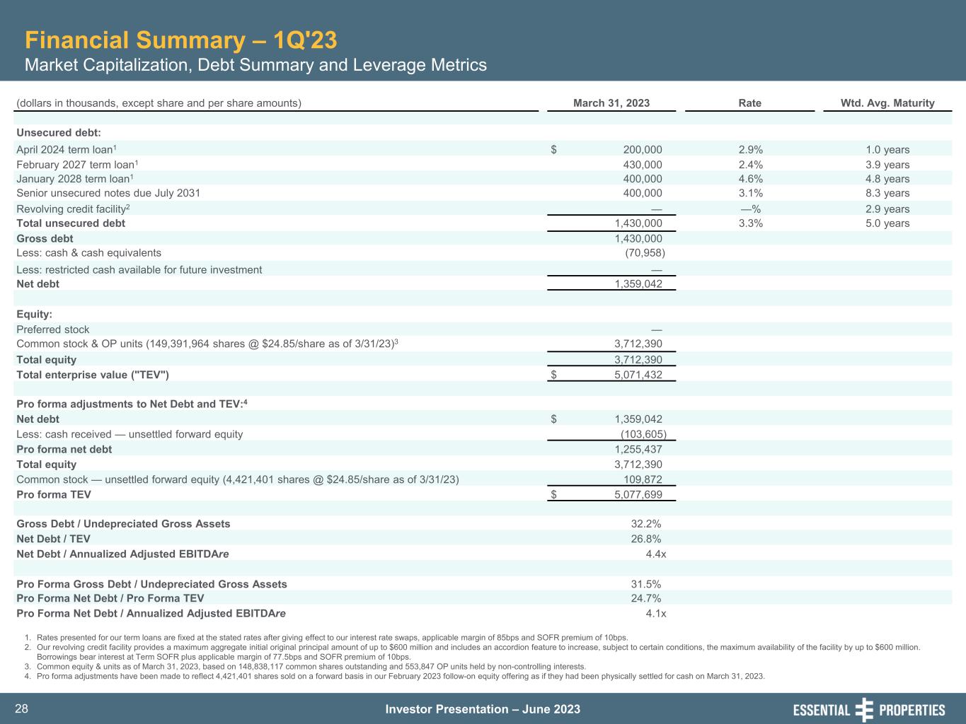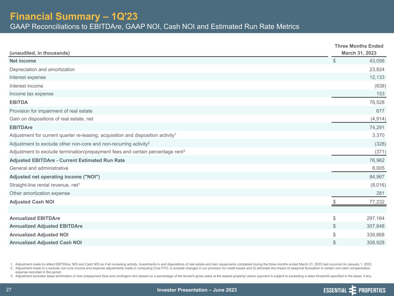 Investor Presentation – June 202327 Financial Summary – 1Q'23 GAAP Reconciliations to EBITDAre, GAAP NOI, Cash NOI and Estimated Run Rate Metrics 1. Adjustment made to reflect EBITDAre, NOI and Cash NOI as if all re-leasing activity, investments in and dispositions of real estate and loan repayments completed during the three months ended March 31, 2023 had occurred on January 1, 2023. 2. Adjustment made to i) exclude non-core income and expense adjustments made in computing Core FFO, ii) exclude changes in our provision for credit losses and iii) eliminate the impact of seasonal fluctuation in certain non-cash compensation expense recorded in the period. 3. Adjustment excludes lease termination or loan prepayment fees and contingent rent (based on a percentage of the tenant's gross sales at the leased property) where payment is subject to exceeding a sales threshold specified in the lease, if any. Three Months Ended (unaudited, in thousands) March 31, 2023 Net income $ 43,056 Depreciation and amortization 23,824 Interest expense 12,133 Interest income (638) Income tax expense 153 EBITDA 78,528 Provision for impairment of real estate 677 Gain on dispositions of real estate, net (4,914) EBITDAre 74,291 Adjustment for current quarter re-leasing, acquisition and disposition activity1 3,370 Adjustment to exclude other non-core and non-recurring activity2 (328) Adjustment to exclude termination/prepayment fees and certain percentage rent3 (371) Adjusted EBITDAre - Current Estimated Run Rate 76,962 General and administrative 8,005 Adjusted net operating income ("NOI") 84,967 Straight-line rental revenue, net1 (8,016) Other amortization expense 281 Adjusted Cash NOI $ 77,232 Annualized EBITDAre $ 297,164 Annualized Adjusted EBITDAre $ 307,848 Annualized Adjusted NOI $ 339,868 Annualized Adjusted Cash NOI $ 308,928