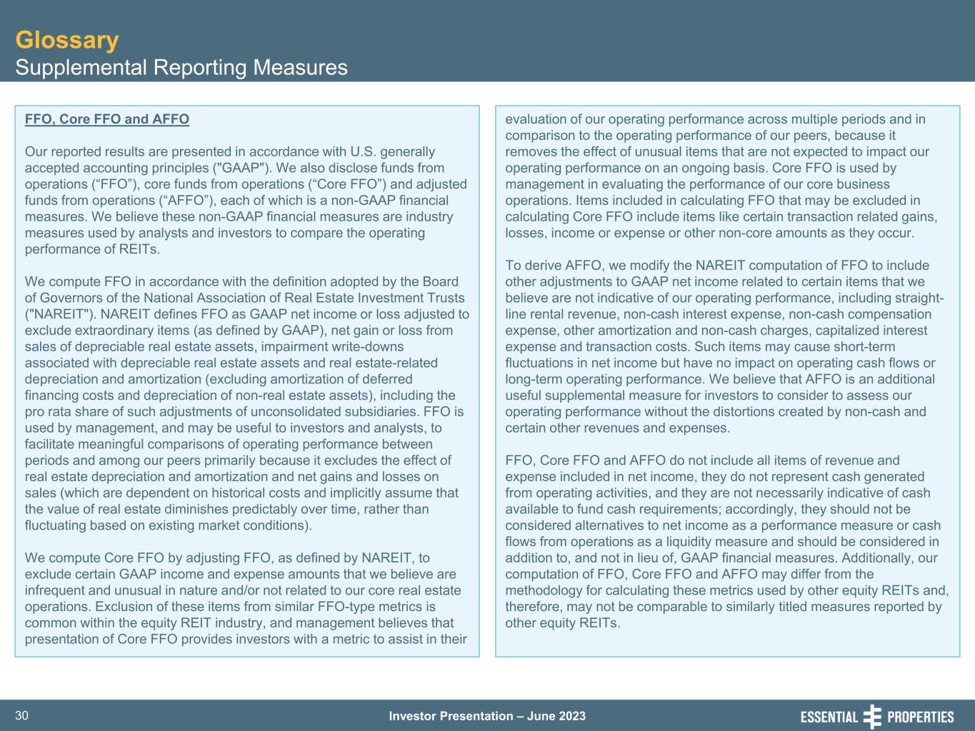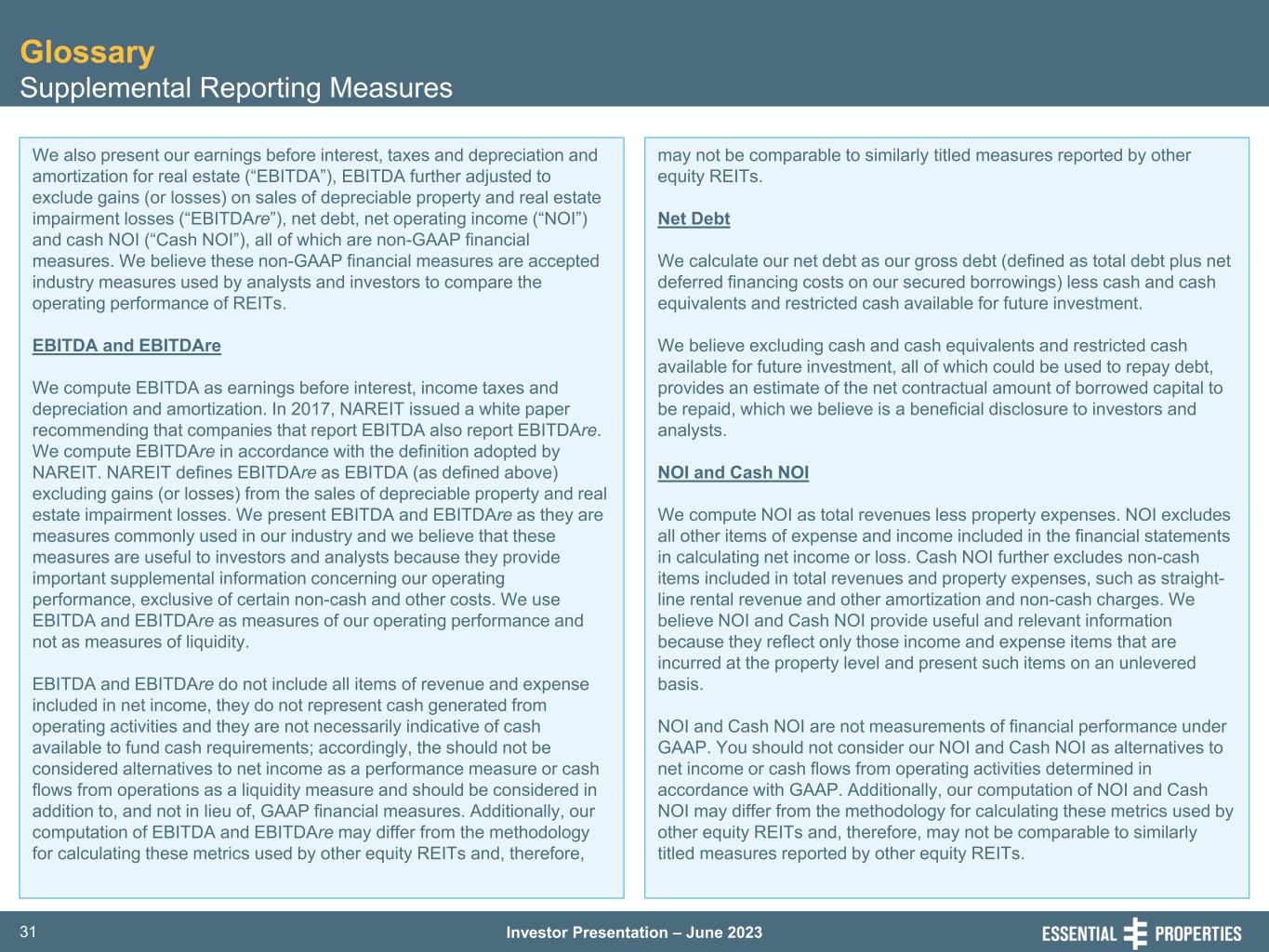 Investor Presentation – June 202330 Glossary Supplemental Reporting Measures FFO, Core FFO and AFFO Our reported results are presented in accordance with U.S. generally accepted accounting principles ("GAAP"). We also disclose funds from operations (“FFO”), core funds from operations (“Core FFO”) and adjusted funds from operations (“AFFO”), each of which is a non-GAAP financial measures. We believe these non-GAAP financial measures are industry measures used by analysts and investors to compare the operating performance of REITs. We compute FFO in accordance with the definition adopted by the Board of Governors of the National Association of Real Estate Investment Trusts ("NAREIT"). NAREIT defines FFO as GAAP net income or loss adjusted to exclude extraordinary items (as defined by GAAP), net gain or loss from sales of depreciable real estate assets, impairment write-downs associated with depreciable real estate assets and real estate-related depreciation and amortization (excluding amortization of deferred financing costs and depreciation of non-real estate assets), including the pro rata share of such adjustments of unconsolidated subsidiaries. FFO is used by management, and may be useful to investors and analysts, to facilitate meaningful comparisons of operating performance between periods and among our peers primarily because it excludes the effect of real estate depreciation and amortization and net gains and losses on sales (which are dependent on historical costs and implicitly assume that the value of real estate diminishes predictably over time, rather than fluctuating based on existing market conditions). We compute Core FFO by adjusting FFO, as defined by NAREIT, to exclude certain GAAP income and expense amounts that we believe are infrequent and unusual in nature and/or not related to our core real estate operations. Exclusion of these items from similar FFO-type metrics is common within the equity REIT industry, and management believes that presentation of Core FFO provides investors with a metric to assist in their evaluation of our operating performance across multiple periods and in comparison to the operating performance of our peers, because it removes the effect of unusual items that are not expected to impact our operating performance on an ongoing basis. Core FFO is used by management in evaluating the performance of our core business operations. Items included in calculating FFO that may be excluded in calculating Core FFO include items like certain transaction related gains, losses, income or expense or other non-core amounts as they occur. To derive AFFO, we modify the NAREIT computation of FFO to include other adjustments to GAAP net income related to certain items that we believe are not indicative of our operating performance, including straight- line rental revenue, non-cash interest expense, non-cash compensation expense, other amortization and non-cash charges, capitalized interest expense and transaction costs. Such items may cause short-term fluctuations in net income but have no impact on operating cash flows or long-term operating performance. We believe that AFFO is an additional useful supplemental measure for investors to consider to assess our operating performance without the distortions created by non-cash and certain other revenues and expenses. FFO, Core FFO and AFFO do not include all items of revenue and expense included in net income, they do not represent cash generated from operating activities, and they are not necessarily indicative of cash available to fund cash requirements; accordingly, they should not be considered alternatives to net income as a performance measure or cash flows from operations as a liquidity measure and should be considered in addition to, and not in lieu of, GAAP financial measures. Additionally, our computation of FFO, Core FFO and AFFO may differ from the methodology for calculating these metrics used by other equity REITs and, therefore, may not be comparable to similarly titled measures reported by other equity REITs.