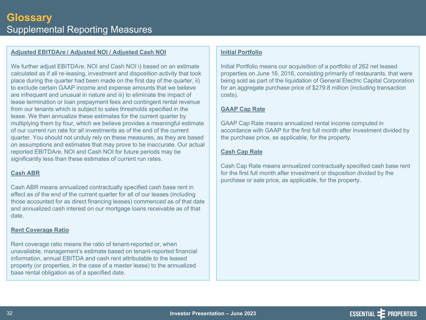 Investor Presentation – June 202331 Glossary Supplemental Reporting Measures We also present our earnings before interest, taxes and depreciation and amortization for real estate (“EBITDA”), EBITDA further adjusted to exclude gains (or losses) on sales of depreciable property and real estate impairment losses (“EBITDAre”), net debt, net operating income (“NOI”) and cash NOI (“Cash NOI”), all of which are non-GAAP financial measures. We believe these non-GAAP financial measures are accepted industry measures used by analysts and investors to compare the operating performance of REITs. EBITDA and EBITDAre We compute EBITDA as earnings before interest, income taxes and depreciation and amortization. In 2017, NAREIT issued a white paper recommending that companies that report EBITDA also report EBITDAre. We compute EBITDAre in accordance with the definition adopted by NAREIT. NAREIT defines EBITDAre as EBITDA (as defined above) excluding gains (or losses) from the sales of depreciable property and real estate impairment losses. We present EBITDA and EBITDAre as they are measures commonly used in our industry and we believe that these measures are useful to investors and analysts because they provide important supplemental information concerning our operating performance, exclusive of certain non-cash and other costs. We use EBITDA and EBITDAre as measures of our operating performance and not as measures of liquidity. EBITDA and EBITDAre do not include all items of revenue and expense included in net income, they do not represent cash generated from operating activities and they are not necessarily indicative of cash available to fund cash requirements; accordingly, the should not be considered alternatives to net income as a performance measure or cash flows from operations as a liquidity measure and should be considered in addition to, and not in lieu of, GAAP financial measures. Additionally, our computation of EBITDA and EBITDAre may differ from the methodology for calculating these metrics used by other equity REITs and, therefore, may not be comparable to similarly titled measures reported by other equity REITs. Net Debt We calculate our net debt as our gross debt (defined as total debt plus net deferred financing costs on our secured borrowings) less cash and cash equivalents and restricted cash available for future investment. We believe excluding cash and cash equivalents and restricted cash available for future investment, all of which could be used to repay debt, provides an estimate of the net contractual amount of borrowed capital to be repaid, which we believe is a beneficial disclosure to investors and analysts. NOI and Cash NOI We compute NOI as total revenues less property expenses. NOI excludes all other items of expense and income included in the financial statements in calculating net income or loss. Cash NOI further excludes non-cash items included in total revenues and property expenses, such as straight- line rental revenue and other amortization and non-cash charges. We believe NOI and Cash NOI provide useful and relevant information because they reflect only those income and expense items that are incurred at the property level and present such items on an unlevered basis. NOI and Cash NOI are not measurements of financial performance under GAAP. You should not consider our NOI and Cash NOI as alternatives to net income or cash flows from operating activities determined in accordance with GAAP. Additionally, our computation of NOI and Cash NOI may differ from the methodology for calculating these metrics used by other equity REITs and, therefore, may not be comparable to similarly titled measures reported by other equity REITs.