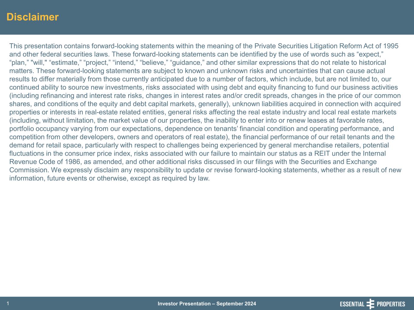 Investor Presentation – September 20241 Disclaimer This presentation contains forward-looking statements within the meaning of the Private Securities Litigation Reform Act of 1995 and other federal securities laws. These forward-looking statements can be identified by the use of words such as “expect,” “plan,” "will," “estimate,” “project,” “intend,” “believe,” “guidance,” and other similar expressions that do not relate to historical matters. These forward-looking statements are subject to known and unknown risks and uncertainties that can cause actual results to differ materially from those currently anticipated due to a number of factors, which include, but are not limited to, our continued ability to source new investments, risks associated with using debt and equity financing to fund our business activities (including refinancing and interest rate risks, changes in interest rates and/or credit spreads, changes in the price of our common shares, and conditions of the equity and debt capital markets, generally), unknown liabilities acquired in connection with acquired properties or interests in real-estate related entities, general risks affecting the real estate industry and local real estate markets (including, without limitation, the market value of our properties, the inability to enter into or renew leases at favorable rates, portfolio occupancy varying from our expectations, dependence on tenants’ financial condition and operating performance, and competition from other developers, owners and operators of real estate), the financial performance of our retail tenants and the demand for retail space, particularly with respect to challenges being experienced by general merchandise retailers, potential fluctuations in the consumer price index, risks associated with our failure to maintain our status as a REIT under the Internal Revenue Code of 1986, as amended, and other additional risks discussed in our filings with the Securities and Exchange Commission. We expressly disclaim any responsibility to update or revise forward-looking statements, whether as a result of new information, future events or otherwise, except as required by law.