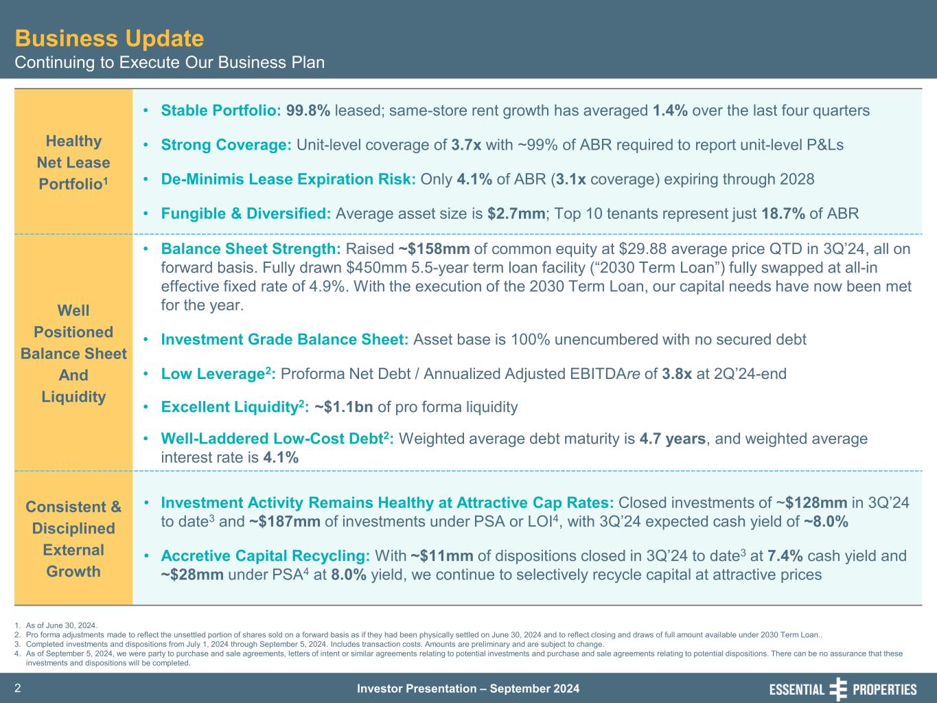 Investor Presentation – September 20242 Healthy Net Lease Portfolio1 • Stable Portfolio: 99.8% leased; same-store rent growth has averaged 1.4% over the last four quarters • Strong Coverage: Unit-level coverage of 3.7x with ~99% of ABR required to report unit-level P&Ls • De-Minimis Lease Expiration Risk: Only 4.1% of ABR (3.1x coverage) expiring through 2028 • Fungible & Diversified: Average asset size is $2.7mm; Top 10 tenants represent just 18.7% of ABR Well Positioned Balance Sheet And Liquidity • Balance Sheet Strength: Raised ~$158mm of common equity at $29.88 average price QTD in 3Q’24, all on forward basis. Fully drawn $450mm 5.5-year term loan facility (“2030 Term Loan”) fully swapped at all-in effective fixed rate of 4.9%. With the execution of the 2030 Term Loan, our capital needs have now been met for the year. • Investment Grade Balance Sheet: Asset base is 100% unencumbered with no secured debt • Low Leverage2: Proforma Net Debt / Annualized Adjusted EBITDAre of 3.8x at 2Q’24-end • Excellent Liquidity2: ~$1.1bn of pro forma liquidity • Well-Laddered Low-Cost Debt2: Weighted average debt maturity is 4.7 years, and weighted average interest rate is 4.1% Consistent & Disciplined External Growth • Investment Activity Remains Healthy at Attractive Cap Rates: Closed investments of ~$128mm in 3Q’24 to date3 and ~$187mm of investments under PSA or LOI4, with 3Q’24 expected cash yield of ~8.0% • Accretive Capital Recycling: With ~$11mm of dispositions closed in 3Q’24 to date3 at 7.4% cash yield and ~$28mm under PSA4 at 8.0% yield, we continue to selectively recycle capital at attractive prices 1. As of June 30, 2024. 2. Pro forma adjustments made to reflect the unsettled portion of shares sold on a forward basis as if they had been physically settled on June 30, 2024 and to reflect closing and draws of full amount available under 2030 Term Loan.. 3. Completed investments and dispositions from July 1, 2024 through September 5, 2024. Includes transaction costs. Amounts are preliminary and are subject to change. 4. As of September 5, 2024, we were party to purchase and sale agreements, letters of intent or similar agreements relating to potential investments and purchase and sale agreements relating to potential dispositions. There can be no assurance that these investments and dispositions will be completed. Business Update Continuing to Execute Our Business Plan