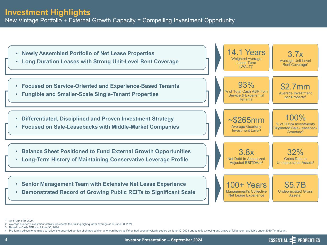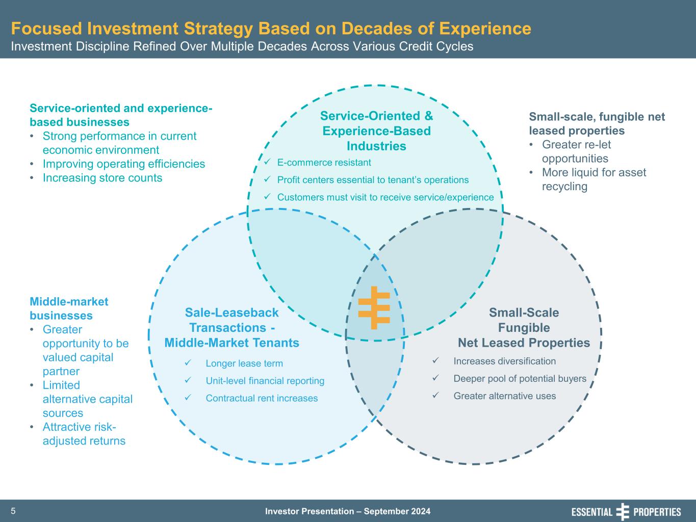 Investor Presentation – September 20244 Investment Highlights • Newly Assembled Portfolio of Net Lease Properties • Long Duration Leases with Strong Unit-Level Rent Coverage • Focused on Service-Oriented and Experience-Based Tenants • Fungible and Smaller-Scale Single-Tenant Properties • Differentiated, Disciplined and Proven Investment Strategy • Focused on Sale-Leasebacks with Middle-Market Companies • Balance Sheet Positioned to Fund External Growth Opportunities • Long-Term History of Maintaining Conservative Leverage Profile • Senior Management Team with Extensive Net Lease Experience • Demonstrated Record of Growing Public REITs to Significant Scale 1. As of June 30, 2024. 2. Average quarterly investment activity represents the trailing eight quarter average as of June 30, 2024. 3. Based on Cash ABR as of June 30, 2024. 4. Pro forma adjustments made to reflect the unsettled portion of shares sold on a forward basis as if they had been physically settled on June 30, 2024 and to reflect closing and draws of full amount available under 2030 Term Loan.. New Vintage Portfolio + External Growth Capacity = Compelling Investment Opportunity 14.1 Years Weighted Average Lease Term (WALT)1 3.7x Average Unit-Level Rent Coverage1 93% % of Total Cash ABR from Service & Experiential Tenants1 $2.7mm Average Investment per Property1 ~$265mm Average Quarterly Investment Level2 100% % of 2Q’24 Investments Originated Sale-Leaseback Structure3 3.8x Net Debt to Annualized Adjusted EBITDAre4 32% Gross Debt to Undepreciated Assets4 100+ Years Management’s Collective Net Lease Experience $5.7B Undepreciated Gross Assets1