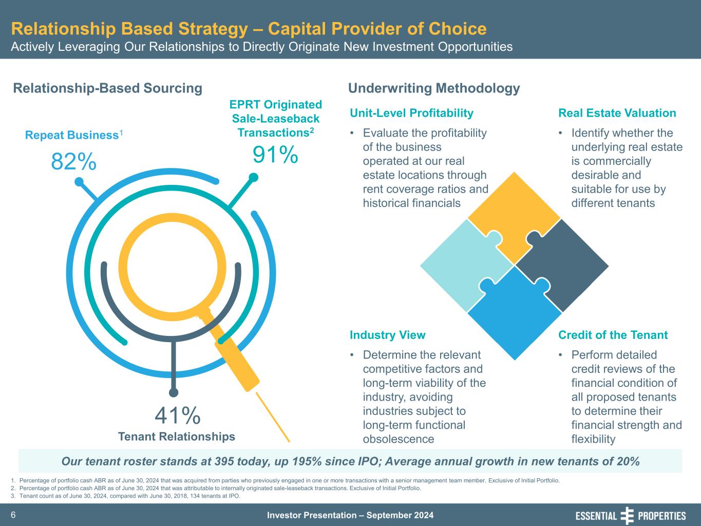Investor Presentation – September 20245 Focused Investment Strategy Based on Decades of Experience Investment Discipline Refined Over Multiple Decades Across Various Credit Cycles Service-Oriented & Experience-Based Industries Sale-Leaseback Transactions - Middle-Market Tenants Small-Scale Fungible Net Leased Properties  E-commerce resistant  Profit centers essential to tenant’s operations  Customers must visit to receive service/experience  Longer lease term  Unit-level financial reporting  Contractual rent increases  Increases diversification  Deeper pool of potential buyers  Greater alternative uses Small-scale, fungible net leased properties • Greater re-let opportunities • More liquid for asset recycling Service-oriented and experience- based businesses • Strong performance in current economic environment • Improving operating efficiencies • Increasing store counts Middle-market businesses • Greater opportunity to be valued capital partner • Limited alternative capital sources • Attractive risk- adjusted returns