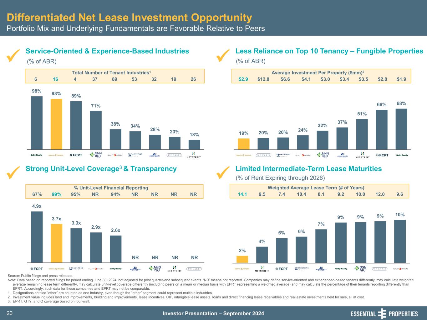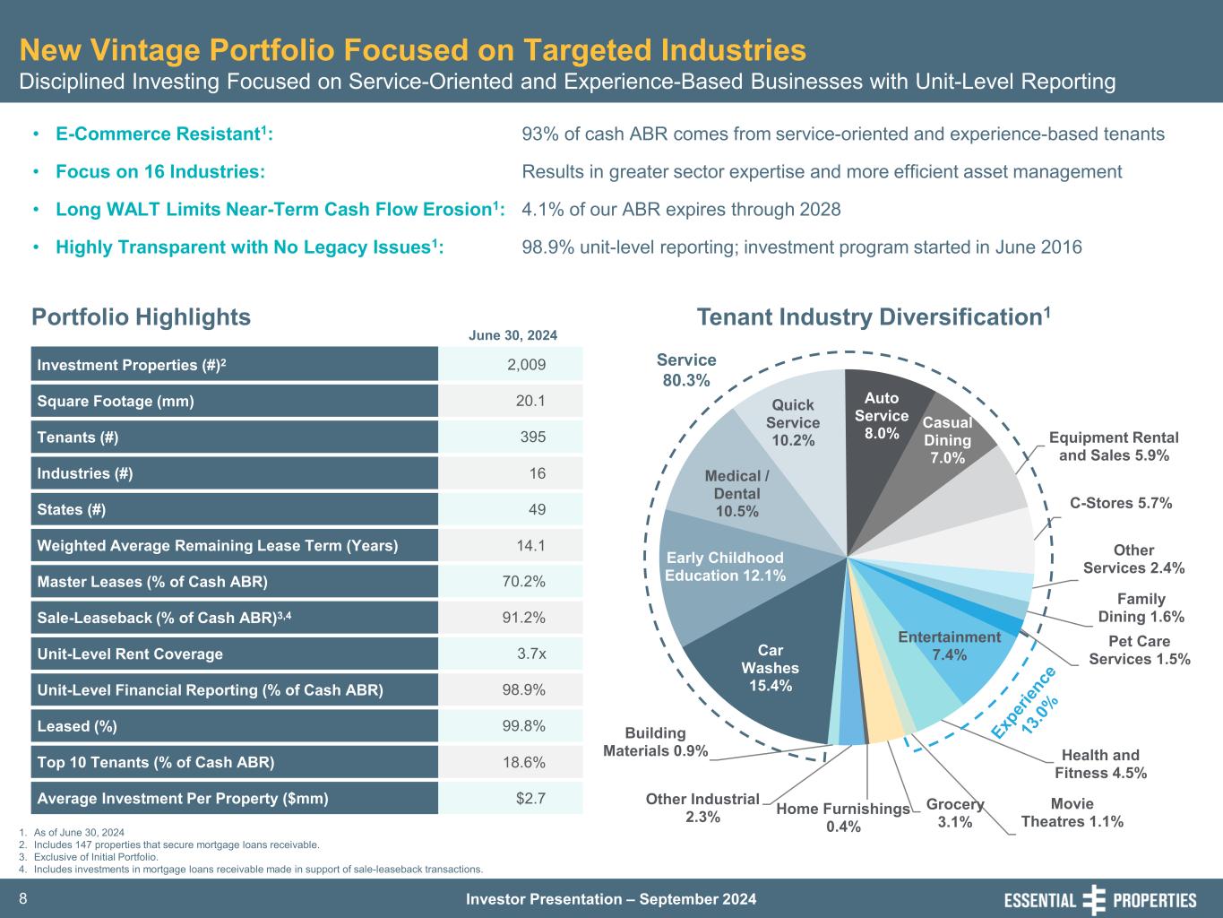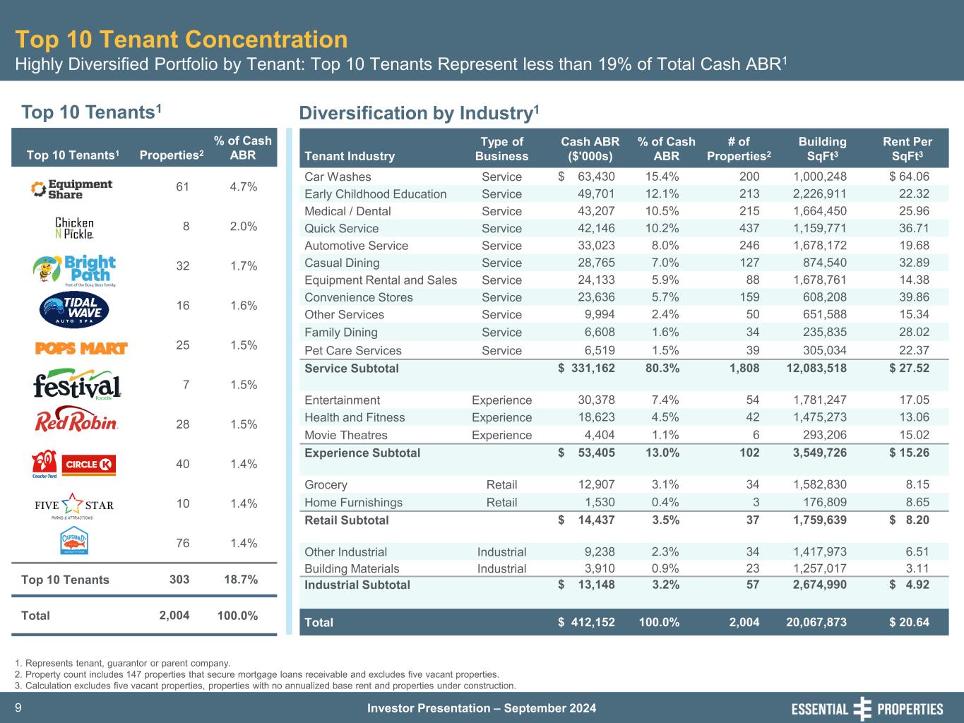 Investor Presentation – September 20248 New Vintage Portfolio Focused on Targeted Industries Disciplined Investing Focused on Service-Oriented and Experience-Based Businesses with Unit-Level Reporting 1. As of June 30, 2024 2. Includes 147 properties that secure mortgage loans receivable. 3. Exclusive of Initial Portfolio. 4. Includes investments in mortgage loans receivable made in support of sale-leaseback transactions. Portfolio Highlights June 30, 2024 Tenant Industry Diversification1 • E-Commerce Resistant1: • Focus on 16 Industries: • Long WALT Limits Near-Term Cash Flow Erosion1: • Highly Transparent with No Legacy Issues1: Investment Properties (#)2 2,009 Square Footage (mm) 20.1 Tenants (#) 395 Industries (#) 16 States (#) 49 Weighted Average Remaining Lease Term (Years) 14.1 Master Leases (% of Cash ABR) 70.2% Sale-Leaseback (% of Cash ABR)3,4 91.2% Unit-Level Rent Coverage 3.7x Unit-Level Financial Reporting (% of Cash ABR) 98.9% Leased (%) 99.8% Top 10 Tenants (% of Cash ABR) 18.6% Average Investment Per Property ($mm) $2.7 93% of cash ABR comes from service-oriented and experience-based tenants Results in greater sector expertise and more efficient asset management 4.1% of our ABR expires through 2028 98.9% unit-level reporting; investment program started in June 2016 Car Washes 15.4% Early Childhood Education 12.1% Medical / Dental 10.5% Quick Service 10.2% Auto Service 8.0% Casual Dining 7.0% Equipment Rental and Sales 5.9% C-Stores 5.7% Other Services 2.4% Family Dining 1.6% Pet Care Services 1.5% Entertainment 7.4% Health and Fitness 4.5% Movie Theatres 1.1% Grocery 3.1% Home Furnishings 0.4% Other Industrial 2.3% Building Materials 0.9% Service 80.3%