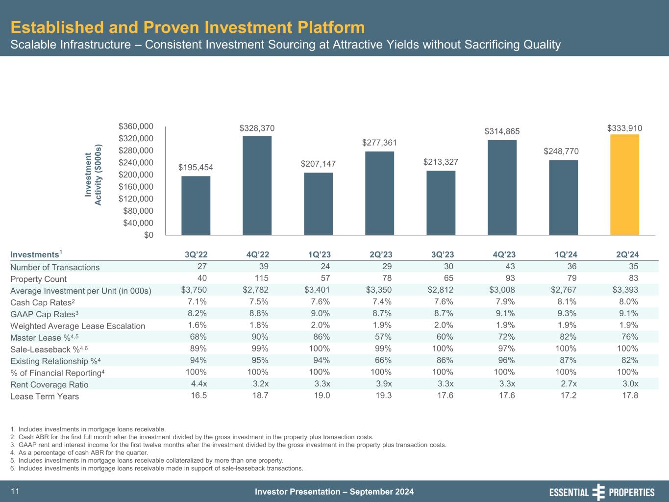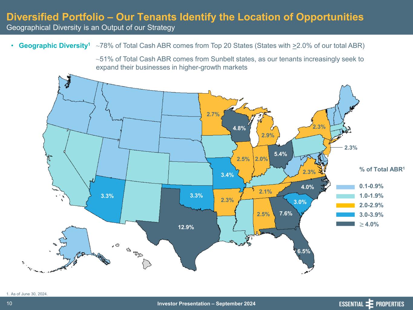 Investor Presentation – September 202410 Diversified Portfolio – Our Tenants Identify the Location of Opportunities Geographical Diversity is an Output of our Strategy • Geographic Diversity1 ~78% of Total Cash ABR comes from Top 20 States (States with >2.0% of our total ABR) ~51% of Total Cash ABR comes from Sunbelt states, as our tenants increasingly seek to expand their businesses in higher-growth markets % of Total ABR1 0.1-0.9% 1.0-1.9% 2.0-2.9% 3.0-3.9% ≥ 4.0% 2.3% 2.3% 12.9% 3.3% 3.4% 2.7% 4.8% 2.9% 2.5% 3.3% 2.3% 5.4% 2.3% 4.0% 7.6%2.5% 6.5% 2.1% 2.0% 3.0% 1. As of June 30, 2024.