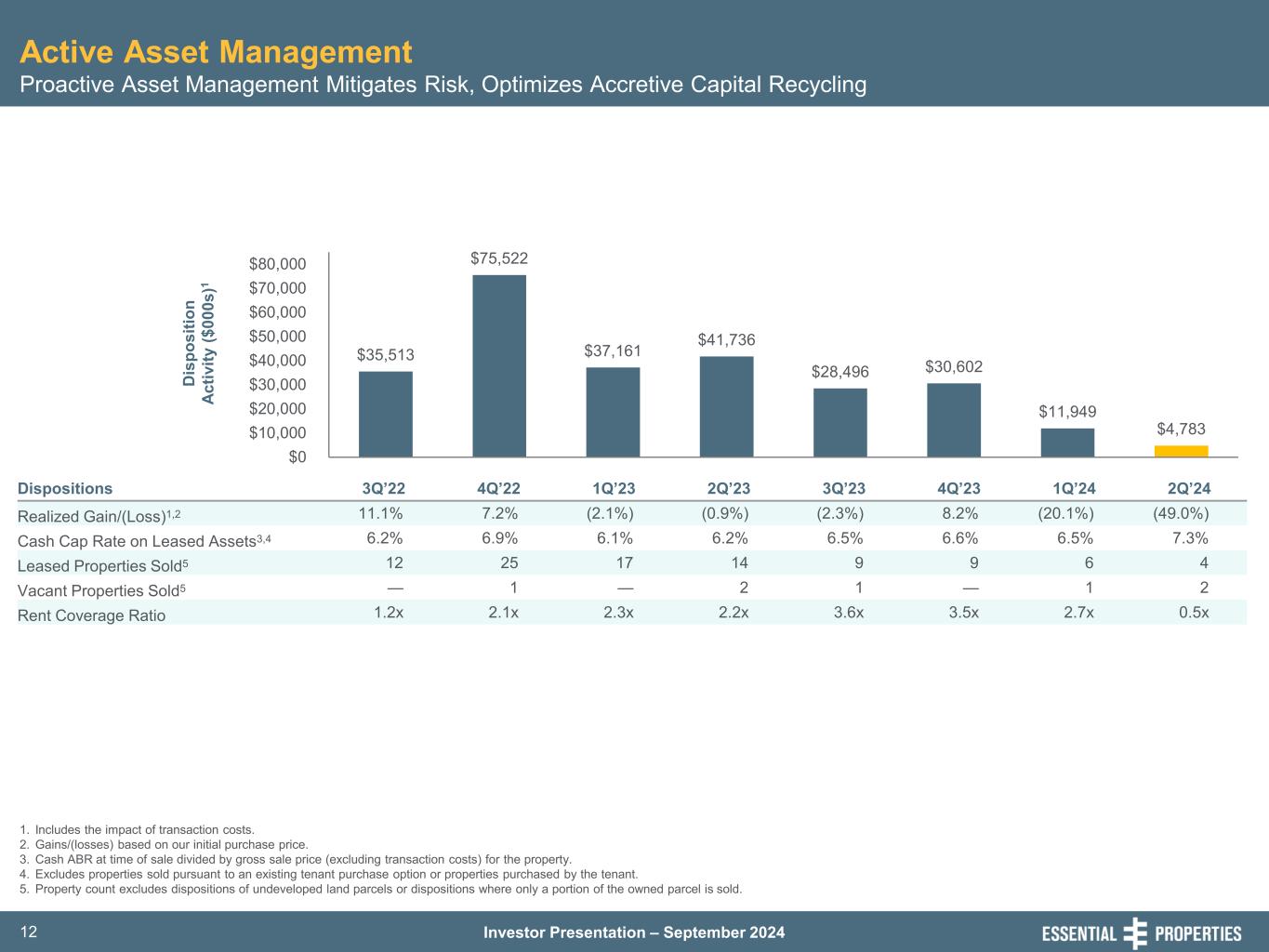 Investor Presentation – September 202411 Established and Proven Investment Platform Scalable Infrastructure – Consistent Investment Sourcing at Attractive Yields without Sacrificing Quality 1. Includes investments in mortgage loans receivable. 2. Cash ABR for the first full month after the investment divided by the gross investment in the property plus transaction costs. 3. GAAP rent and interest income for the first twelve months after the investment divided by the gross investment in the property plus transaction costs. 4. As a percentage of cash ABR for the quarter. 5. Includes investments in mortgage loans receivable collateralized by more than one property. 6. Includes investments in mortgage loans receivable made in support of sale-leaseback transactions. Investments1 3Q’22 4Q’22 1Q’23 2Q’23 3Q’23 4Q’23 1Q’24 2Q’24 Number of Transactions 27 39 24 29 30 43 36 35 Property Count 40 115 57 78 65 93 79 83 Average Investment per Unit (in 000s) $3,750 $2,782 $3,401 $3,350 $2,812 $3,008 $2,767 $3,393 Cash Cap Rates2 7.1% 7.5% 7.6% 7.4% 7.6% 7.9% 8.1% 8.0% GAAP Cap Rates3 8.2% 8.8% 9.0% 8.7% 8.7% 9.1% 9.3% 9.1% Weighted Average Lease Escalation 1.6% 1.8% 2.0% 1.9% 2.0% 1.9% 1.9% 1.9% Master Lease %4,5 68% 90% 86% 57% 60% 72% 82% 76% Sale-Leaseback %4,6 89% 99% 100% 99% 100% 97% 100% 100% Existing Relationship %4 94% 95% 94% 66% 86% 96% 87% 82% % of Financial Reporting4 100% 100% 100% 100% 100% 100% 100% 100% Rent Coverage Ratio 4.4x 3.2x 3.3x 3.9x 3.3x 3.3x 2.7x 3.0x Lease Term Years 16.5 18.7 19.0 19.3 17.6 17.6 17.2 17.8 $195,454 $328,370 $207,147 $277,361 $213,327 $314,865 $248,770 $333,910 $0 $40,000 $80,000 $120,000 $160,000 $200,000 $240,000 $280,000 $320,000 $360,000 In ve st m en t Ac tiv ity ($ 00 0s )