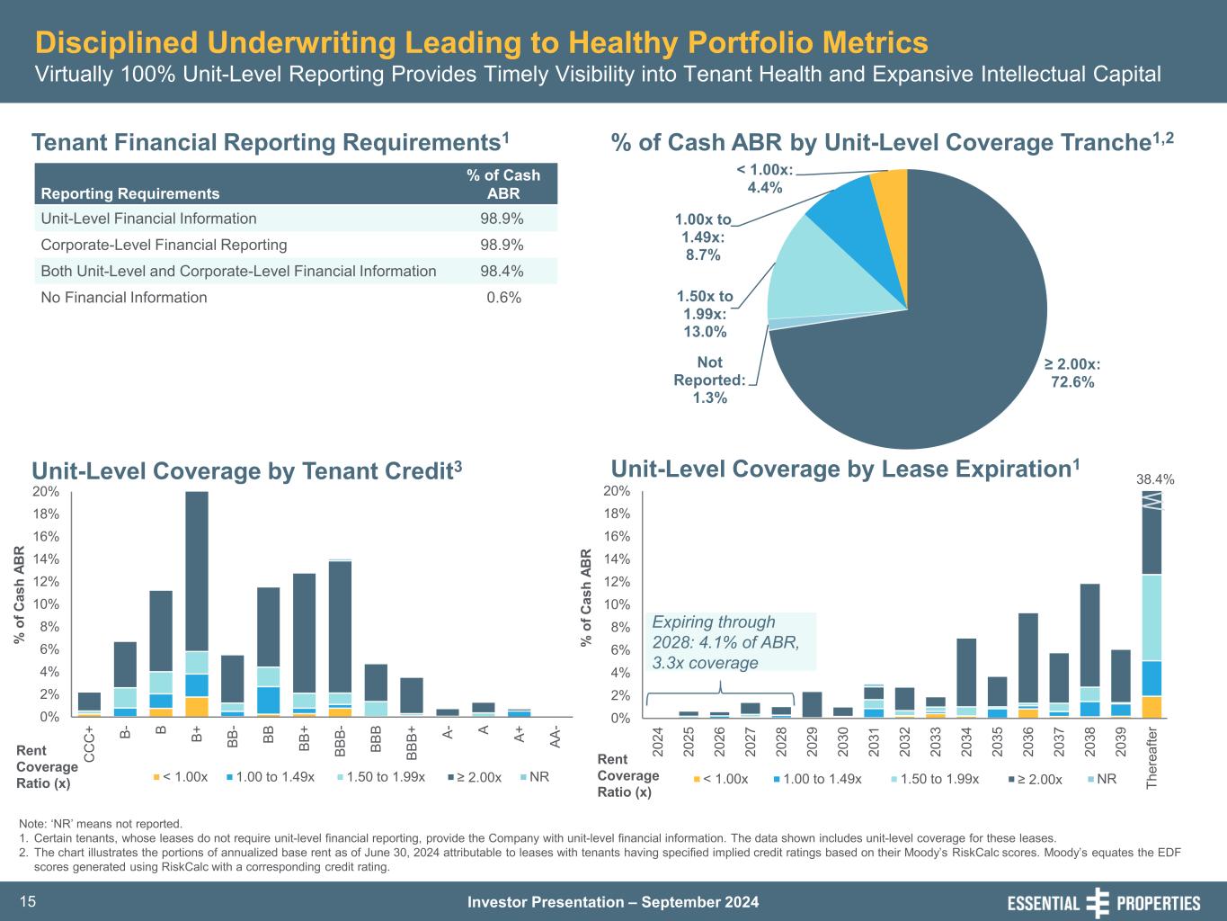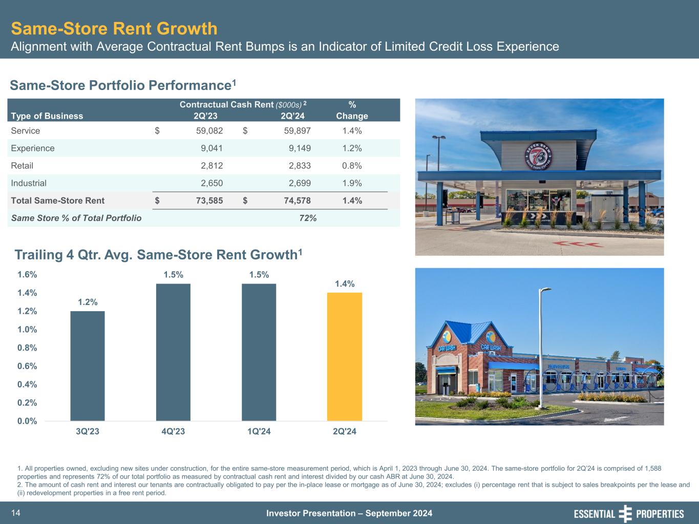 Investor Presentation – September 202414 Same-Store Rent Growth Alignment with Average Contractual Rent Bumps is an Indicator of Limited Credit Loss Experience Same-Store Portfolio Performance1 Trailing 4 Qtr. Avg. Same-Store Rent Growth1 Contractual Cash Rent ($000s) 2 % Type of Business 2Q’23 2Q’24 Change Service $ 59,082 $ 59,897 1.4% Experience 9,041 9,149 1.2% Retail 2,812 2,833 0.8% Industrial 2,650 2,699 1.9% Total Same-Store Rent $ 73,585 $ 74,578 1.4% Same Store % of Total Portfolio 72% 1.2% 1.5% 1.5% 1.4% 0.0% 0.2% 0.4% 0.6% 0.8% 1.0% 1.2% 1.4% 1.6% 3Q'23 4Q'23 1Q'24 2Q'24 1. All properties owned, excluding new sites under construction, for the entire same-store measurement period, which is April 1, 2023 through June 30, 2024. The same-store portfolio for 2Q’24 is comprised of 1,588 properties and represents 72% of our total portfolio as measured by contractual cash rent and interest divided by our cash ABR at June 30, 2024. 2. The amount of cash rent and interest our tenants are contractually obligated to pay per the in-place lease or mortgage as of June 30, 2024; excludes (i) percentage rent that is subject to sales breakpoints per the lease and (ii) redevelopment properties in a free rent period.