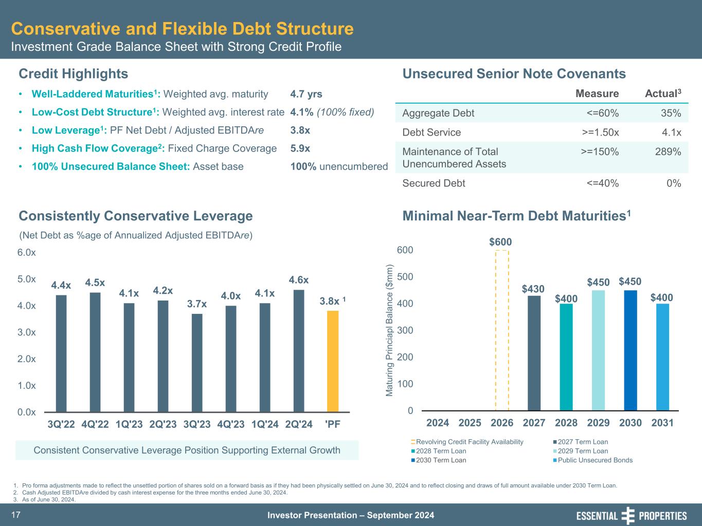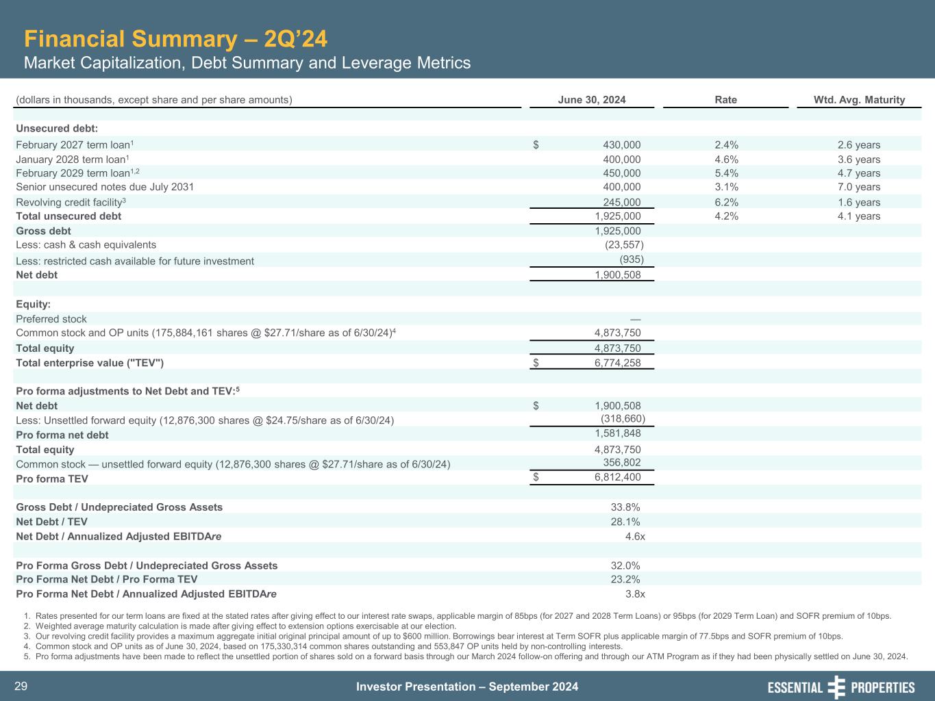 Investor Presentation – September 202429 Financial Summary – 2Q’24 Market Capitalization, Debt Summary and Leverage Metrics 1. Rates presented for our term loans are fixed at the stated rates after giving effect to our interest rate swaps, applicable margin of 85bps (for 2027 and 2028 Term Loans) or 95bps (for 2029 Term Loan) and SOFR premium of 10bps. 2. Weighted average maturity calculation is made after giving effect to extension options exercisable at our election. 3. Our revolving credit facility provides a maximum aggregate initial original principal amount of up to $600 million. Borrowings bear interest at Term SOFR plus applicable margin of 77.5bps and SOFR premium of 10bps. 4. Common stock and OP units as of June 30, 2024, based on 175,330,314 common shares outstanding and 553,847 OP units held by non-controlling interests. 5. Pro forma adjustments have been made to reflect the unsettled portion of shares sold on a forward basis through our March 2024 follow-on offering and through our ATM Program as if they had been physically settled on June 30, 2024. (dollars in thousands, except share and per share amounts) June 30, 2024 Rate Wtd. Avg. Maturity Unsecured debt: February 2027 term loan1 $ 430,000 2.4% 2.6 years January 2028 term loan1 400,000 4.6% 3.6 years February 2029 term loan1,2 450,000 5.4% 4.7 years Senior unsecured notes due July 2031 400,000 3.1% 7.0 years Revolving credit facility3 245,000 6.2% 1.6 years Total unsecured debt 1,925,000 4.2% 4.1 years Gross debt 1,925,000 Less: cash & cash equivalents (23,557) Less: restricted cash available for future investment (935) Net debt 1,900,508 Equity: Preferred stock — Common stock and OP units (175,884,161 shares @ $27.71/share as of 6/30/24)4 4,873,750 Total equity 4,873,750 Total enterprise value ("TEV") $ 6,774,258 Pro forma adjustments to Net Debt and TEV:5 Net debt $ 1,900,508 Less: Unsettled forward equity (12,876,300 shares @ $24.75/share as of 6/30/24) (318,660) Pro forma net debt 1,581,848 Total equity 4,873,750 Common stock — unsettled forward equity (12,876,300 shares @ $27.71/share as of 6/30/24) 356,802 Pro forma TEV $ 6,812,400 Gross Debt / Undepreciated Gross Assets 33.8% Net Debt / TEV 28.1% Net Debt / Annualized Adjusted EBITDAre 4.6x Pro Forma Gross Debt / Undepreciated Gross Assets 32.0% Pro Forma Net Debt / Pro Forma TEV 23.2% Pro Forma Net Debt / Annualized Adjusted EBITDAre 3.8x
