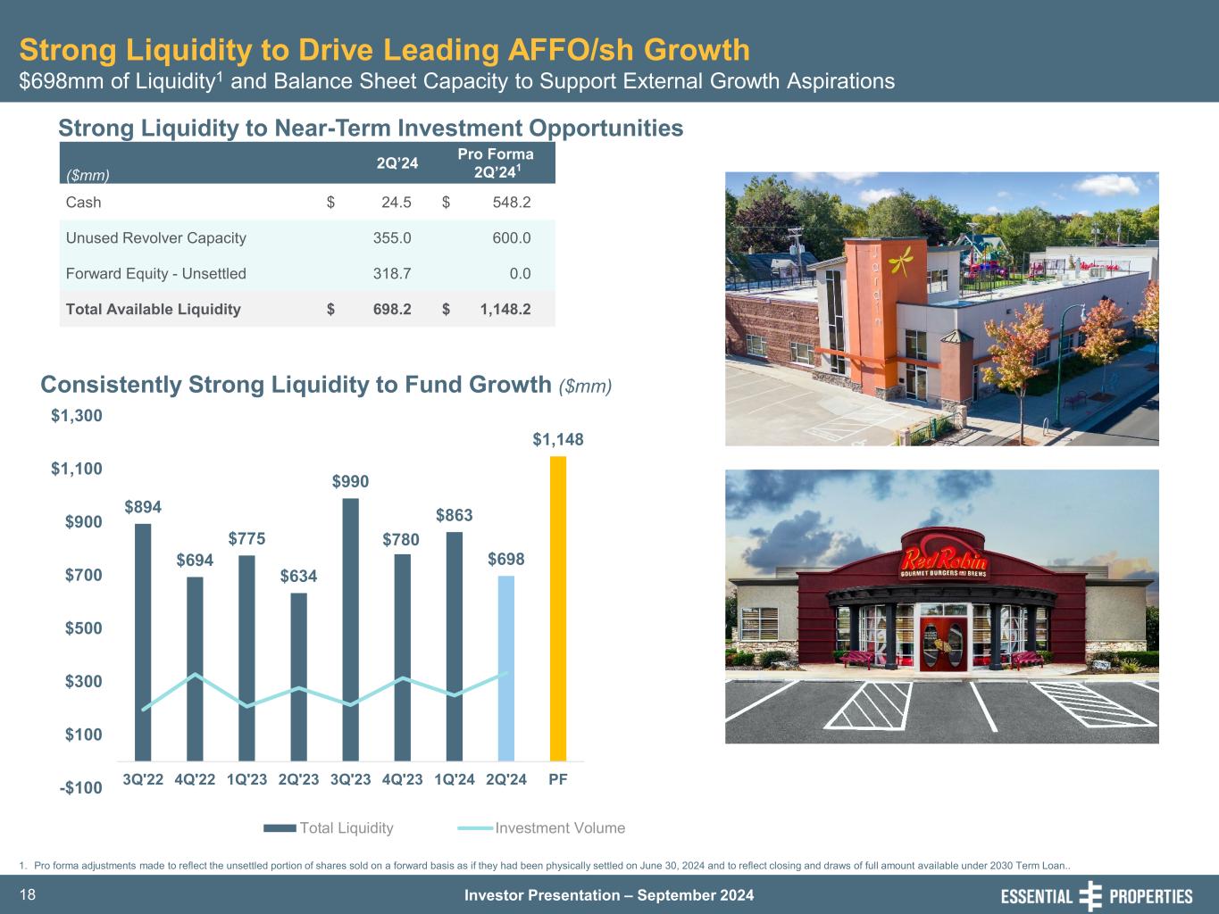 Investor Presentation – September 202417 $600 $430 $400 $450 $450 $400 0 100 200 300 400 500 600 2024 2025 2026 2027 2028 2029 2030 2031 M at ur in g Pr in ci ap l B al an ce ($ m m ) Revolving Credit Facility Availability 2027 Term Loan 2028 Term Loan 2029 Term Loan 2030 Term Loan Public Unsecured Bonds 4.4x 4.5x 4.1x 4.2x 3.7x 4.0x 4.1x 4.6x 3.8x 1 0.0x 1.0x 2.0x 3.0x 4.0x 5.0x 6.0x 3Q'22 4Q'22 1Q'23 2Q'23 3Q'23 4Q'23 1Q'24 2Q'24 'PF Measure Actual3 Aggregate Debt <=60% 35% Debt Service >=1.50x 4.1x Maintenance of Total Unencumbered Assets >=150% 289% Secured Debt <=40% 0% Conservative and Flexible Debt Structure Investment Grade Balance Sheet with Strong Credit Profile Minimal Near-Term Debt Maturities1 • Well-Laddered Maturities1: Weighted avg. maturity 4.7 yrs • Low-Cost Debt Structure1: Weighted avg. interest rate 4.1% (100% fixed) • Low Leverage1: PF Net Debt / Adjusted EBITDAre 3.8x • High Cash Flow Coverage2: Fixed Charge Coverage 5.9x • 100% Unsecured Balance Sheet: Asset base 100% unencumbered 1. Pro forma adjustments made to reflect the unsettled portion of shares sold on a forward basis as if they had been physically settled on June 30, 2024 and to reflect closing and draws of full amount available under 2030 Term Loan. 2. Cash Adjusted EBITDAre divided by cash interest expense for the three months ended June 30, 2024. 3. As of June 30, 2024. (Net Debt as %age of Annualized Adjusted EBITDAre) Consistently Conservative Leverage Consistent Conservative Leverage Position Supporting External Growth Credit Highlights Unsecured Senior Note Covenants