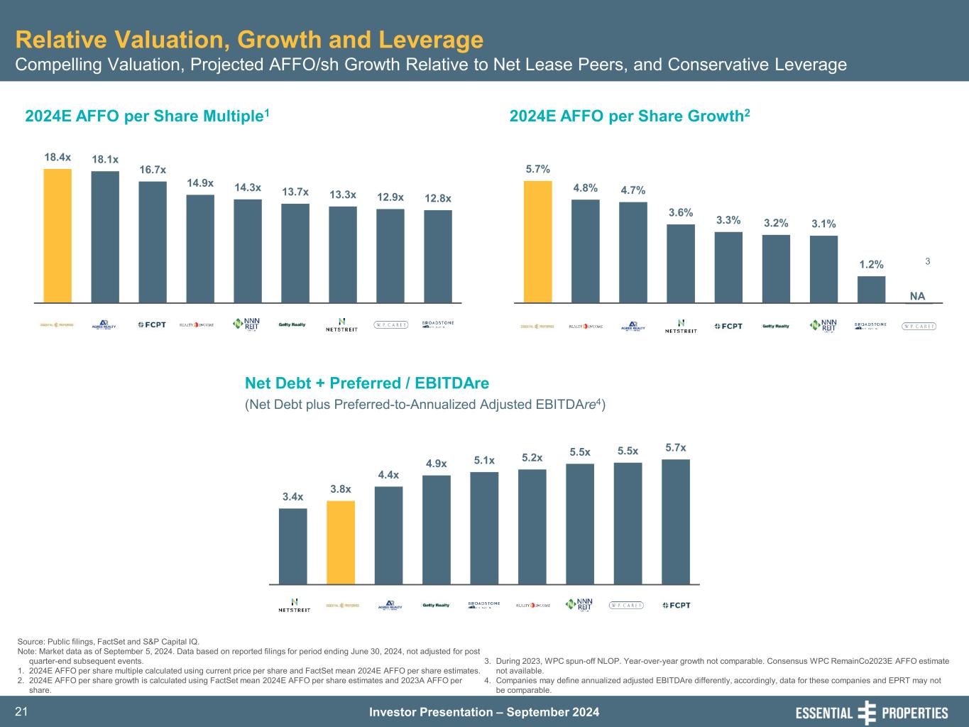Investor Presentation – September 202420 Differentiated Net Lease Investment Opportunity Portfolio Mix and Underlying Fundamentals are Favorable Relative to Peers Strong Unit-Level Coverage3 & Transparency Service-Oriented & Experience-Based Industries Limited Intermediate-Term Lease Maturities   Source: Public filings and press releases. Note: Data based on reported filings for period ending June 30, 2024, not adjusted for post quarter-end subsequent events. ‘NR’ means not reported. Companies may define service-oriented and experienced-based tenants differently, may calculate weighted average remaining lease term differently, may calculate unit-level coverage differently (including peers on a mean or median basis with EPRT representing a weighted average) and may calculate the percentage of their tenants reporting differently than EPRT. Accordingly, such data for these companies and EPRT may not be comparable. 1. Designations entitled “other” are counted as one industry, even though the “other” segment could represent multiple industries. 2. Investment value includes land and improvements, building and improvements, lease incentives, CIP, intangible lease assets, loans and direct financing lease receivables and real estate investments held for sale, all at cost. 3. EPRT, GTY, and O coverage based on four-wall. (% of ABR) (% of Rent Expiring through 2026) Less Reliance on Top 10 Tenancy – Fungible Properties  (% of ABR) 6 Total Number of Tenant Industries1 16 4 37 89 53 32 19 26 67% % Unit-Level Financial Reporting 95% NR 94% NR NR99% NR NR $2.9 Average Investment Per Property ($mm)2 $12.8 $6.6 $4.1 $3.0 $3.4 $3.5 $2.8 $1.9 14.1 Weighted Average Lease Term (# of Years) 9.5 7.4 10.4 8.1 9.2 10.0 12.0 9.6 2% 4% 6% 6% 7% 9% 9% 9% 10% 98% 93% 89% 71% 38% 34% 28% 23% 18% 4.9x 3.7x 3.3x 2.9x 2.6x NR NR NR NR 68% 66% 51% 37% 32% 24% 20% 20% 19%
