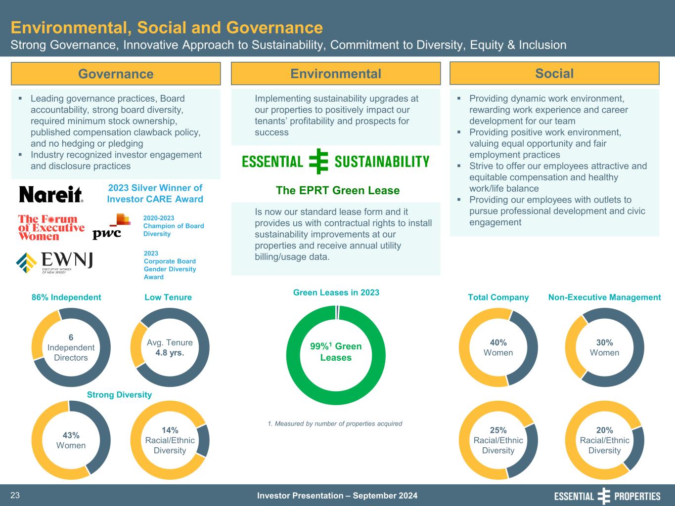 Investor Presentation – September 202423 Governance  Leading governance practices, Board accountability, strong board diversity, required minimum stock ownership, published compensation clawback policy, and no hedging or pledging  Industry recognized investor engagement and disclosure practices Environmental, Social and Governance Strong Governance, Innovative Approach to Sustainability, Commitment to Diversity, Equity & Inclusion Environmental Social Implementing sustainability upgrades at our properties to positively impact our tenants’ profitability and prospects for success  Providing dynamic work environment, rewarding work experience and career development for our team  Providing positive work environment, valuing equal opportunity and fair employment practices  Strive to offer our employees attractive and equitable compensation and healthy work/life balance  Providing our employees with outlets to pursue professional development and civic engagement 25% Racial/Ethnic Diversity 40% Women 30% Women 20% Racial/Ethnic Diversity Total Company Non-Executive Management 99%1 Green Leases 1. Measured by number of properties acquired 2020-2023 Champion of Board Diversity Avg. Tenure 4.8 yrs. 6 Independent Directors 43% Women 14% Racial/Ethnic Diversity Green Leases in 202386% Independent Low Tenure Strong Diversity 2023 Silver Winner of Investor CARE Award Is now our standard lease form and it provides us with contractual rights to install sustainability improvements at our properties and receive annual utility billing/usage data. The EPRT Green Lease 2023 Corporate Board Gender Diversity Award