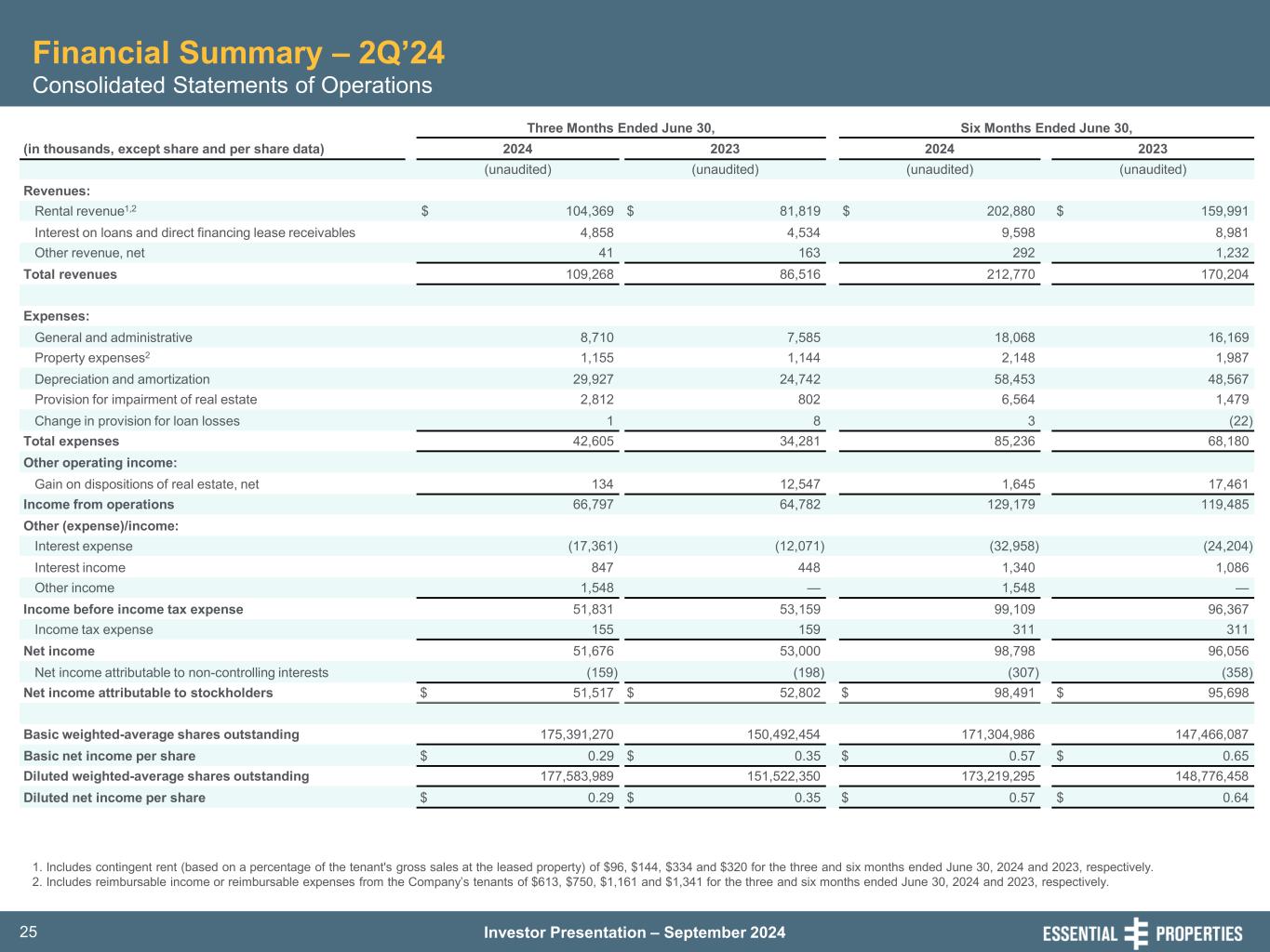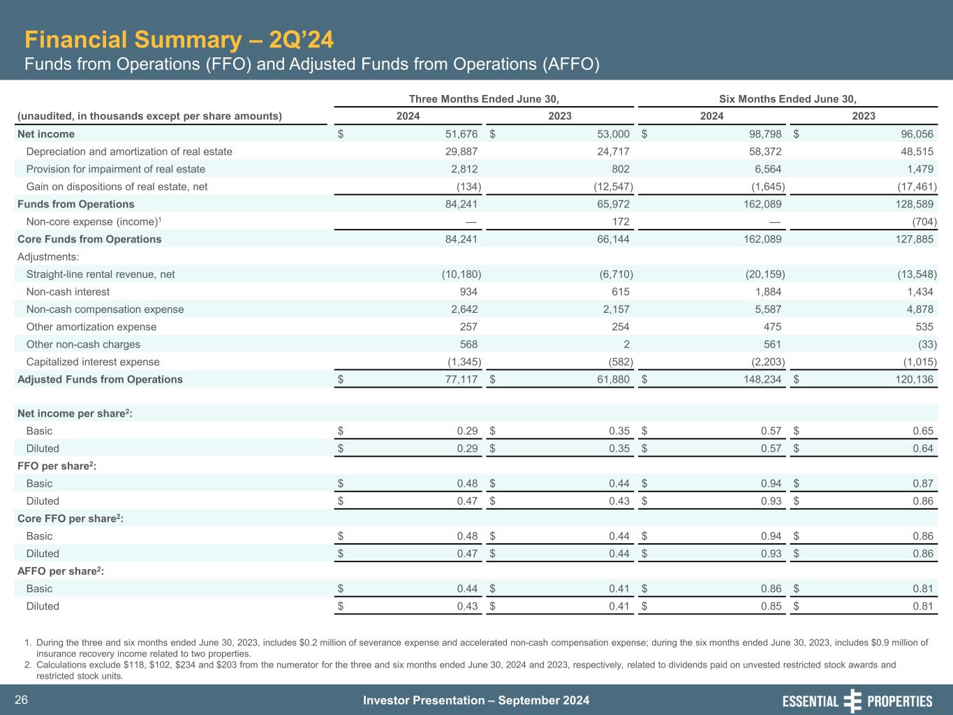 Investor Presentation – September 202425 Financial Summary – 2Q’24 Consolidated Statements of Operations 1. Includes contingent rent (based on a percentage of the tenant's gross sales at the leased property) of $96, $144, $334 and $320 for the three and six months ended June 30, 2024 and 2023, respectively. 2. Includes reimbursable income or reimbursable expenses from the Company’s tenants of $613, $750, $1,161 and $1,341 for the three and six months ended June 30, 2024 and 2023, respectively. Three Months Ended June 30, Six Months Ended June 30, (in thousands, except share and per share data) 2024 2023 2024 2023 (unaudited) (unaudited) (unaudited) (unaudited) Revenues: Rental revenue1,2 $ 104,369 $ 81,819 $ 202,880 $ 159,991 Interest on loans and direct financing lease receivables 4,858 4,534 9,598 8,981 Other revenue, net 41 163 292 1,232 Total revenues 109,268 86,516 212,770 170,204 Expenses: General and administrative 8,710 7,585 18,068 16,169 Property expenses2 1,155 1,144 2,148 1,987 Depreciation and amortization 29,927 24,742 58,453 48,567 Provision for impairment of real estate 2,812 802 6,564 1,479 Change in provision for loan losses 1 8 3 (22) Total expenses 42,605 34,281 85,236 68,180 Other operating income: Gain on dispositions of real estate, net 134 12,547 1,645 17,461 Income from operations 66,797 64,782 129,179 119,485 Other (expense)/income: Interest expense (17,361) (12,071) (32,958) (24,204) Interest income 847 448 1,340 1,086 Other income 1,548 — 1,548 — Income before income tax expense 51,831 53,159 99,109 96,367 Income tax expense 155 159 311 311 Net income 51,676 53,000 98,798 96,056 Net income attributable to non-controlling interests (159) (198) (307) (358) Net income attributable to stockholders $ 51,517 $ 52,802 $ 98,491 $ 95,698 Basic weighted-average shares outstanding 175,391,270 150,492,454 171,304,986 147,466,087 Basic net income per share $ 0.29 $ 0.35 $ 0.57 $ 0.65 Diluted weighted-average shares outstanding 177,583,989 151,522,350 173,219,295 148,776,458 Diluted net income per share $ 0.29 $ 0.35 $ 0.57 $ 0.64