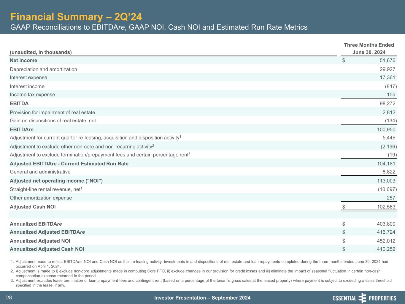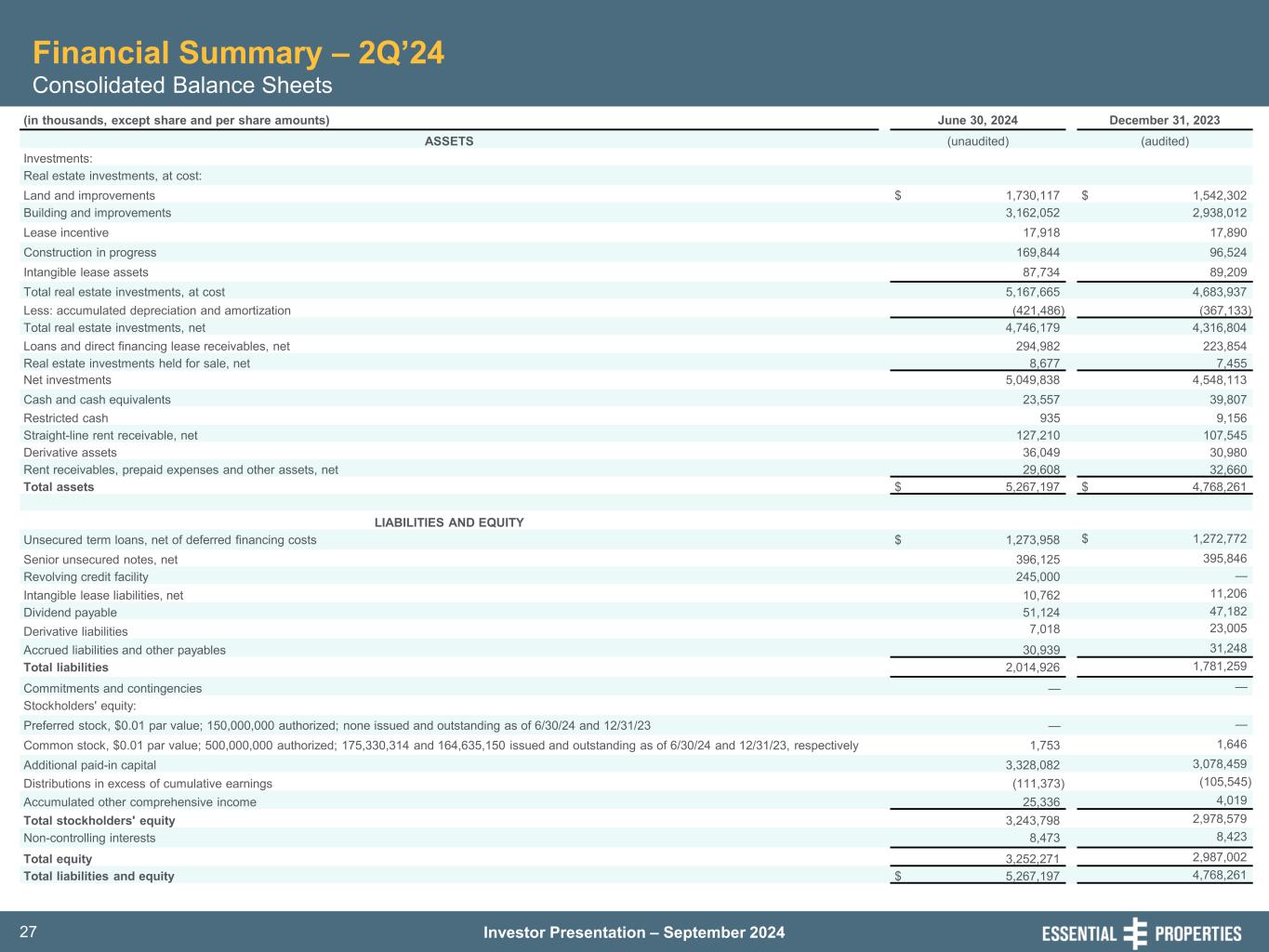 Investor Presentation – September 202427 Financial Summary – 2Q’24 Consolidated Balance Sheets (in thousands, except share and per share amounts) June 30, 2024 December 31, 2023 ASSETS (unaudited) (audited) Investments: Real estate investments, at cost: Land and improvements $ 1,730,117 $ 1,542,302 Building and improvements 3,162,052 2,938,012 Lease incentive 17,918 17,890 Construction in progress 169,844 96,524 Intangible lease assets 87,734 89,209 Total real estate investments, at cost 5,167,665 4,683,937 Less: accumulated depreciation and amortization (421,486) (367,133) Total real estate investments, net 4,746,179 4,316,804 Loans and direct financing lease receivables, net 294,982 223,854 Real estate investments held for sale, net 8,677 7,455 Net investments 5,049,838 4,548,113 Cash and cash equivalents 23,557 39,807 Restricted cash 935 9,156 Straight-line rent receivable, net 127,210 107,545 Derivative assets 36,049 30,980 Rent receivables, prepaid expenses and other assets, net 29,608 32,660 Total assets $ 5,267,197 $ 4,768,261 LIABILITIES AND EQUITY Unsecured term loans, net of deferred financing costs $ 1,273,958 $ 1,272,772 Senior unsecured notes, net 396,125 395,846 Revolving credit facility 245,000 — Intangible lease liabilities, net 10,762 11,206 Dividend payable 51,124 47,182 Derivative liabilities 7,018 23,005 Accrued liabilities and other payables 30,939 31,248 Total liabilities 2,014,926 1,781,259 Commitments and contingencies — — Stockholders' equity: Preferred stock, $0.01 par value; 150,000,000 authorized; none issued and outstanding as of 6/30/24 and 12/31/23 — — Common stock, $0.01 par value; 500,000,000 authorized; 175,330,314 and 164,635,150 issued and outstanding as of 6/30/24 and 12/31/23, respectively 1,753 1,646 Additional paid-in capital 3,328,082 3,078,459 Distributions in excess of cumulative earnings (111,373) (105,545) Accumulated other comprehensive income 25,336 4,019 Total stockholders' equity 3,243,798 2,978,579 Non-controlling interests 8,473 8,423 Total equity 3,252,271 2,987,002 Total liabilities and equity $ 5,267,197 4,768,261