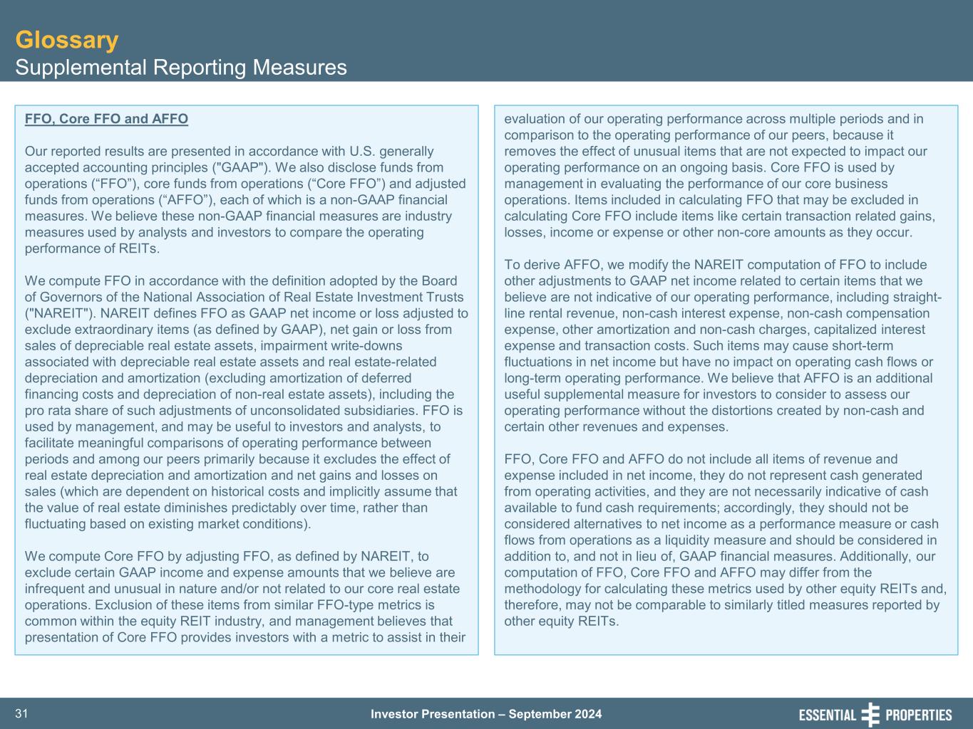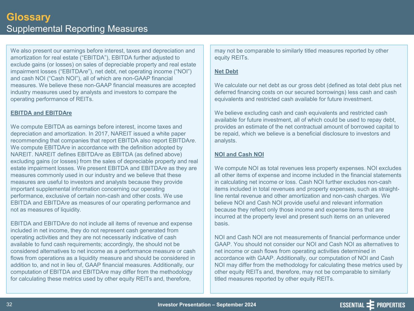 Investor Presentation – September 202431 Glossary Supplemental Reporting Measures FFO, Core FFO and AFFO Our reported results are presented in accordance with U.S. generally accepted accounting principles ("GAAP"). We also disclose funds from operations (“FFO”), core funds from operations (“Core FFO”) and adjusted funds from operations (“AFFO”), each of which is a non-GAAP financial measures. We believe these non-GAAP financial measures are industry measures used by analysts and investors to compare the operating performance of REITs. We compute FFO in accordance with the definition adopted by the Board of Governors of the National Association of Real Estate Investment Trusts ("NAREIT"). NAREIT defines FFO as GAAP net income or loss adjusted to exclude extraordinary items (as defined by GAAP), net gain or loss from sales of depreciable real estate assets, impairment write-downs associated with depreciable real estate assets and real estate-related depreciation and amortization (excluding amortization of deferred financing costs and depreciation of non-real estate assets), including the pro rata share of such adjustments of unconsolidated subsidiaries. FFO is used by management, and may be useful to investors and analysts, to facilitate meaningful comparisons of operating performance between periods and among our peers primarily because it excludes the effect of real estate depreciation and amortization and net gains and losses on sales (which are dependent on historical costs and implicitly assume that the value of real estate diminishes predictably over time, rather than fluctuating based on existing market conditions). We compute Core FFO by adjusting FFO, as defined by NAREIT, to exclude certain GAAP income and expense amounts that we believe are infrequent and unusual in nature and/or not related to our core real estate operations. Exclusion of these items from similar FFO-type metrics is common within the equity REIT industry, and management believes that presentation of Core FFO provides investors with a metric to assist in their evaluation of our operating performance across multiple periods and in comparison to the operating performance of our peers, because it removes the effect of unusual items that are not expected to impact our operating performance on an ongoing basis. Core FFO is used by management in evaluating the performance of our core business operations. Items included in calculating FFO that may be excluded in calculating Core FFO include items like certain transaction related gains, losses, income or expense or other non-core amounts as they occur. To derive AFFO, we modify the NAREIT computation of FFO to include other adjustments to GAAP net income related to certain items that we believe are not indicative of our operating performance, including straight- line rental revenue, non-cash interest expense, non-cash compensation expense, other amortization and non-cash charges, capitalized interest expense and transaction costs. Such items may cause short-term fluctuations in net income but have no impact on operating cash flows or long-term operating performance. We believe that AFFO is an additional useful supplemental measure for investors to consider to assess our operating performance without the distortions created by non-cash and certain other revenues and expenses. FFO, Core FFO and AFFO do not include all items of revenue and expense included in net income, they do not represent cash generated from operating activities, and they are not necessarily indicative of cash available to fund cash requirements; accordingly, they should not be considered alternatives to net income as a performance measure or cash flows from operations as a liquidity measure and should be considered in addition to, and not in lieu of, GAAP financial measures. Additionally, our computation of FFO, Core FFO and AFFO may differ from the methodology for calculating these metrics used by other equity REITs and, therefore, may not be comparable to similarly titled measures reported by other equity REITs.