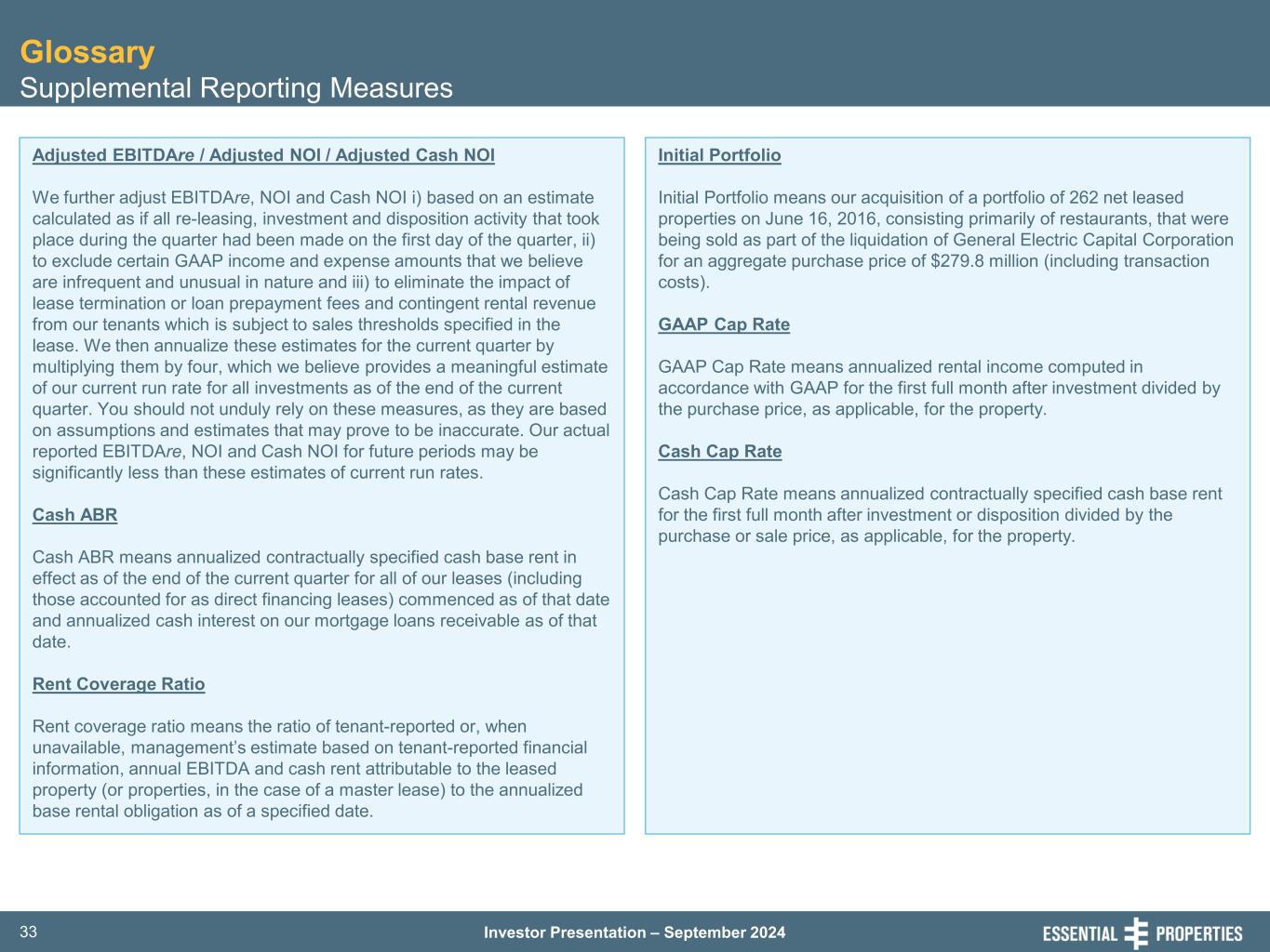 Investor Presentation – September 202432 Glossary Supplemental Reporting Measures We also present our earnings before interest, taxes and depreciation and amortization for real estate (“EBITDA”), EBITDA further adjusted to exclude gains (or losses) on sales of depreciable property and real estate impairment losses (“EBITDAre”), net debt, net operating income (“NOI”) and cash NOI (“Cash NOI”), all of which are non-GAAP financial measures. We believe these non-GAAP financial measures are accepted industry measures used by analysts and investors to compare the operating performance of REITs. EBITDA and EBITDAre We compute EBITDA as earnings before interest, income taxes and depreciation and amortization. In 2017, NAREIT issued a white paper recommending that companies that report EBITDA also report EBITDAre. We compute EBITDAre in accordance with the definition adopted by NAREIT. NAREIT defines EBITDAre as EBITDA (as defined above) excluding gains (or losses) from the sales of depreciable property and real estate impairment losses. We present EBITDA and EBITDAre as they are measures commonly used in our industry and we believe that these measures are useful to investors and analysts because they provide important supplemental information concerning our operating performance, exclusive of certain non-cash and other costs. We use EBITDA and EBITDAre as measures of our operating performance and not as measures of liquidity. EBITDA and EBITDAre do not include all items of revenue and expense included in net income, they do not represent cash generated from operating activities and they are not necessarily indicative of cash available to fund cash requirements; accordingly, the should not be considered alternatives to net income as a performance measure or cash flows from operations as a liquidity measure and should be considered in addition to, and not in lieu of, GAAP financial measures. Additionally, our computation of EBITDA and EBITDAre may differ from the methodology for calculating these metrics used by other equity REITs and, therefore, may not be comparable to similarly titled measures reported by other equity REITs. Net Debt We calculate our net debt as our gross debt (defined as total debt plus net deferred financing costs on our secured borrowings) less cash and cash equivalents and restricted cash available for future investment. We believe excluding cash and cash equivalents and restricted cash available for future investment, all of which could be used to repay debt, provides an estimate of the net contractual amount of borrowed capital to be repaid, which we believe is a beneficial disclosure to investors and analysts. NOI and Cash NOI We compute NOI as total revenues less property expenses. NOI excludes all other items of expense and income included in the financial statements in calculating net income or loss. Cash NOI further excludes non-cash items included in total revenues and property expenses, such as straight- line rental revenue and other amortization and non-cash charges. We believe NOI and Cash NOI provide useful and relevant information because they reflect only those income and expense items that are incurred at the property level and present such items on an unlevered basis. NOI and Cash NOI are not measurements of financial performance under GAAP. You should not consider our NOI and Cash NOI as alternatives to net income or cash flows from operating activities determined in accordance with GAAP. Additionally, our computation of NOI and Cash NOI may differ from the methodology for calculating these metrics used by other equity REITs and, therefore, may not be comparable to similarly titled measures reported by other equity REITs.