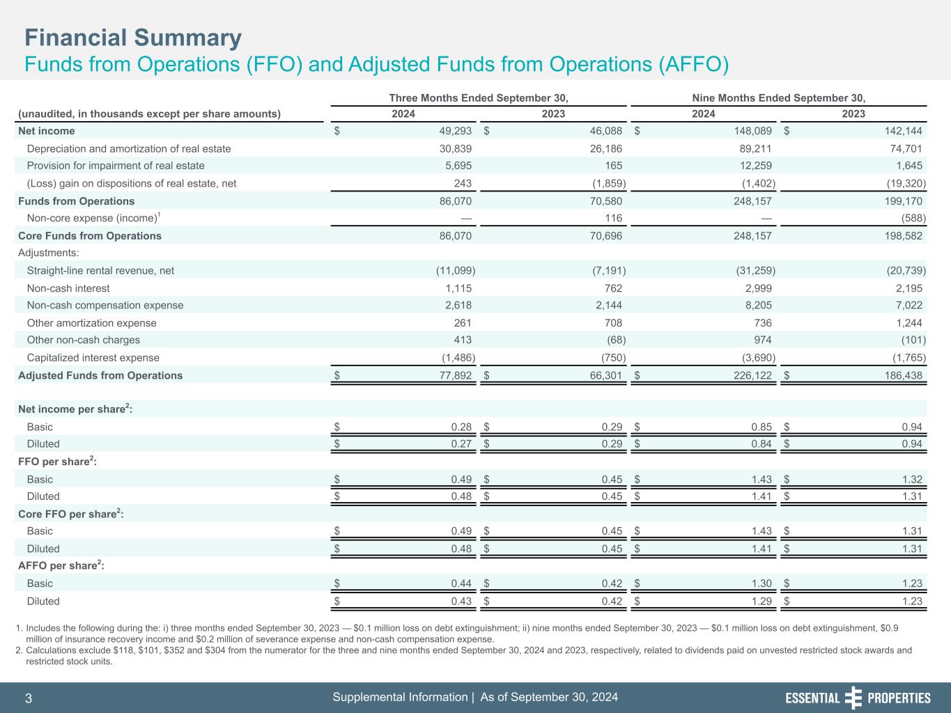 Supplemental Information | As of September 30, 20243 254, 192, 59 75, 108, 127 146, 204, 238 0, 0, 0 38, 169, 224 153, 223, 227 1. Includes the following during the: i) three months ended September 30, 2023 — $0.1 million loss on debt extinguishment; ii) nine months ended September 30, 2023 — $0.1 million loss on debt extinguishment, $0.9 million of insurance recovery income and $0.2 million of severance expense and non-cash compensation expense. 2. Calculations exclude $118, $101, $352 and $304 from the numerator for the three and nine months ended September 30, 2024 and 2023, respectively, related to dividends paid on unvested restricted stock awards and restricted stock units. Financial Summary Funds from Operations (FFO) and Adjusted Funds from Operations (AFFO) 242, 242, 242 Three Months Ended September 30, Nine Months Ended September 30, (unaudited, in thousands except per share amounts) 2024 2023 2024 2023 Net income $ 49,293 $ 46,088 $ 148,089 $ 142,144 Depreciation and amortization of real estate 30,839 26,186 89,211 74,701 Provision for impairment of real estate 5,695 165 12,259 1,645 (Loss) gain on dispositions of real estate, net 243 (1,859) (1,402) (19,320) Funds from Operations 86,070 70,580 248,157 199,170 Non-core expense (income)1 — 116 — (588) Core Funds from Operations 86,070 70,696 248,157 198,582 Adjustments: Straight-line rental revenue, net (11,099) (7,191) (31,259) (20,739) Non-cash interest 1,115 762 2,999 2,195 Non-cash compensation expense 2,618 2,144 8,205 7,022 Other amortization expense 261 708 736 1,244 Other non-cash charges 413 (68) 974 (101) Capitalized interest expense (1,486) (750) (3,690) (1,765) Adjusted Funds from Operations $ 77,892 $ 66,301 $ 226,122 $ 186,438 Net income per share2: Basic $ 0.28 $ 0.29 $ 0.85 $ 0.94 Diluted $ 0.27 $ 0.29 $ 0.84 $ 0.94 FFO per share2: Basic $ 0.49 $ 0.45 $ 1.43 $ 1.32 Diluted $ 0.48 $ 0.45 $ 1.41 $ 1.31 Core FFO per share2: Basic $ 0.49 $ 0.45 $ 1.43 $ 1.31 Diluted $ 0.48 $ 0.45 $ 1.41 $ 1.31 AFFO per share2: Basic $ 0.44 $ 0.42 $ 1.30 $ 1.23 Diluted $ 0.43 $ 0.42 $ 1.29 $ 1.23
