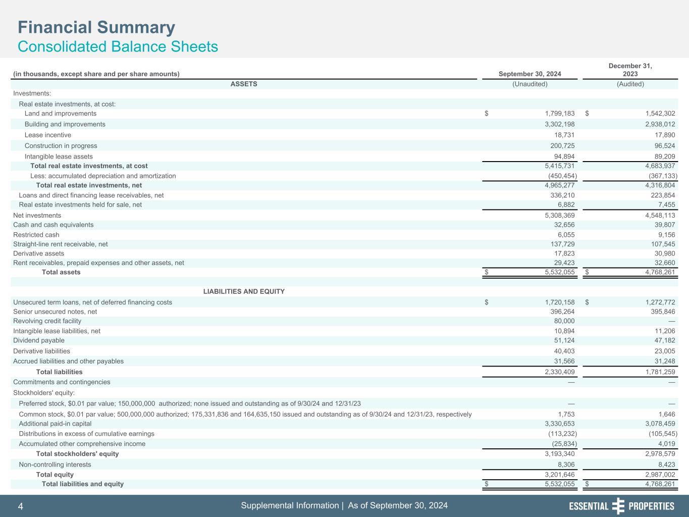 Supplemental Information | As of September 30, 20244 254, 192, 59 75, 108, 127 146, 204, 238 0, 0, 0 38, 169, 224 153, 223, 227 Financial Summary Consolidated Balance Sheets 242, 242, 242 (in thousands, except share and per share amounts) September 30, 2024 December 31, 2023 ASSETS (Unaudited) (Audited) Investments: Real estate investments, at cost: Land and improvements $ 1,799,183 $ 1,542,302 Building and improvements 3,302,198 2,938,012 Lease incentive 18,731 17,890 Construction in progress 200,725 96,524 Intangible lease assets 94,894 89,209 Total real estate investments, at cost 5,415,731 4,683,937 Less: accumulated depreciation and amortization (450,454) (367,133) Total real estate investments, net 4,965,277 4,316,804 Loans and direct financing lease receivables, net 336,210 223,854 Real estate investments held for sale, net 6,882 7,455 Net investments 5,308,369 4,548,113 Cash and cash equivalents 32,656 39,807 Restricted cash 6,055 9,156 Straight-line rent receivable, net 137,729 107,545 Derivative assets 17,823 30,980 Rent receivables, prepaid expenses and other assets, net 29,423 32,660 Total assets $ 5,532,055 $ 4,768,261 LIABILITIES AND EQUITY Unsecured term loans, net of deferred financing costs $ 1,720,158 $ 1,272,772 Senior unsecured notes, net 396,264 395,846 Revolving credit facility 80,000 — Intangible lease liabilities, net 10,894 11,206 Dividend payable 51,124 47,182 Derivative liabilities 40,403 23,005 Accrued liabilities and other payables 31,566 31,248 Total liabilities 2,330,409 1,781,259 Commitments and contingencies — — Stockholders' equity: Preferred stock, $0.01 par value; 150,000,000 authorized; none issued and outstanding as of 9/30/24 and 12/31/23 — — Common stock, $0.01 par value; 500,000,000 authorized; 175,331,836 and 164,635,150 issued and outstanding as of 9/30/24 and 12/31/23, respectively 1,753 1,646 Additional paid-in capital 3,330,653 3,078,459 Distributions in excess of cumulative earnings (113,232) (105,545) Accumulated other comprehensive income (25,834) 4,019 Total stockholders' equity 3,193,340 2,978,579 Non-controlling interests 8,306 8,423 Total equity 3,201,646 2,987,002 Total liabilities and equity $ 5,532,055 $ 4,768,261