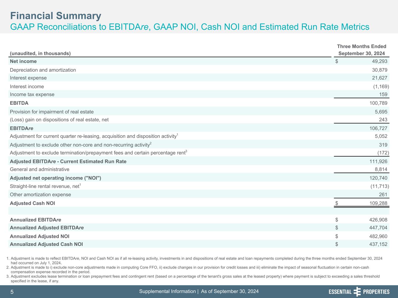 Supplemental Information | As of September 30, 20245 254, 192, 59 75, 108, 127 146, 204, 238 0, 0, 0 38, 169, 224 153, 223, 227 Financial Summary GAAP Reconciliations to EBITDAre, GAAP NOI, Cash NOI and Estimated Run Rate Metrics 242, 242, 242 1. Adjustment is made to reflect EBITDAre, NOI and Cash NOI as if all re-leasing activity, investments in and dispositions of real estate and loan repayments completed during the three months ended September 30, 2024 had occurred on July 1, 2024. 2. Adjustment is made to i) exclude non-core adjustments made in computing Core FFO, ii) exclude changes in our provision for credit losses and iii) eliminate the impact of seasonal fluctuation in certain non-cash compensation expense recorded in the period. 3. Adjustment excludes lease termination or loan prepayment fees and contingent rent (based on a percentage of the tenant's gross sales at the leased property) where payment is subject to exceeding a sales threshold specified in the lease, if any. Three Months Ended (unaudited, in thousands) September 30, 2024 Net income $ 49,293 Depreciation and amortization 30,879 Interest expense 21,627 Interest income (1,169) Income tax expense 159 EBITDA 100,789 Provision for impairment of real estate 5,695 (Loss) gain on dispositions of real estate, net 243 EBITDAre 106,727 Adjustment for current quarter re-leasing, acquisition and disposition activity1 5,052 Adjustment to exclude other non-core and non-recurring activity2 319 Adjustment to exclude termination/prepayment fees and certain percentage rent3 (172) Adjusted EBITDAre - Current Estimated Run Rate 111,926 General and administrative 8,814 Adjusted net operating income ("NOI") 120,740 Straight-line rental revenue, net1 (11,713) Other amortization expense 261 Adjusted Cash NOI $ 109,288 Annualized EBITDAre $ 426,908 Annualized Adjusted EBITDAre $ 447,704 Annualized Adjusted NOI $ 482,960 Annualized Adjusted Cash NOI $ 437,152