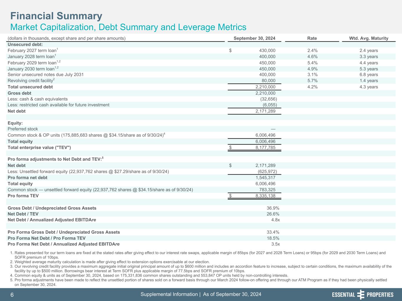 Supplemental Information | As of September 30, 20246 254, 192, 59 75, 108, 127 146, 204, 238 0, 0, 0 38, 169, 224 153, 223, 227 Financial Summary Market Capitalization, Debt Summary and Leverage Metrics 242, 242, 242 1. Rates presented for our term loans are fixed at the stated rates after giving effect to our interest rate swaps, applicable margin of 85bps (for 2027 and 2028 Term Loans) or 95bps (for 2029 and 2030 Term Loans) and SOFR premium of 10bps. 2. Weighted average maturity calculation is made after giving effect to extension options exercisable at our election. 3. Our revolving credit facility provides a maximum aggregate initial original principal amount of up to $600 million and includes an accordion feature to increase, subject to certain conditions, the maximum availability of the facility by up to $500 million. Borrowings bear interest at Term SOFR plus applicable margin of 77.5bps and SOFR premium of 10bps. 4. Common equity & units as of September 30, 2024, based on 175,331,836 common shares outstanding and 553,847 OP units held by non-controlling interests. 5. Pro forma adjustments have been made to reflect the unsettled portion of shares sold on a forward basis through our March 2024 follow-on offering and through our ATM Program as if they had been physically settled on September 30, 2024. (dollars in thousands, except share and per share amounts) September 30, 2024 Rate Wtd. Avg. Maturity Unsecured debt: February 2027 term loan1 $ 430,000 2.4% 2.4 years January 2028 term loan1 400,000 4.6% 3.3 years February 2029 term loan1,2 450,000 5.4% 4.4 years January 2030 term loan1,2 450,000 4.9% 5.3 years Senior unsecured notes due July 2031 400,000 3.1% 6.8 years Revolving credit facility2 80,000 5.7% 1.4 years Total unsecured debt 2,210,000 4.2% 4.3 years Gross debt 2,210,000 Less: cash & cash equivalents (32,656) Less: restricted cash available for future investment (6,055) Net debt 2,171,289 Equity: Preferred stock — Common stock & OP units (175,885,683 shares @ $34.15/share as of 9/30/24)4 6,006,496 Total equity 6,006,496 Total enterprise value ("TEV") $ 8,177,785 Pro forma adjustments to Net Debt and TEV:5 Net debt $ 2,171,289 Less: Unsettled forward equity (22,937,762 shares @ $27.29/share as of 9/30/24) (625,972) Pro forma net debt 1,545,317 Total equity 6,006,496 Common stock — unsettled forward equity (22,937,762 shares @ $34.15/share as of 9/30/24) 783,325 Pro forma TEV $ 8,335,138 Gross Debt / Undepreciated Gross Assets 36.9% Net Debt / TEV 26.6% Net Debt / Annualized Adjusted EBITDAre 4.8x Pro Forma Gross Debt / Undepreciated Gross Assets 33.4% Pro Forma Net Debt / Pro Forma TEV 18.5% Pro Forma Net Debt / Annualized Adjusted EBITDAre 3.5x
