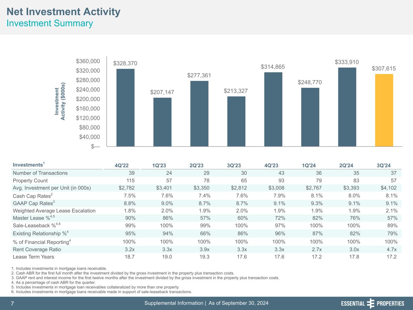 Supplemental Information | As of September 30, 20247 254, 192, 59 75, 108, 127 146, 204, 238 0, 0, 0 38, 169, 224 153, 223, 227 Net Investment Activity Investment Summary 242, 242, 242 1. Includes investments in mortgage loans receivable. 2. Cash ABR for the first full month after the investment divided by the gross investment in the property plus transaction costs. 3. GAAP rent and interest income for the first twelve months after the investment divided by the gross investment in the property plus transaction costs. 4. As a percentage of cash ABR for the quarter. 5. Includes investments in mortgage loan receivables collateralized by more than one property. 6. Includes investments in mortgage loans receivable made in support of sale-leaseback transactions. Investments1 4Q'22 1Q'23 2Q'23 3Q'23 4Q'23 1Q'24 2Q'24 3Q'24 Number of Transactions 39 24 29 30 43 36 35 37 Property Count 115 57 78 65 93 79 83 57 Avg. Investment per Unit (in 000s) $2,782 $3,401 $3,350 $2,812 $3,008 $2,767 $3,393 $4,102 Cash Cap Rates2 7.5 % 7.6 % 7.4 % 7.6 % 7.9 % 8.1 % 8.0 % 8.1 % GAAP Cap Rates3 8.8 % 9.0 % 8.7 % 8.7 % 9.1 % 9.3 % 9.1 % 9.1 % Weighted Average Lease Escalation 1.8 % 1.8 % 2.0 % 1.8 % 1.9 % 1.8 % 2.0 % 1.9 % 1.9 % 1.9 % 2.1 % Master Lease %4,5 90 % 86 % 57 % 60 % 72 % 82 % 76 % 57 % Sale-Leaseback %4,6 99 % 100 % 99 % 100 % 97 % 100 % 100 % 89 % Existing Relationship %4 95 % 94 % 66 % 86 % 96 % 87 % 82 % 79 % % of Financial Reporting4 100 % 100 % 100 % 100 % 100 % 100 % 100 % 100 % Rent Coverage Ratio 3.2x 3.3x 3.9x 3.3x 3.3x 2.7x 3.0x 4.7x Lease Term Years 18.7 19.0 19.3 17.6 17.6 17.2 17.8 17.2 $328,370 $207,147 $277,361 $213,327 $314,865 $248,770 $333,910 $307,615 $— $40,000 $80,000 $120,000 $160,000 $200,000 $240,000 $280,000 $320,000 $360,000 In ve st m en t A ct iv ity ($ 00 0s )