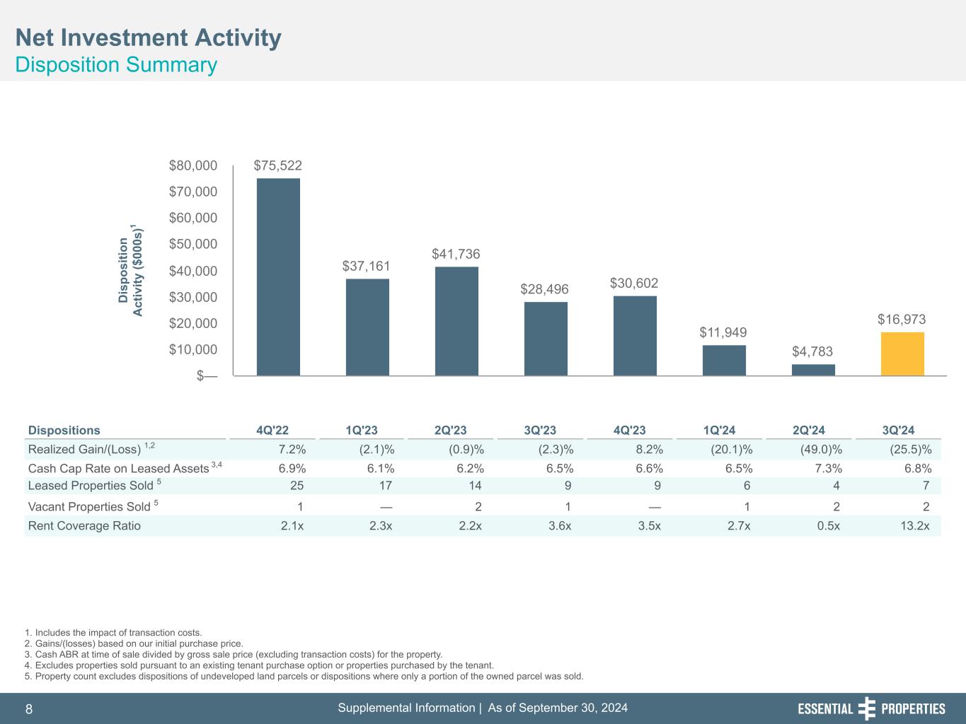 Supplemental Information | As of September 30, 20248 254, 192, 59 75, 108, 127 146, 204, 238 0, 0, 0 38, 169, 224 153, 223, 227 Net Investment Activity Disposition Summary 242, 242, 242 1. Includes the impact of transaction costs. 2. Gains/(losses) based on our initial purchase price. 3. Cash ABR at time of sale divided by gross sale price (excluding transaction costs) for the property. 4. Excludes properties sold pursuant to an existing tenant purchase option or properties purchased by the tenant. 5. Property count excludes dispositions of undeveloped land parcels or dispositions where only a portion of the owned parcel was sold. Dispositions 4Q'22 1Q'23 2Q'23 3Q'23 4Q'23 1Q'24 2Q'24 3Q'24 Realized Gain/(Loss) 1,2 7.2 % (2.1) % (0.9) % (2.3) % 8.2 % (20.1) % (49.0) % (25.5) % Cash Cap Rate on Leased Assets 3,4 6.9 % 6.1 % 6.2 % 6.5 % 6.6 % 6.5 % 7.3 % 6.8 % Leased Properties Sold 5 25 17 14 9 9 6 4 7 Vacant Properties Sold 5 1 — 2 1 — 1 2 2 Rent Coverage Ratio 2.1x 2.3x 2.2x 3.6x 3.5x 2.7x 0.5x 13.2x $75,522 $37,161 $41,736 $28,496 $30,602 $11,949 $4,783 $16,973 $— $10,000 $20,000 $30,000 $40,000 $50,000 $60,000 $70,000 $80,000 D is po si tio n A ct iv ity ($ 00 0s )1