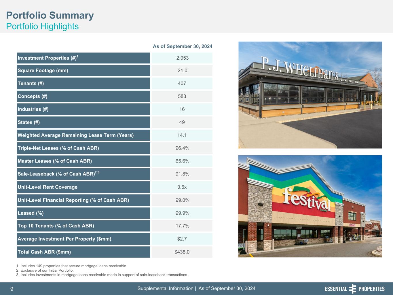 Supplemental Information | As of September 30, 20249 254, 192, 59 75, 108, 127 146, 204, 238 0, 0, 0 38, 169, 224 153, 223, 227 Portfolio Summary Portfolio Highlights 242, 242, 242 1. Includes 149 properties that secure mortgage loans receivable. 2. Exclusive of our Initial Portfolio. 3. Includes investments in mortgage loans receivable made in support of sale-leaseback transactions. As of September 30, 2024 Investment Properties (#)1 2,053 Square Footage (mm) 21.0 Tenants (#) 407 Concepts (#) 583 Industries (#) 16 States (#) 49 Weighted Average Remaining Lease Term (Years) 14.1 Triple-Net Leases (% of Cash ABR) 96.4% Master Leases (% of Cash ABR) 65.6% Sale-Leaseback (% of Cash ABR)2,3 91.8% Unit-Level Rent Coverage 3.6x Unit-Level Financial Reporting (% of Cash ABR) 99.0% Leased (%) 99.9% Top 10 Tenants (% of Cash ABR) 17.7% Average Investment Per Property ($mm) $2.7 Total Cash ABR ($mm) $438.0