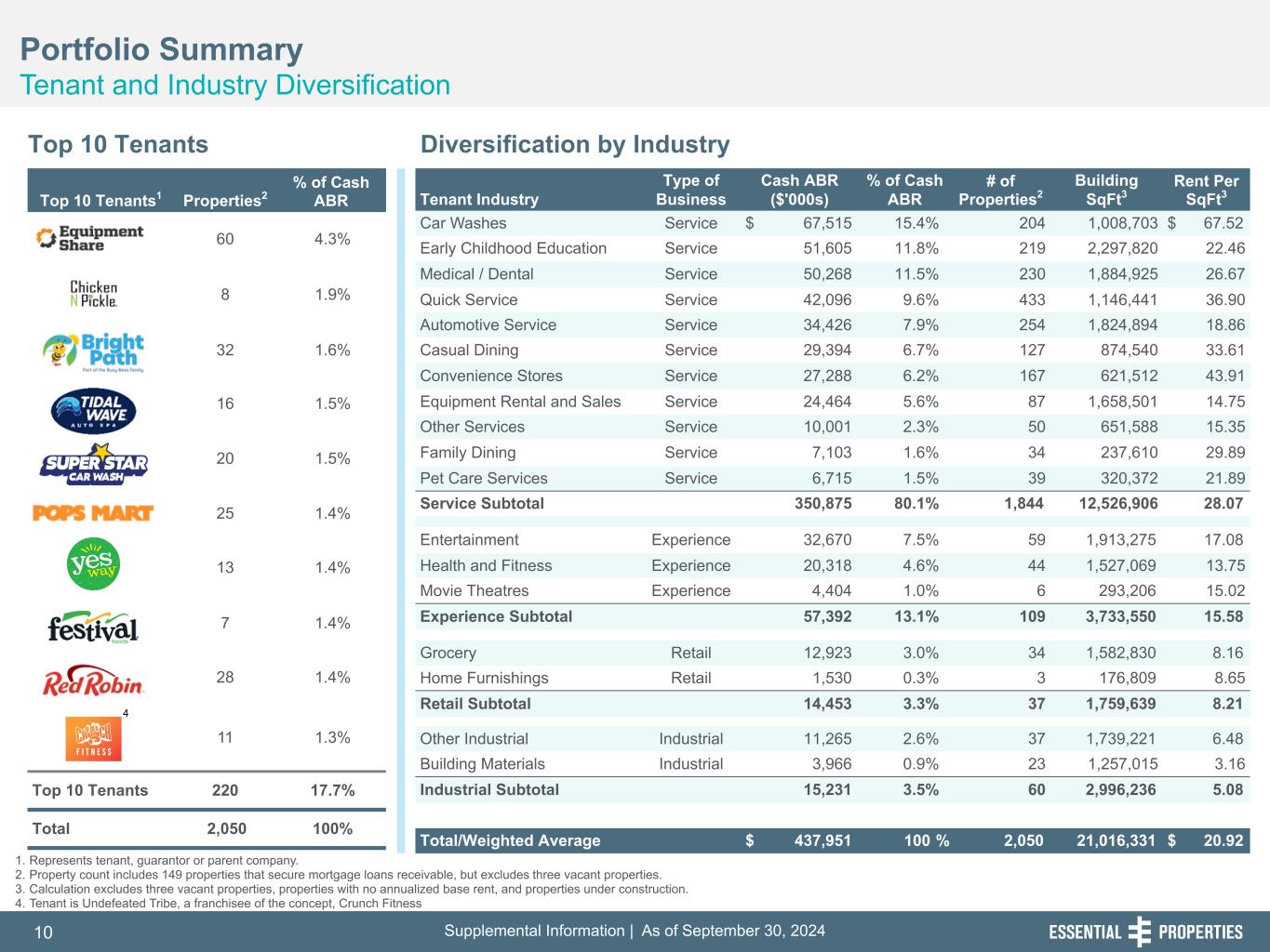Supplemental Information | As of September 30, 202410 254, 192, 59 75, 108, 127 146, 204, 238 0, 0, 0 38, 169, 224 153, 223, 227 Portfolio Summary Tenant and Industry Diversification 242, 242, 242 Top 10 Tenants Diversification by Industry 1. Represents tenant, guarantor or parent company. 2. Property count includes 149 properties that secure mortgage loans receivable, but excludes three vacant properties. 3. Calculation excludes three vacant properties, properties with no annualized base rent, and properties under construction. 4. Tenant is Undefeated Tribe, a franchisee of the concept, Crunch Fitness Tenant Industry Type of Business Cash ABR ($'000s) % of Cash ABR # of Properties2 Building SqFt3 Rent Per SqFt3 Car Washes Service $ 67,515 15.4 % 204 1,008,703 $ 67.52 Early Childhood Education Service 51,605 11.8 % 219 2,297,820 22.46 Medical / Dental Service 50,268 11.5 % 230 1,884,925 26.67 Quick Service Service 42,096 9.6 % 433 1,146,441 36.90 Automotive Service Service 34,426 7.9 % 254 1,824,894 18.86 Casual Dining Service 29,394 6.7 % 127 874,540 33.61 Convenience Stores Service 27,288 6.2 % 167 621,512 43.91 Equipment Rental and Sales Service 24,464 5.6 % 87 1,658,501 14.75 Other Services Service 10,001 2.3 % 50 651,588 15.35 Family Dining Service 7,103 1.6 % 34 237,610 29.89 Pet Care Services Service 6,715 1.5 % 39 320,372 21.89 Service Subtotal 350,875 80.1 % 1,844 12,526,906 28.07 Entertainment Experience 32,670 7.5 % 59 1,913,275 17.08 Health and Fitness Experience 20,318 4.6 % 44 1,527,069 13.75 Movie Theatres Experience 4,404 1.0 % 6 293,206 15.02 Experience Subtotal 57,392 13.1 % 109 3,733,550 15.58 Grocery Retail 12,923 3.0 % 34 1,582,830 8.16 Home Furnishings Retail 1,530 0.3 % 3 176,809 8.65 Retail Subtotal 14,453 3.3 % 37 1,759,639 8.21 Other Industrial Industrial 11,265 2.6 % 37 1,739,221 6.48 Building Materials Industrial 3,966 0.9 % 23 1,257,015 3.16 Industrial Subtotal 15,231 3.5 % 60 2,996,236 5.08 Total/Weighted Average $ 437,951 100 % 2,050 21,016,331 $ 20.92 Top 10 Tenants1 Properties2 % of Cash ABR 60 4.3% 8 1.9% 32 1.6% 16 1.5% 20 1.5% 25 1.4% 13 1.4% 7 1.4% 28 1.4% 11 1.3% Top 10 Tenants 220 17.7% Total 2,050 100% 4