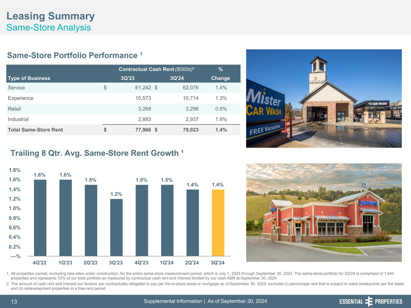 Supplemental Information | As of September 30, 202413 254, 192, 59 75, 108, 127 146, 204, 238 0, 0, 0 38, 169, 224 153, 223, 227 Leasing Summary Same-Store Analysis 242, 242, 242 Same-Store Portfolio Performance ¹ Contractual Cash Rent ($000s)² % Type of Business 3Q'23 3Q'24 Change Service $ 61,242 $ 62,076 1.4% Experience 10,573 10,714 1.3% Retail 3,268 3,296 0.8% Industrial 2,883 2,937 1.9% Total Same-Store Rent $ 77,966 $ 79,023 1.4% 1.6% 1.6% 1.5% 1.2% 1.5% 1.5% 1.4% 1.4% 4Q'22 1Q'23 2Q'23 3Q'23 4Q'23 1Q'24 2Q'24 3Q'24 —% 0.2% 0.4% 0.6% 0.8% 1.0% 1.2% 1.4% 1.6% 1.8% Trailing 8 Qtr. Avg. Same-Store Rent Growth ¹ 1. All properties owned, excluding new sites under construction, for the entire same-store measurement period, which is July 1, 2023 through September 30, 2024. The same-store portfolio for 3Q'24 is comprised of 1,644 properties and represents 72% of our total portfolio as measured by contractual cash rent and interest divided by our cash ABR at September 30, 2024. 2. The amount of cash rent and interest our tenants are contractually obligated to pay per the in-place lease or mortgage as of September 30, 2024; excludes (i) percentage rent that is subject to sales breakpoints per the lease and (ii) redevelopment properties in a free rent period
