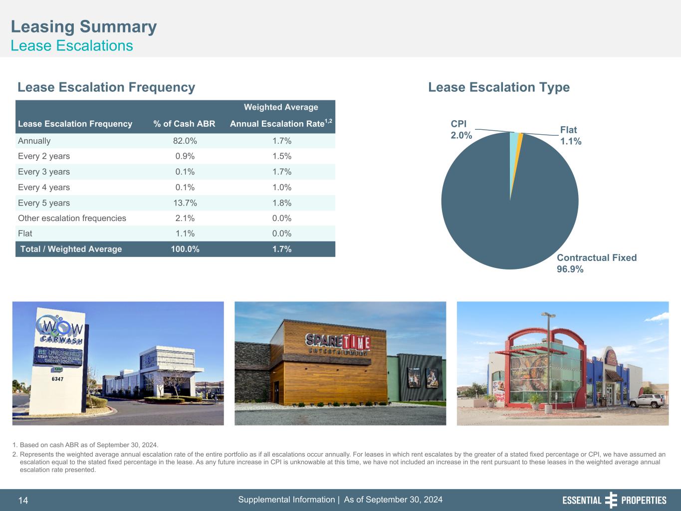 Supplemental Information | As of September 30, 202414 254, 192, 59 75, 108, 127 146, 204, 238 0, 0, 0 38, 169, 224 153, 223, 227 Leasing Summary Lease Escalations 242, 242, 242 1. Based on cash ABR as of September 30, 2024. 2. Represents the weighted average annual escalation rate of the entire portfolio as if all escalations occur annually. For leases in which rent escalates by the greater of a stated fixed percentage or CPI, we have assumed an escalation equal to the stated fixed percentage in the lease. As any future increase in CPI is unknowable at this time, we have not included an increase in the rent pursuant to these leases in the weighted average annual escalation rate presented. Lease Escalation Frequency Lease Escalation Type Weighted Average Lease Escalation Frequency % of Cash ABR Annual Escalation Rate1,2 Annually 82.0% 1.7% Every 2 years 0.9% 1.5% Every 3 years 0.1% 1.7% Every 4 years 0.1% 1.0% Every 5 years 13.7% 1.8% Other escalation frequencies 2.1% 0.0% Flat 1.1% 0.0% Total / Weighted Average 100.0% 1.7% CPI 2.0% Flat 1.1% Contractual Fixed 96.9%