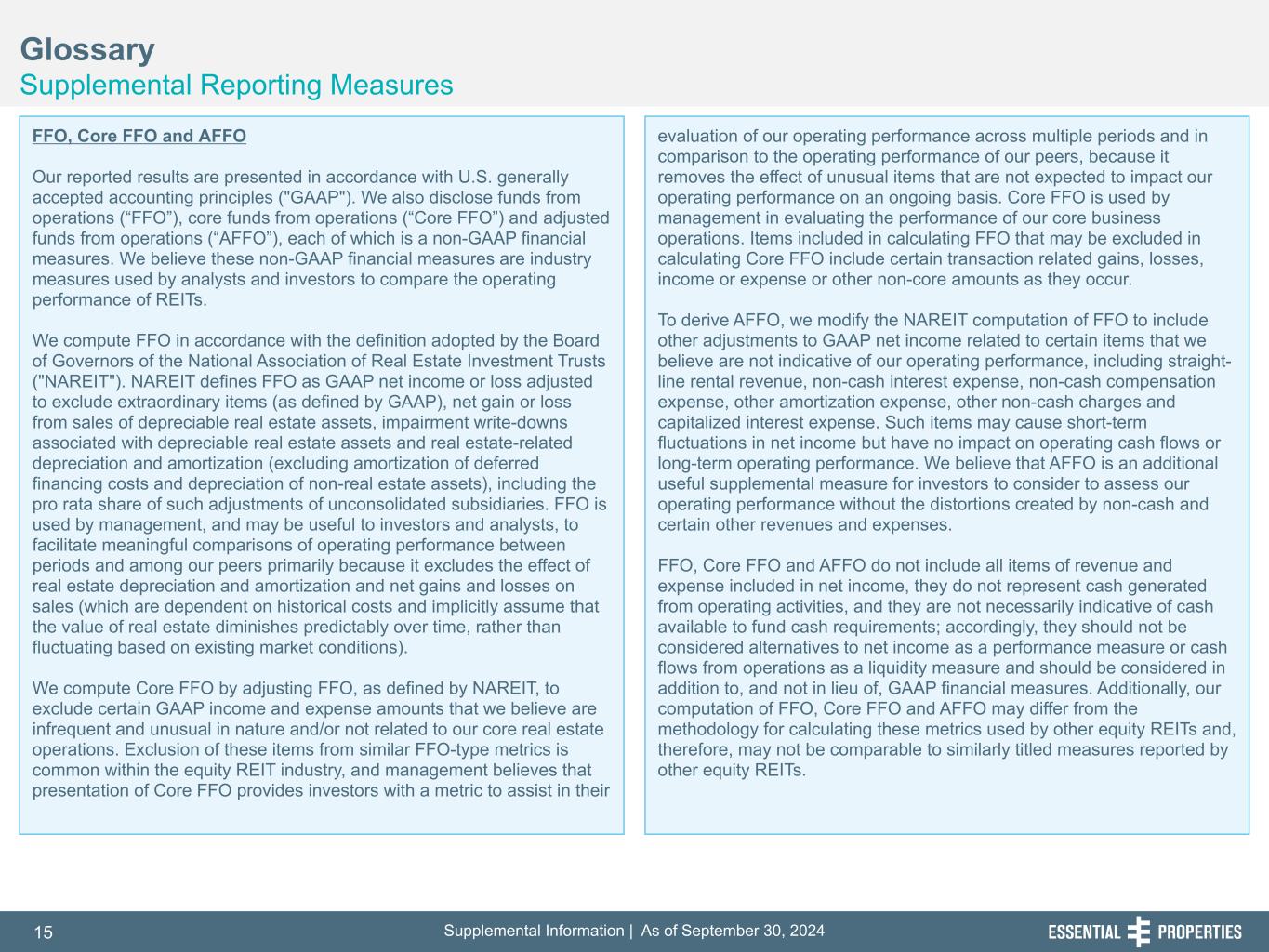 Supplemental Information | As of September 30, 202415 254, 192, 59 75, 108, 127 146, 204, 238 0, 0, 0 38, 169, 224 153, 223, 227 Glossary Supplemental Reporting Measures 242, 242, 242 FFO, Core FFO and AFFO Our reported results are presented in accordance with U.S. generally accepted accounting principles ("GAAP"). We also disclose funds from operations (“FFO”), core funds from operations (“Core FFO”) and adjusted funds from operations (“AFFO”), each of which is a non-GAAP financial measures. We believe these non-GAAP financial measures are industry measures used by analysts and investors to compare the operating performance of REITs. We compute FFO in accordance with the definition adopted by the Board of Governors of the National Association of Real Estate Investment Trusts ("NAREIT"). NAREIT defines FFO as GAAP net income or loss adjusted to exclude extraordinary items (as defined by GAAP), net gain or loss from sales of depreciable real estate assets, impairment write-downs associated with depreciable real estate assets and real estate-related depreciation and amortization (excluding amortization of deferred financing costs and depreciation of non-real estate assets), including the pro rata share of such adjustments of unconsolidated subsidiaries. FFO is used by management, and may be useful to investors and analysts, to facilitate meaningful comparisons of operating performance between periods and among our peers primarily because it excludes the effect of real estate depreciation and amortization and net gains and losses on sales (which are dependent on historical costs and implicitly assume that the value of real estate diminishes predictably over time, rather than fluctuating based on existing market conditions). We compute Core FFO by adjusting FFO, as defined by NAREIT, to exclude certain GAAP income and expense amounts that we believe are infrequent and unusual in nature and/or not related to our core real estate operations. Exclusion of these items from similar FFO-type metrics is common within the equity REIT industry, and management believes that presentation of Core FFO provides investors with a metric to assist in their evaluation of our operating performance across multiple periods and in comparison to the operating performance of our peers, because it removes the effect of unusual items that are not expected to impact our operating performance on an ongoing basis. Core FFO is used by management in evaluating the performance of our core business operations. Items included in calculating FFO that may be excluded in calculating Core FFO include certain transaction related gains, losses, income or expense or other non-core amounts as they occur. To derive AFFO, we modify the NAREIT computation of FFO to include other adjustments to GAAP net income related to certain items that we believe are not indicative of our operating performance, including straight- line rental revenue, non-cash interest expense, non-cash compensation expense, other amortization expense, other non-cash charges and capitalized interest expense. Such items may cause short-term fluctuations in net income but have no impact on operating cash flows or long-term operating performance. We believe that AFFO is an additional useful supplemental measure for investors to consider to assess our operating performance without the distortions created by non-cash and certain other revenues and expenses. FFO, Core FFO and AFFO do not include all items of revenue and expense included in net income, they do not represent cash generated from operating activities, and they are not necessarily indicative of cash available to fund cash requirements; accordingly, they should not be considered alternatives to net income as a performance measure or cash flows from operations as a liquidity measure and should be considered in addition to, and not in lieu of, GAAP financial measures. Additionally, our computation of FFO, Core FFO and AFFO may differ from the methodology for calculating these metrics used by other equity REITs and, therefore, may not be comparable to similarly titled measures reported by other equity REITs.