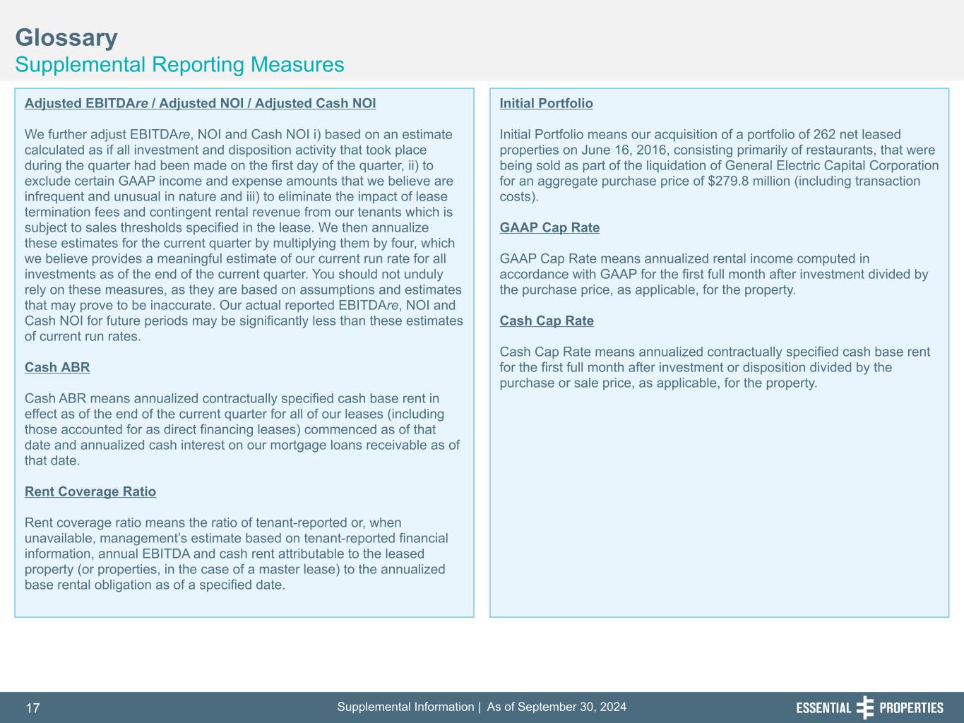 Supplemental Information | As of September 30, 202417 254, 192, 59 75, 108, 127 146, 204, 238 0, 0, 0 38, 169, 224 153, 223, 227 Glossary Supplemental Reporting Measures 242, 242, 242 Adjusted EBITDAre / Adjusted NOI / Adjusted Cash NOI We further adjust EBITDAre, NOI and Cash NOI i) based on an estimate calculated as if all investment and disposition activity that took place during the quarter had been made on the first day of the quarter, ii) to exclude certain GAAP income and expense amounts that we believe are infrequent and unusual in nature and iii) to eliminate the impact of lease termination fees and contingent rental revenue from our tenants which is subject to sales thresholds specified in the lease. We then annualize these estimates for the current quarter by multiplying them by four, which we believe provides a meaningful estimate of our current run rate for all investments as of the end of the current quarter. You should not unduly rely on these measures, as they are based on assumptions and estimates that may prove to be inaccurate. Our actual reported EBITDAre, NOI and Cash NOI for future periods may be significantly less than these estimates of current run rates. Cash ABR Cash ABR means annualized contractually specified cash base rent in effect as of the end of the current quarter for all of our leases (including those accounted for as direct financing leases) commenced as of that date and annualized cash interest on our mortgage loans receivable as of that date. Rent Coverage Ratio Rent coverage ratio means the ratio of tenant-reported or, when unavailable, management’s estimate based on tenant-reported financial information, annual EBITDA and cash rent attributable to the leased property (or properties, in the case of a master lease) to the annualized base rental obligation as of a specified date. Initial Portfolio Initial Portfolio means our acquisition of a portfolio of 262 net leased properties on June 16, 2016, consisting primarily of restaurants, that were being sold as part of the liquidation of General Electric Capital Corporation for an aggregate purchase price of $279.8 million (including transaction costs). GAAP Cap Rate GAAP Cap Rate means annualized rental income computed in accordance with GAAP for the first full month after investment divided by the purchase price, as applicable, for the property. Cash Cap Rate Cash Cap Rate means annualized contractually specified cash base rent for the first full month after investment or disposition divided by the purchase or sale price, as applicable, for the property.