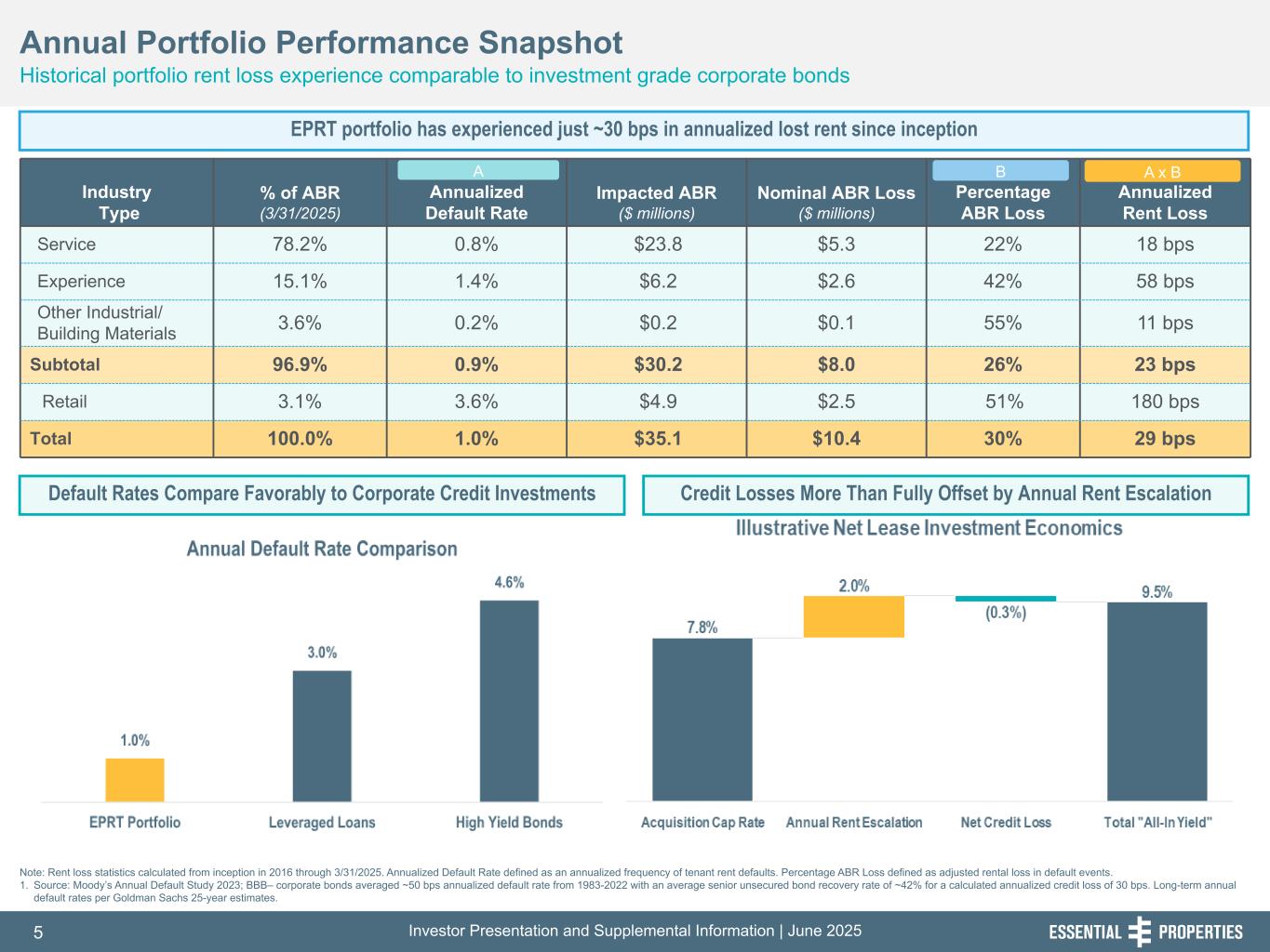 Investor Presentation and Supplemental Information | June 20255 254, 192, 59 75, 108, 127 146, 204, 238 0, 0, 0 38, 169, 224 153, 223, 227 EPRT portfolio has experienced just ~30 bps in annualized lost rent since inception Industry Type % of ABR (3/31/2025) Annualized Default Rate Impacted ABR ($ millions) Nominal ABR Loss ($ millions) Percentage ABR Loss Annualized Rent Loss Service 78.2% 0.8% $23.8 $5.3 22% 18 bps Experience 15.1% 1.4% $6.2 $2.6 42% 58 bps Other Industrial/ Building Materials 3.6% 0.2% $0.2 $0.1 55% 11 bps Subtotal 96.9% 0.9% $30.2 $8.0 26% 23 bps Retail 3.1% 3.6% $4.9 $2.5 51% 180 bps Total 100.0% 1.0% $35.1 $10.4 30% 29 bps Note: Rent loss statistics calculated from inception in 2016 through 3/31/2025. Annualized Default Rate defined as an annualized frequency of tenant rent defaults. Percentage ABR Loss defined as adjusted rental loss in default events. 1. Source: Moody’s Annual Default Study 2023; BBB– corporate bonds averaged ~50 bps annualized default rate from 1983-2022 with an average senior unsecured bond recovery rate of ~42% for a calculated annualized credit loss of 30 bps. Long-term annual default rates per Goldman Sachs 25-year estimates. A x BA B Credit Losses More Than Fully Offset by Annual Rent EscalationDefault Rates Compare Favorably to Corporate Credit Investments Annual Portfolio Performance Snapshot Historical portfolio rent loss experience comparable to investment grade corporate bonds