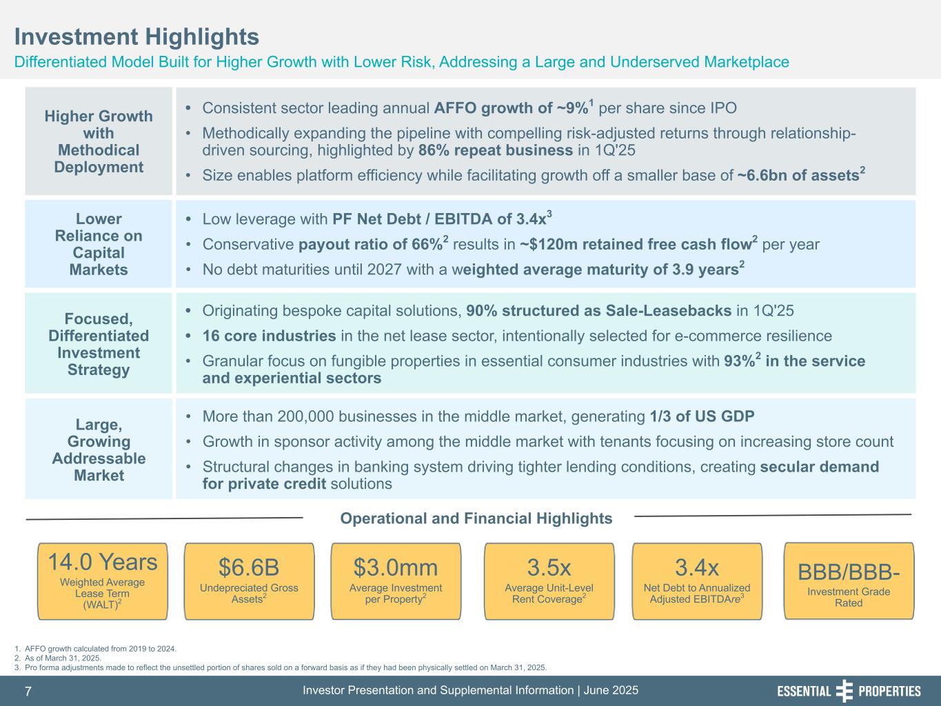 Investor Presentation and Supplemental Information | June 20257 254, 192, 59 75, 108, 127 146, 204, 238 0, 0, 0 38, 169, 224 153, 223, 227 BBB/BBB- Investment Grade Rated • Originating bespoke capital solutions, 90% structured as Sale-Leasebacks in 1Q'25 • 16 core industries in the net lease sector, intentionally selected for e-commerce resilience • Granular focus on fungible properties in essential consumer industries with 93%2 in the service and experiential sectors Investment Highlights Differentiated Model Built for Higher Growth with Lower Risk, Addressing a Large and Underserved Marketplace 242, 242, 242 14.0 Years Weighted Average Lease Term (WALT)2 3.5x Average Unit-Level Rent Coverage2 $3.0mm Average Investment per Property2 3.4x Net Debt to Annualized Adjusted EBITDAre3 $6.6B Undepreciated Gross Assets2 Higher Growth with Methodical Deployment • Consistent sector leading annual AFFO growth of ~9%1 per share since IPO • Methodically expanding the pipeline with compelling risk-adjusted returns through relationship- driven sourcing, highlighted by 86% repeat business in 1Q'25 • Size enables platform efficiency while facilitating growth off a smaller base of ~6.6bn of assets2 Lower Reliance on Capital Markets • Low leverage with PF Net Debt / EBITDA of 3.4x3 • Conservative payout ratio of 66%2 results in ~$120m retained free cash flow2 per year • No debt maturities until 2027 with a weighted average maturity of 3.9 years2 Focused, Differentiated Investment Strategy Large, Growing Addressable Market • More than 200,000 businesses in the middle market, generating 1/3 of US GDP • Growth in sponsor activity among the middle market with tenants focusing on increasing store count • Structural changes in banking system driving tighter lending conditions, creating secular demand for private credit solutions Operational and Financial Highlights 1. AFFO growth calculated from 2019 to 2024. 2. As of March 31, 2025. 3. Pro forma adjustments made to reflect the unsettled portion of shares sold on a forward basis as if they had been physically settled on March 31, 2025.